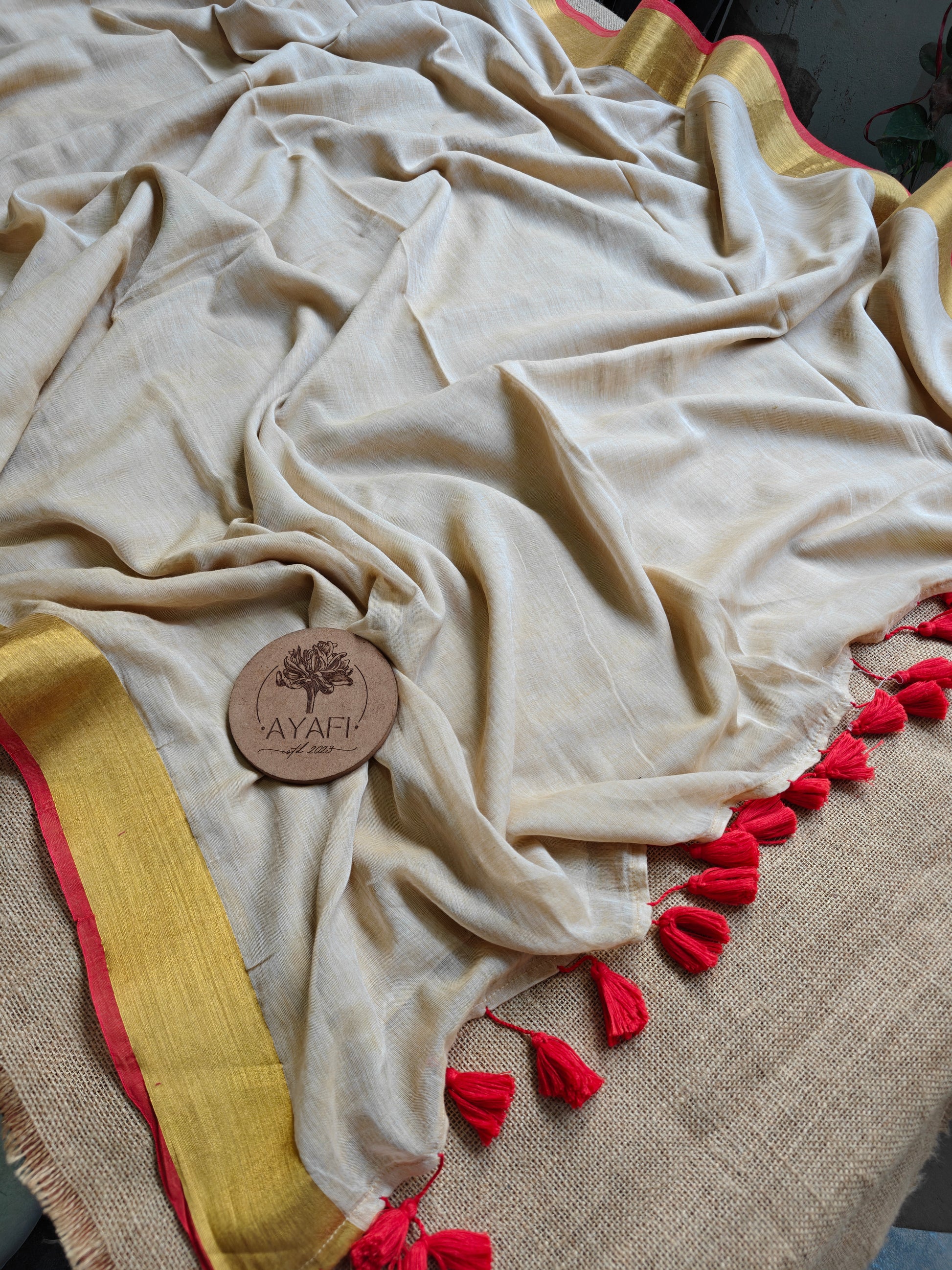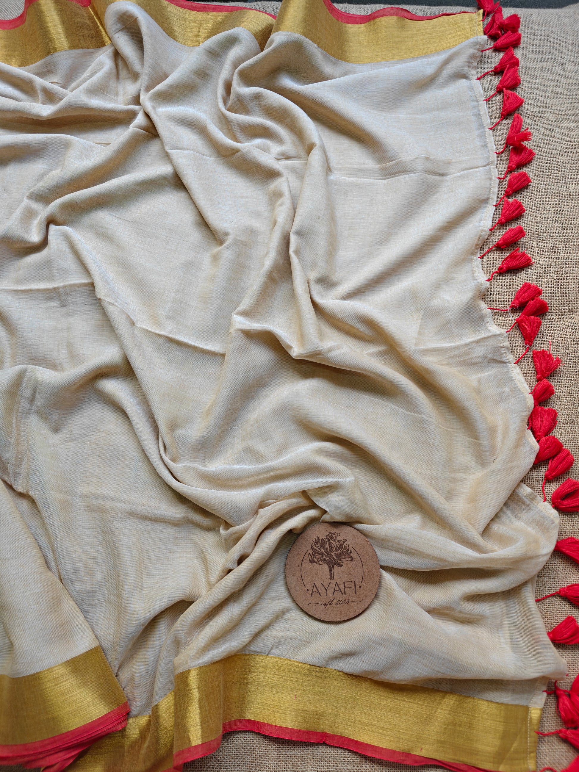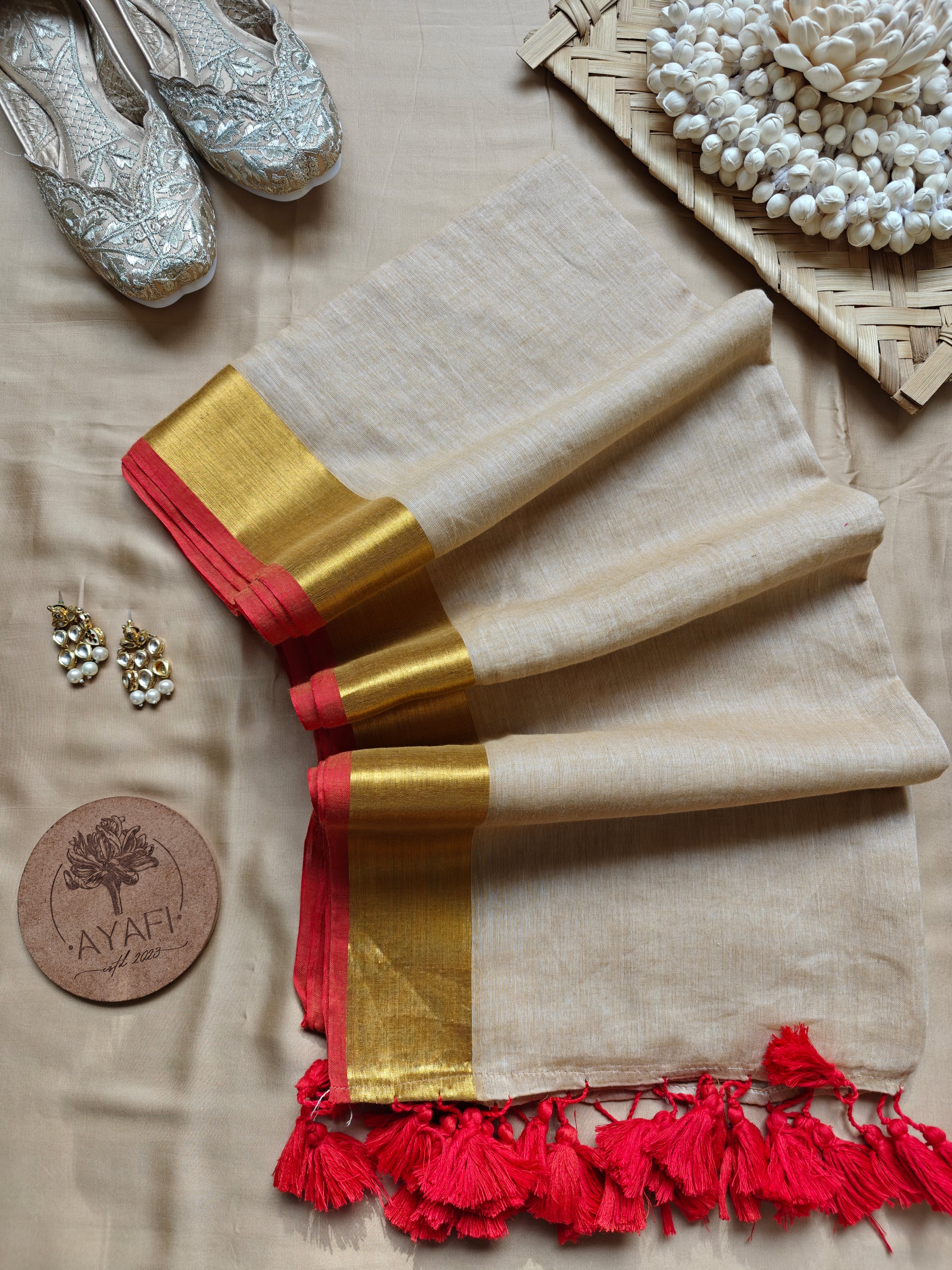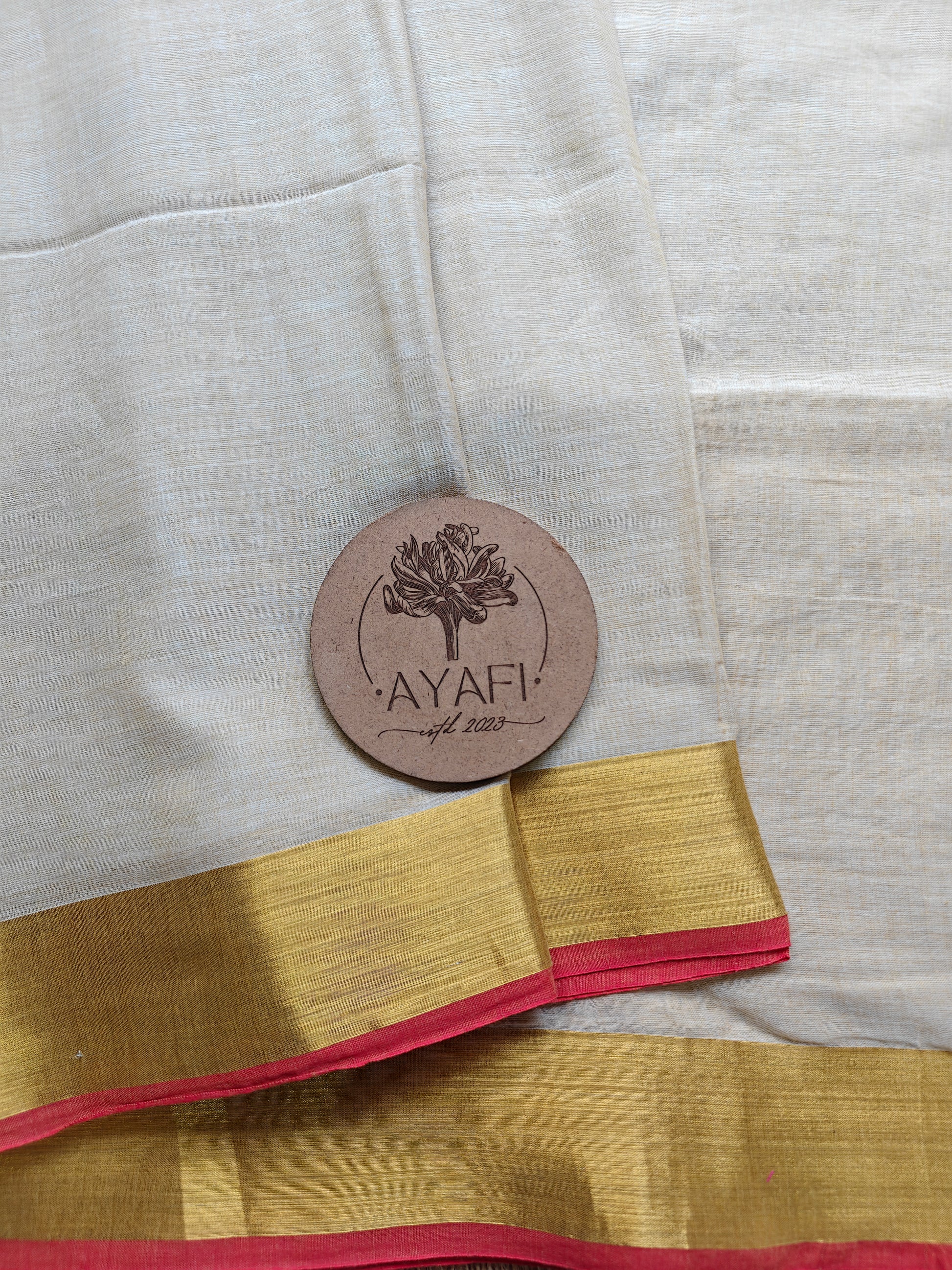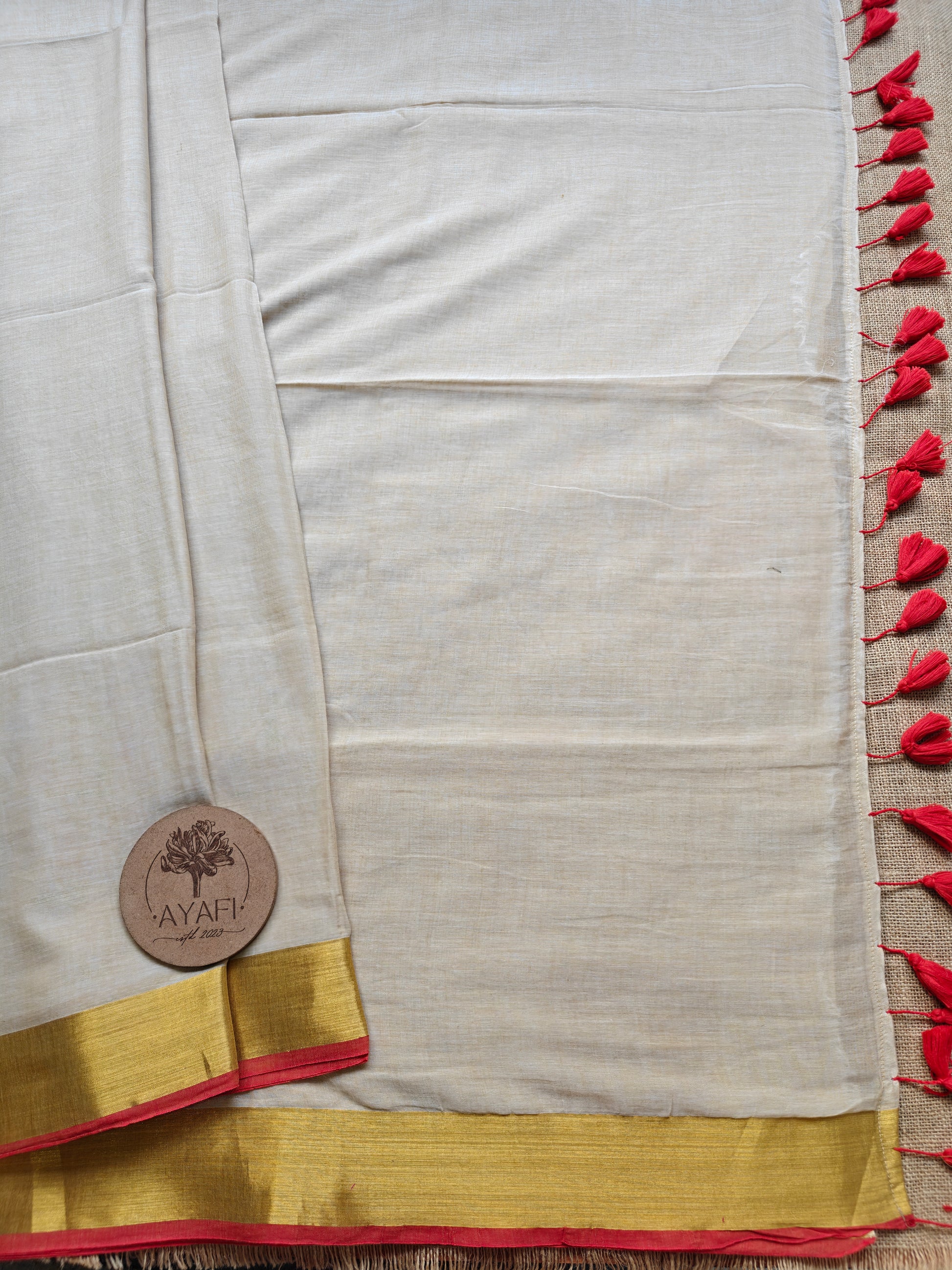 This saree is elevated with a traditional gold zari border, finished with a bold red edging and handcrafted tassels that add just the right hint of festive charm. Rooted in South Indian aesthetics, this saree is perfect for women who appreciate minimal elegance with cultural depth.
