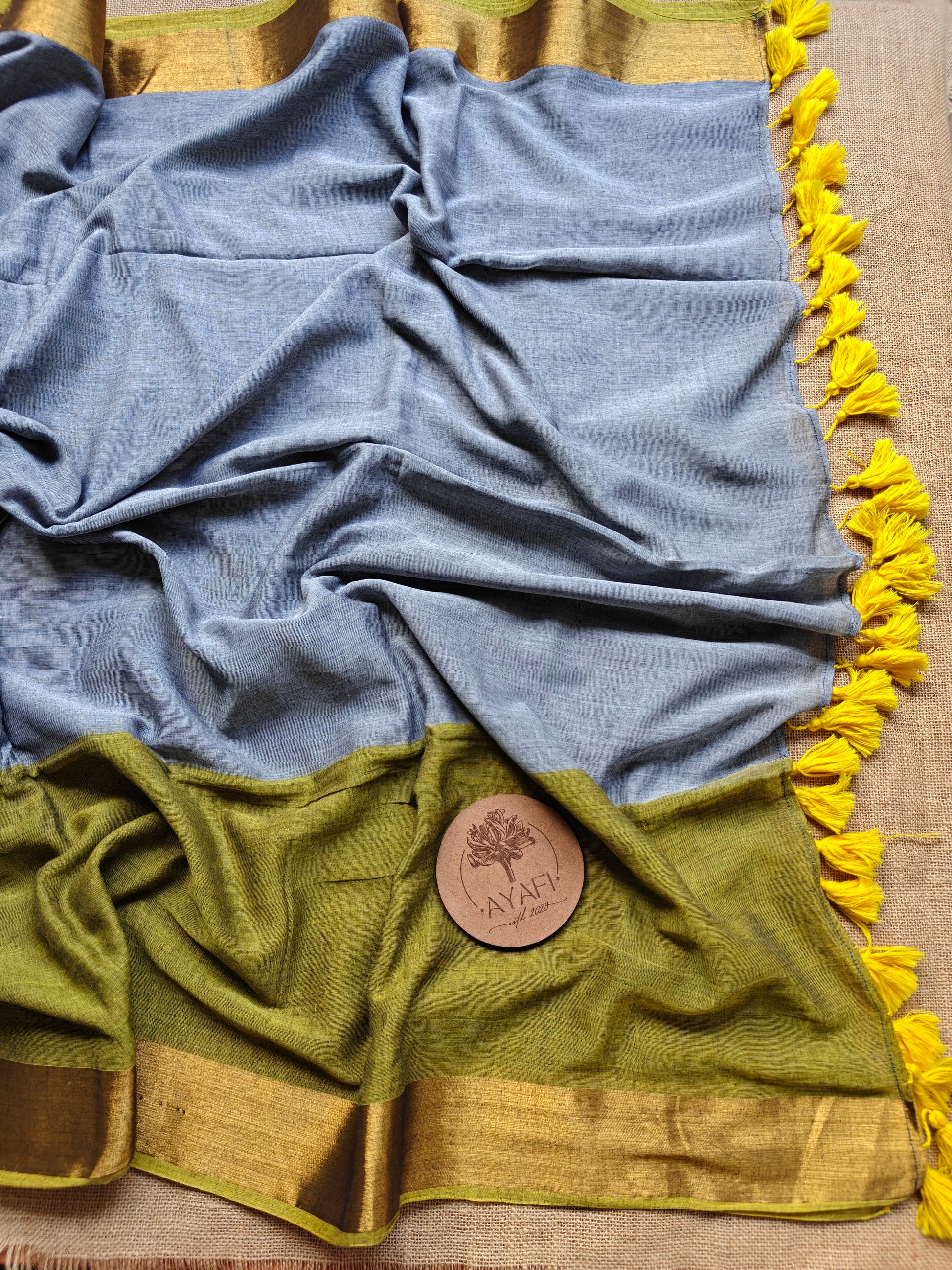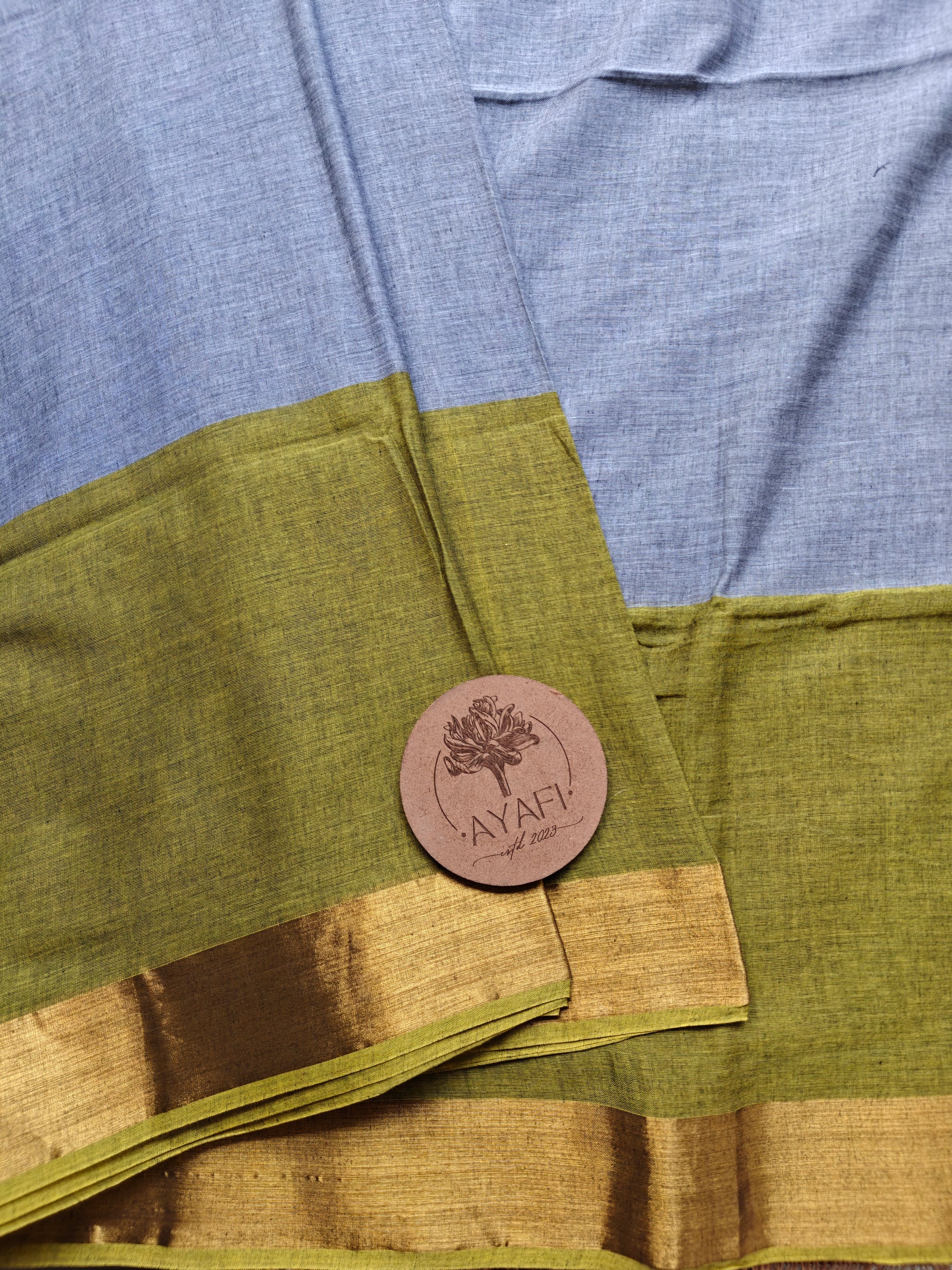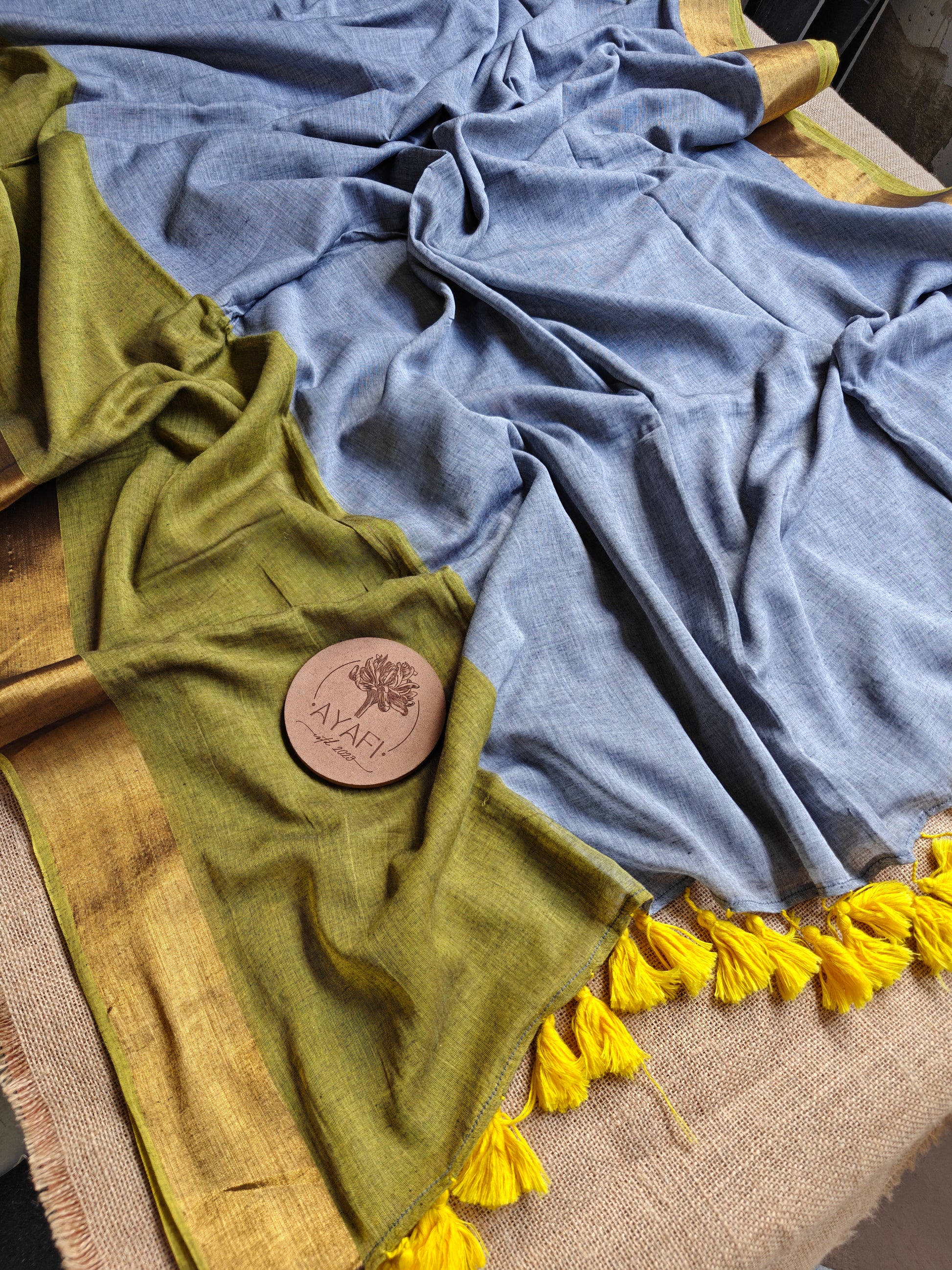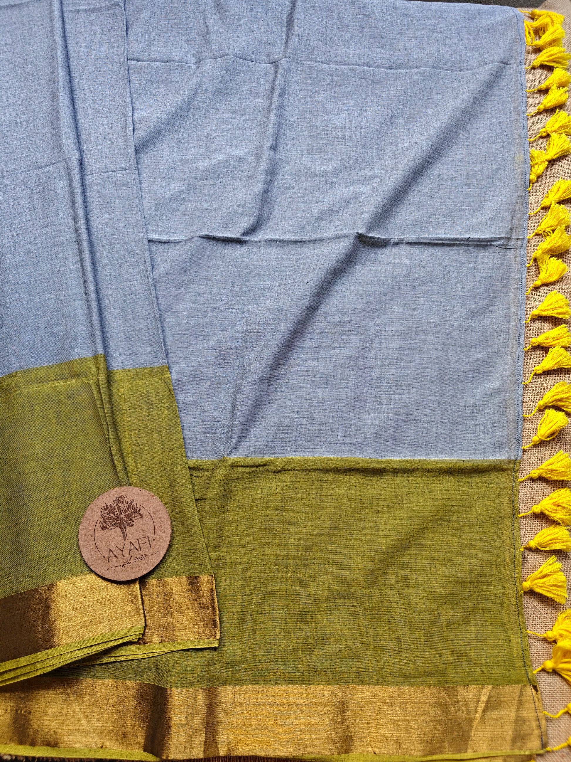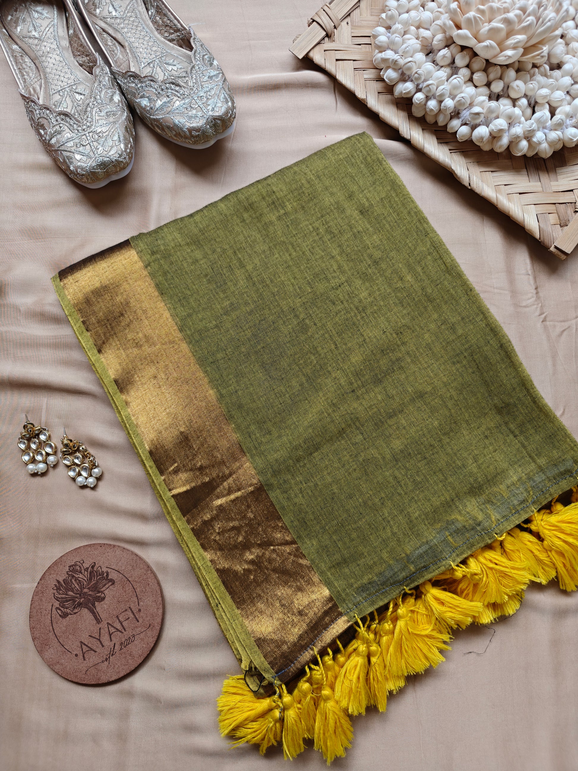This saree is elevated with a traditional gold zari border, finished with olive edging and handcrafted tassels that add just the right hint of festive charm. Rooted in South Indian aesthetics, this saree is perfect for women who appreciate minimal elegance with cultural depth.