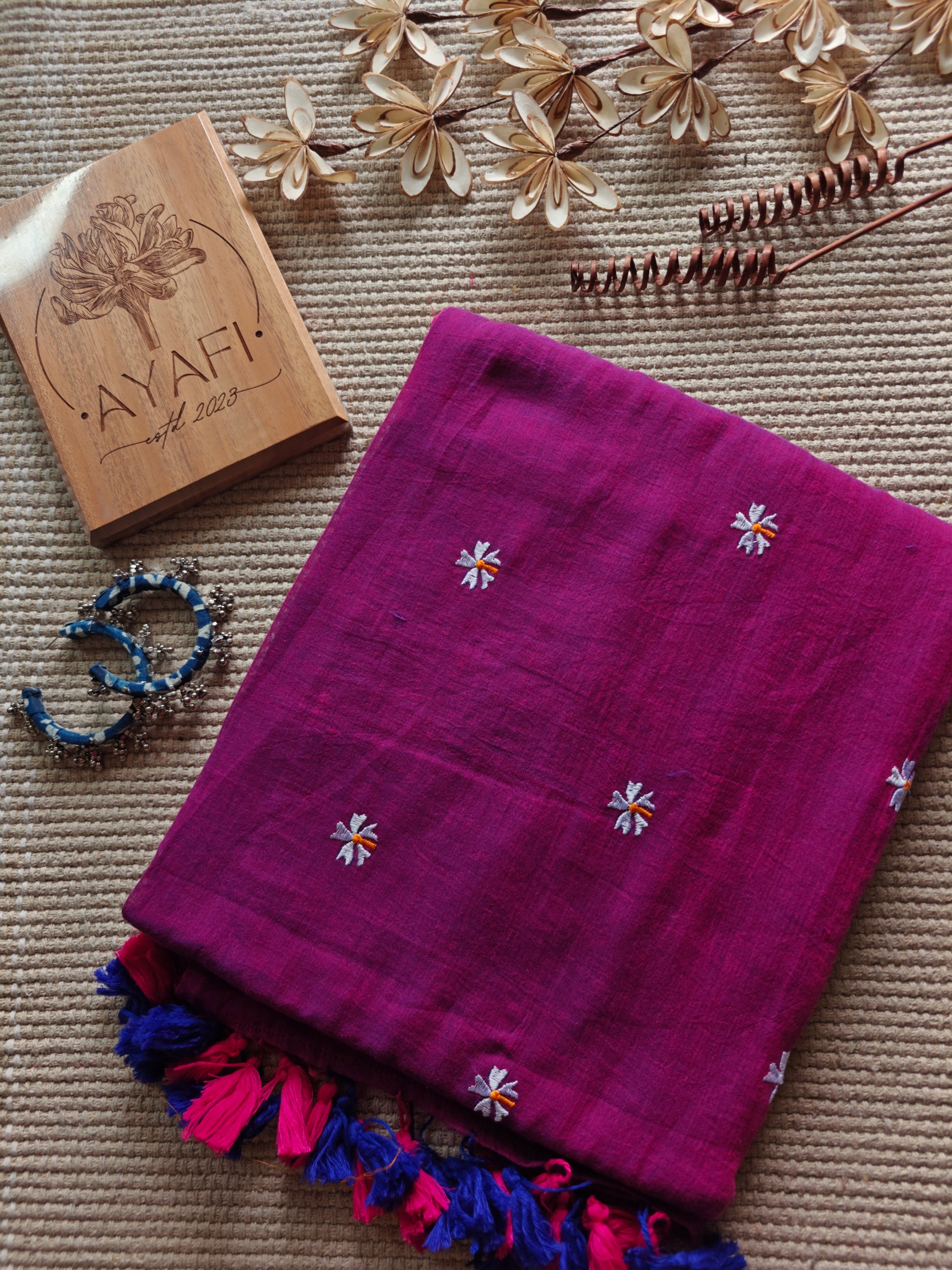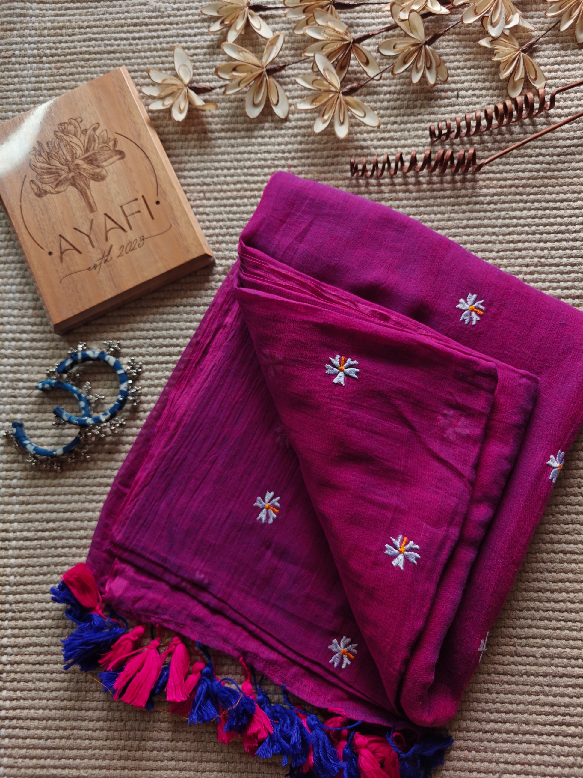 Introducing ‘FLORA’ Embroidered Mul Cotton Saree. What sets this saree apart is its intricate embroidery, meticulously woven by the loom to adorn the fabric with exquisite floral motifs.