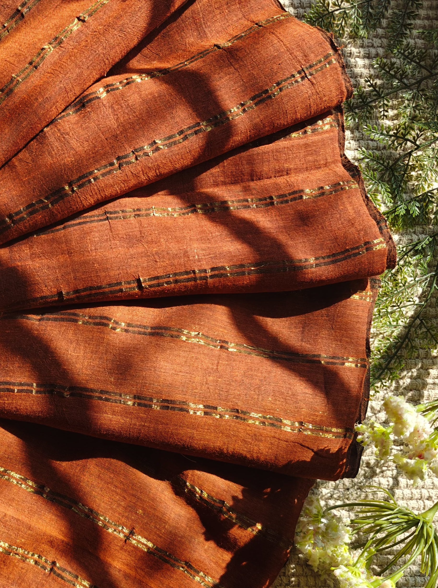 The fine texture of the fabric adds a touch of sophistication to the ensemble, making it perfect for any occasion, whether it's a casual daytime affair or a glamorous evening event. The intricate zari stripes woven into the fabric add a touch of opulence to the saree and the shimmering gold threads catch the light with every movement.