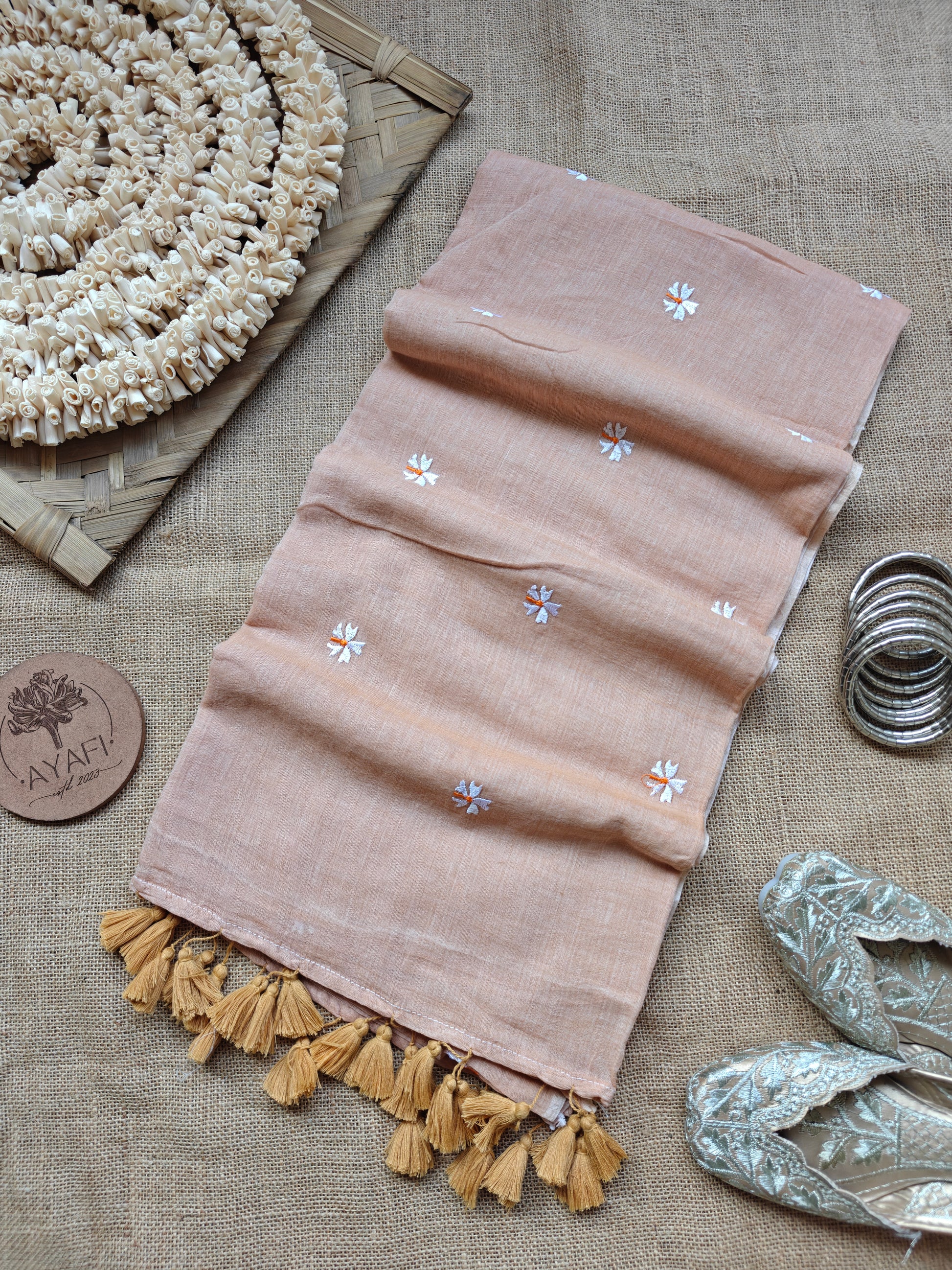 Introducing ‘FLORA’ Embroidered Mul Cotton Saree. What sets this saree apart is its intricate embroidery, meticulously woven by the loom to adorn the pallu and pleats with exquisite floral motifs.