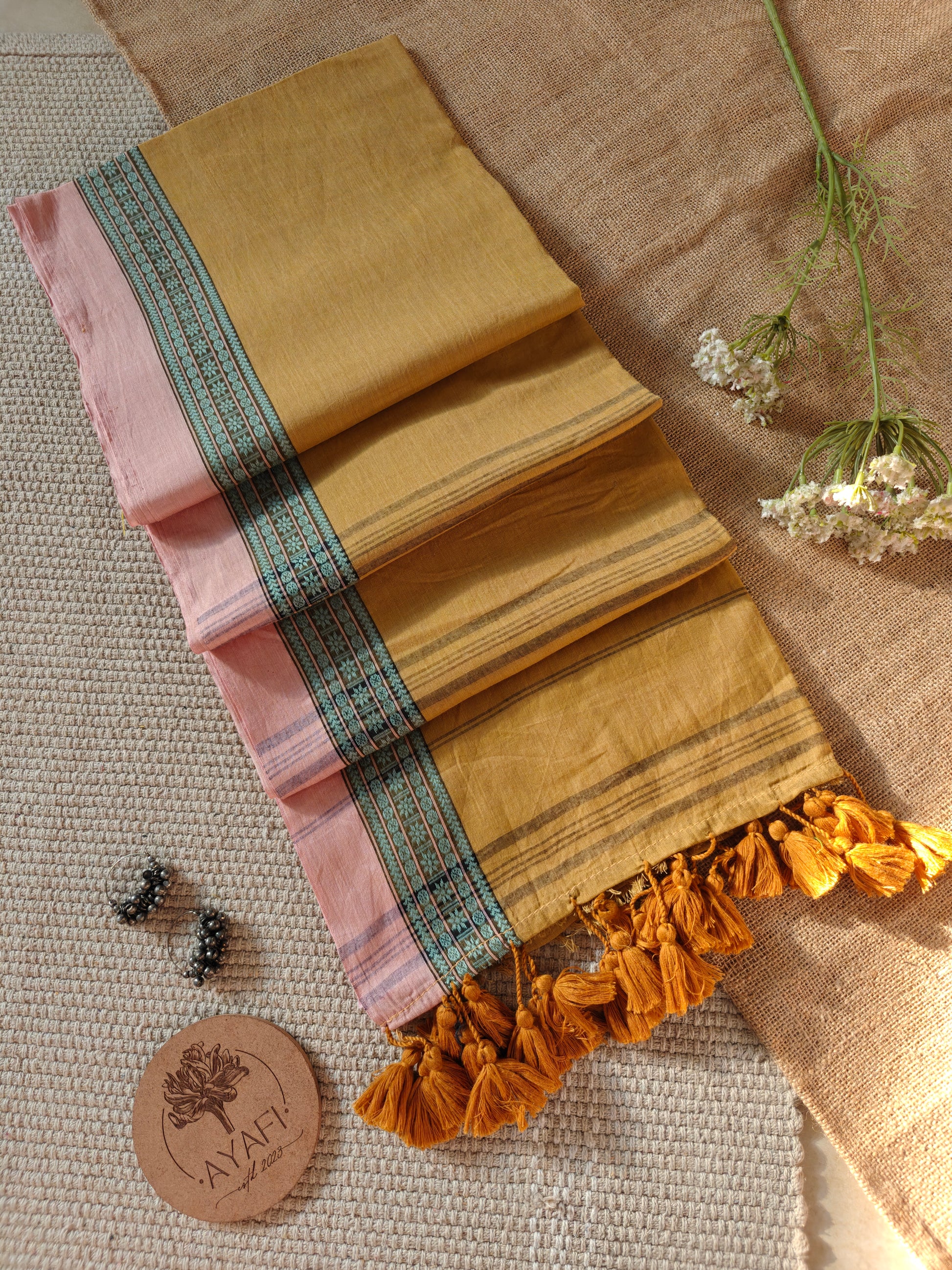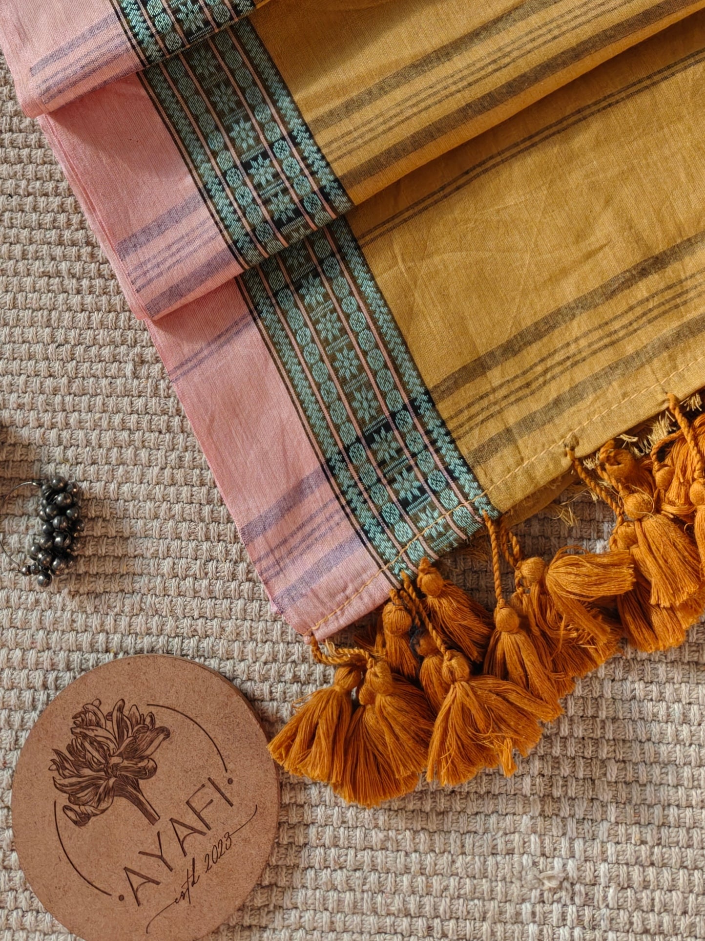 Wrap yourself in elegance with our Soulful Weaves range of sarees - handwoven masterpieces that celebrate tradition with a modern edge. This saree features a delicate blend of hues, elevated by a striking contrast pallu & border that adds definition & flair.