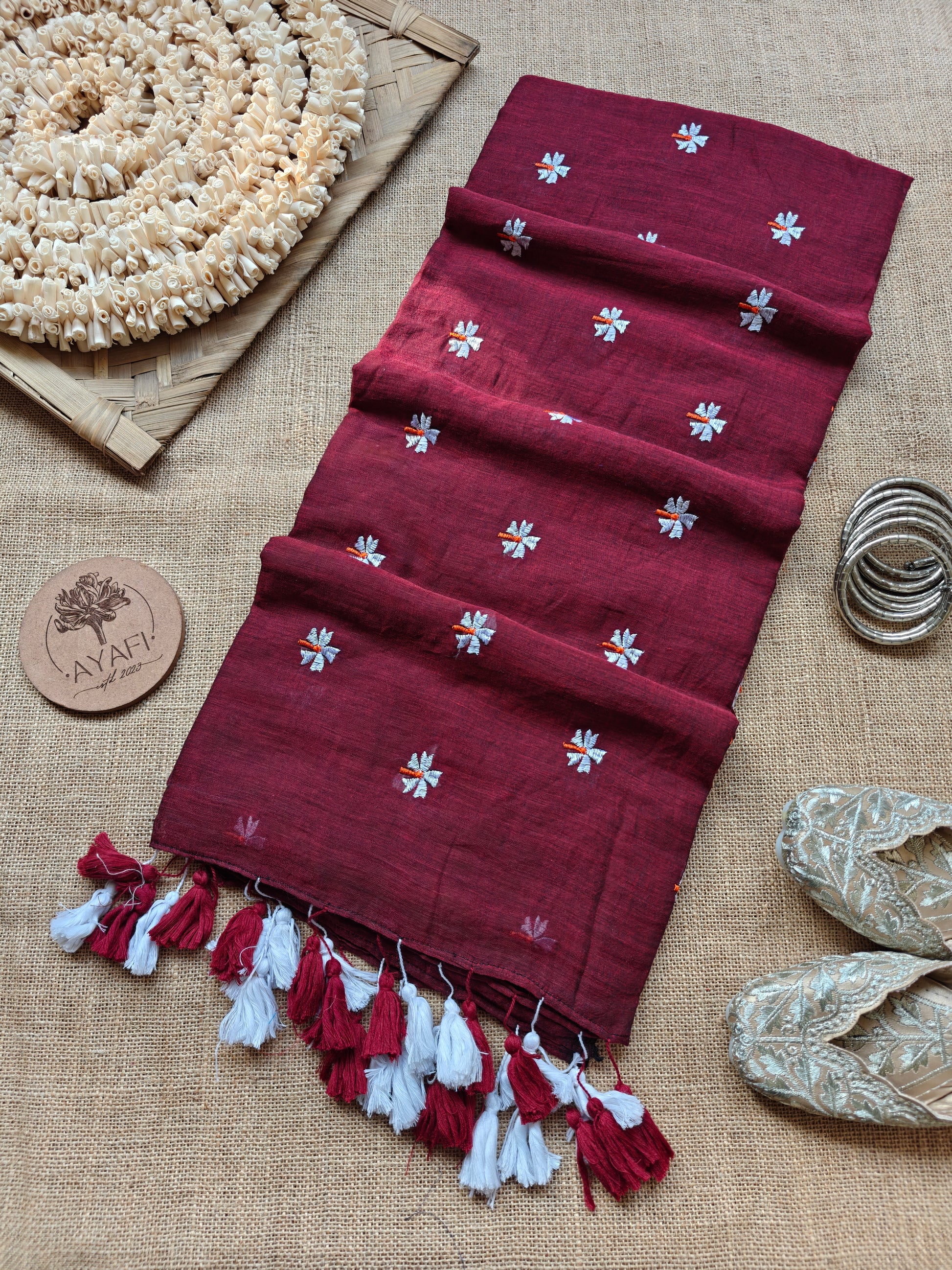 Introducing ‘FLORA’ Embroidered Mul Cotton Saree. What sets this saree apart is its intricate embroidery, meticulously woven by the loom to adorn the pallu and pleats with exquisite floral motifs.