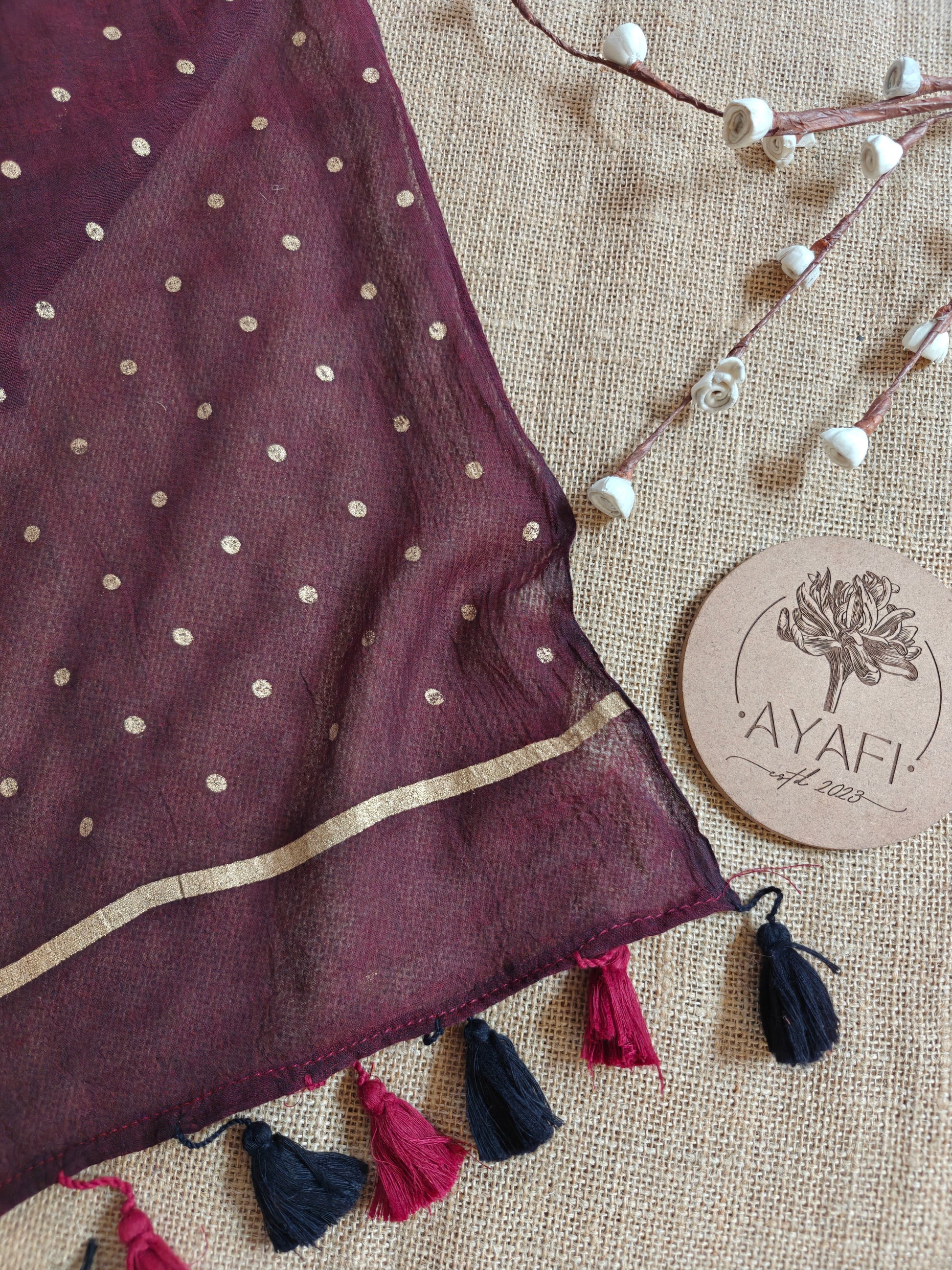 Pop goes the Polka! — where comfort meets festive charm. Handcrafted from fine mul cotton, this saree features gold foil-printed polka dots scattered across the drape like drops of sunlight.