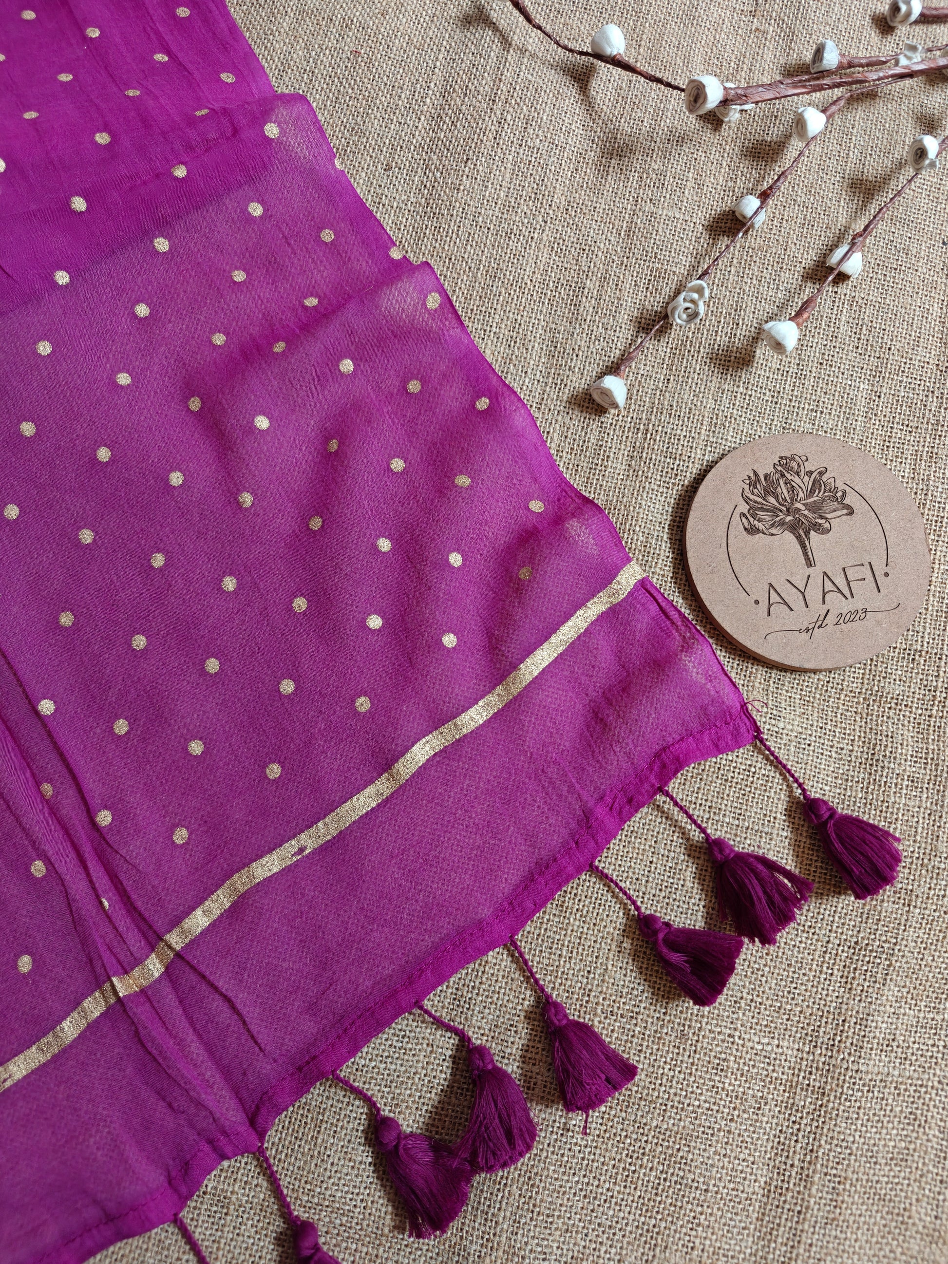 Pop goes the Polka! — where comfort meets festive charm. Handcrafted from fine mul cotton, this saree features gold foil-printed polka dots scattered across the drape like drops of sunlight.