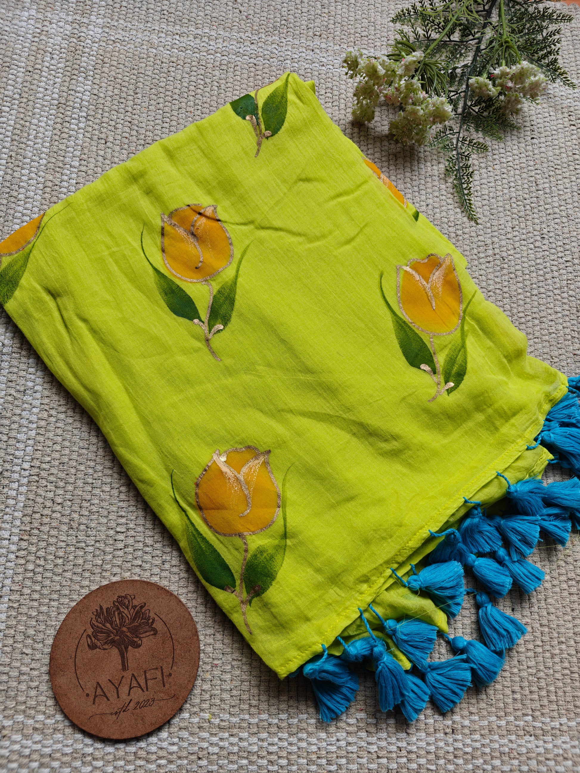 Chartreuse Yellow Tulip Hand-Painted Saree