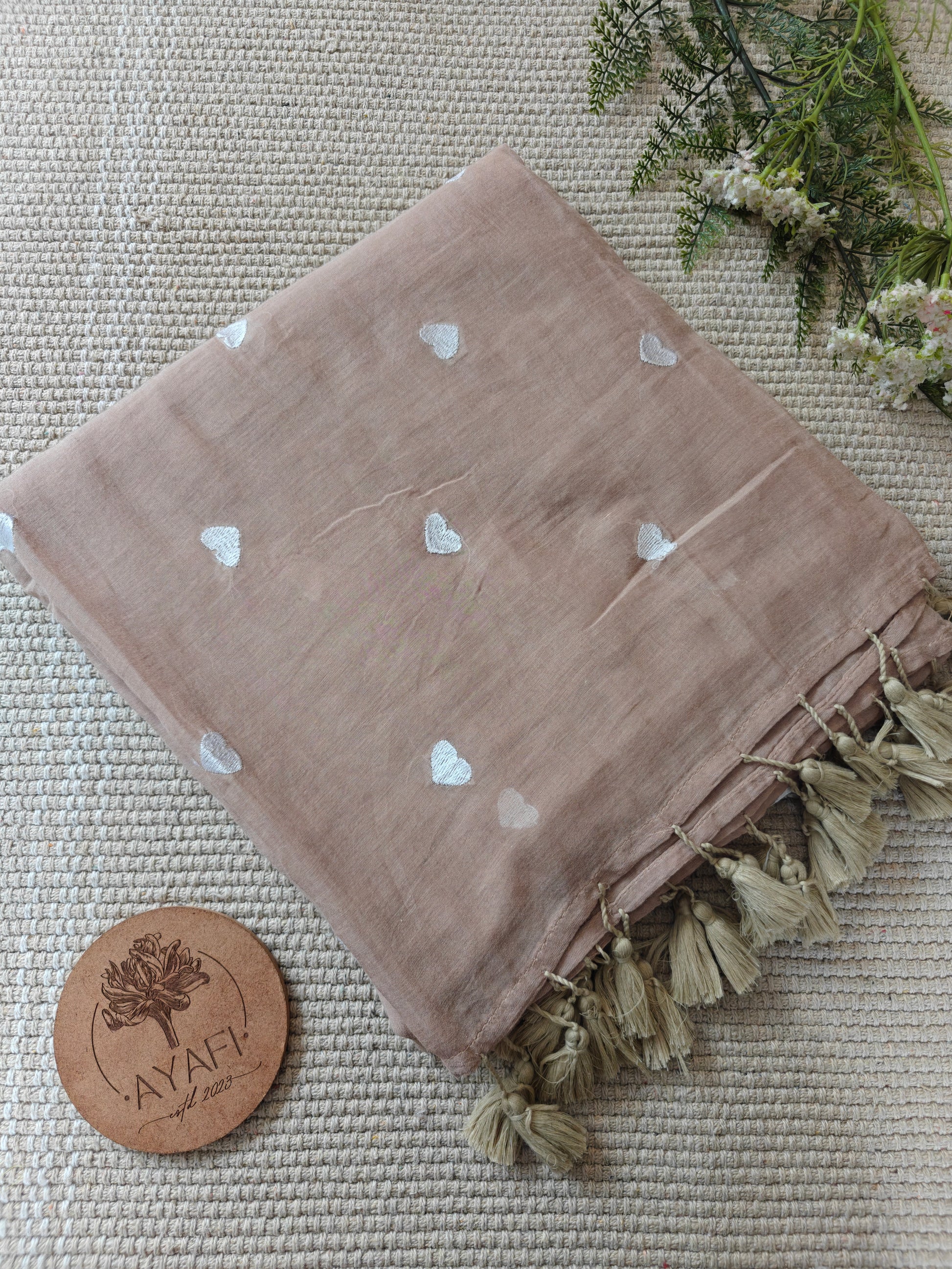 Introducing our exquisite ‘LOVE’ Embroidered Mul Cotton Saree. What sets this saree apart is its intricate embroidery, meticulously woven by the loom to adorn the fabric with beautiful Heart motifs.