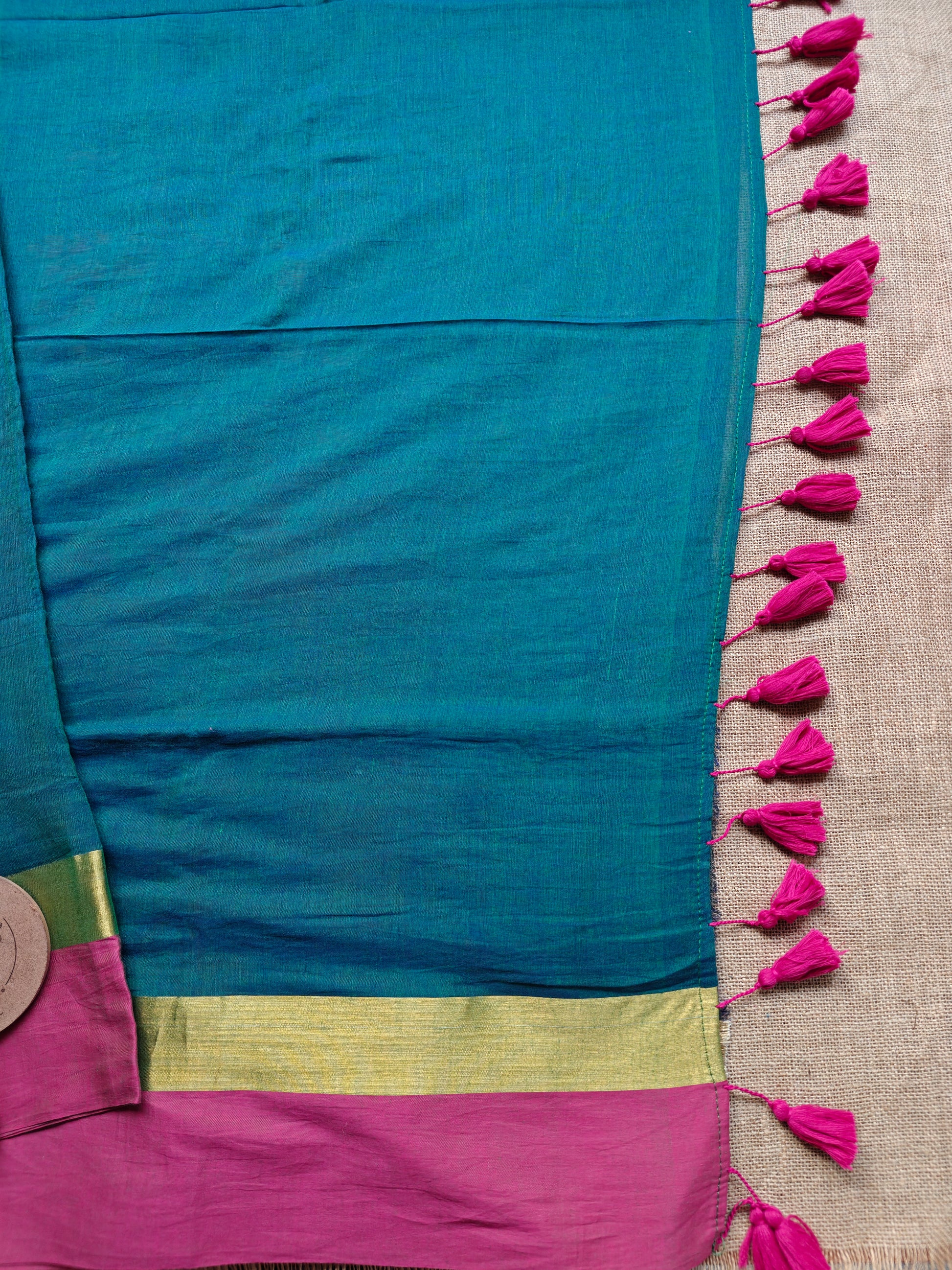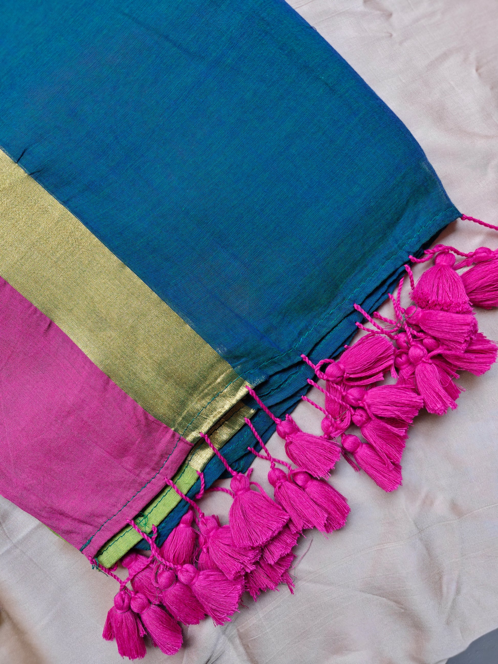 The highlight of the saree is its kasavu-inspired colour blocked border, woven in rich multicolours that add character and depth without overwhelming the simplicity of the fabric. Finished with playful contrast tassels on the pallu, this saree strikes the perfect balance between heritage and ease.