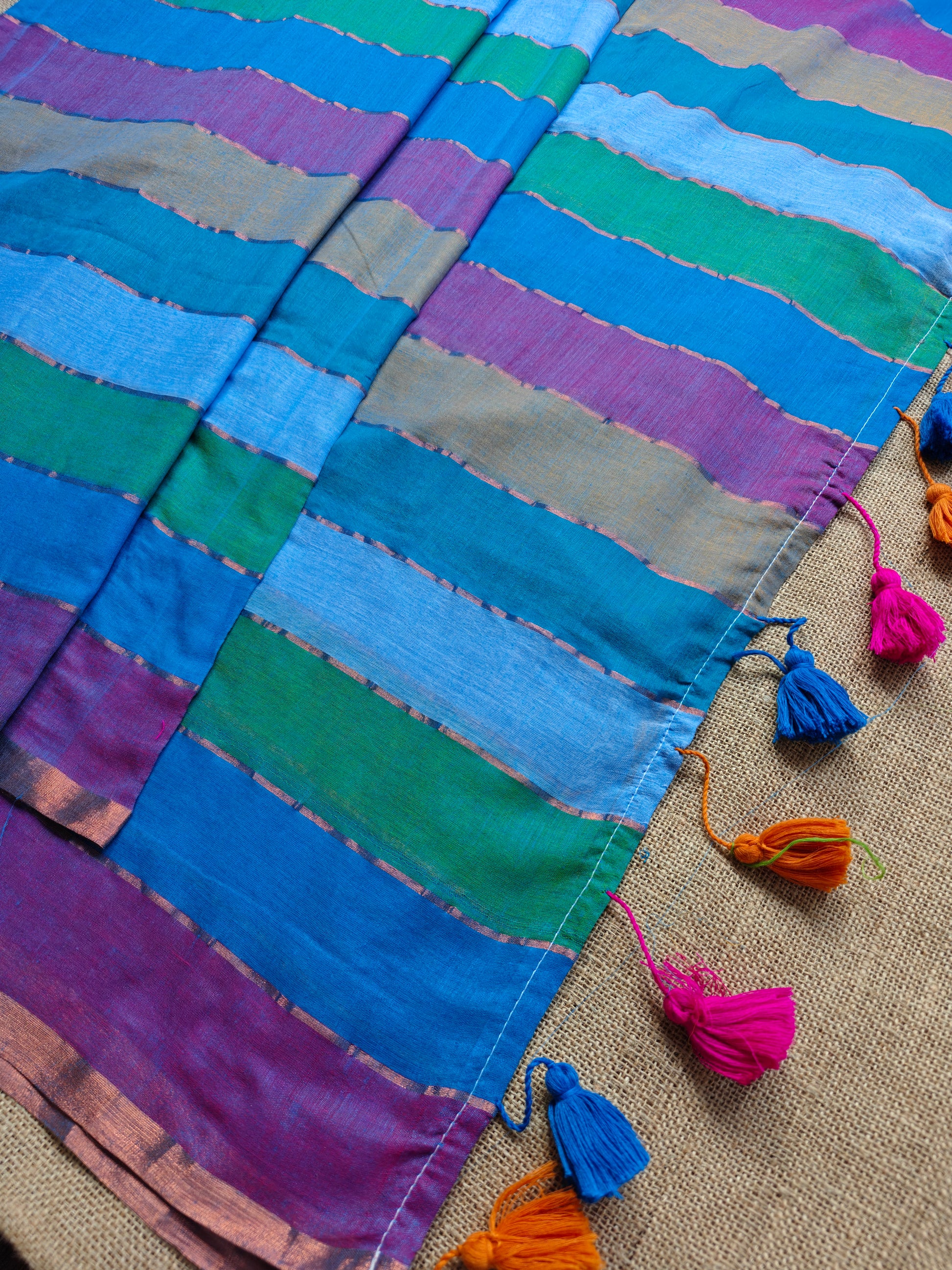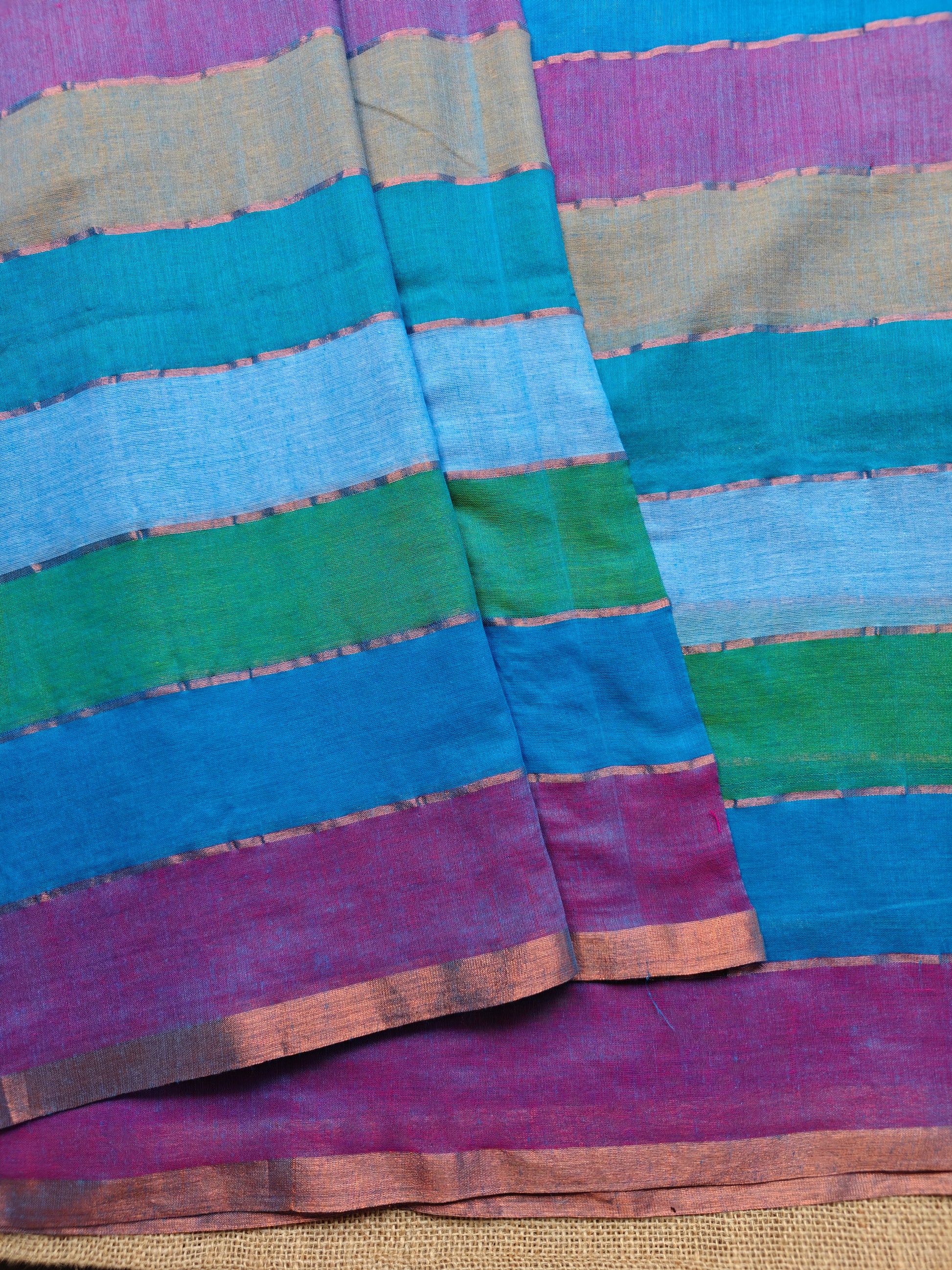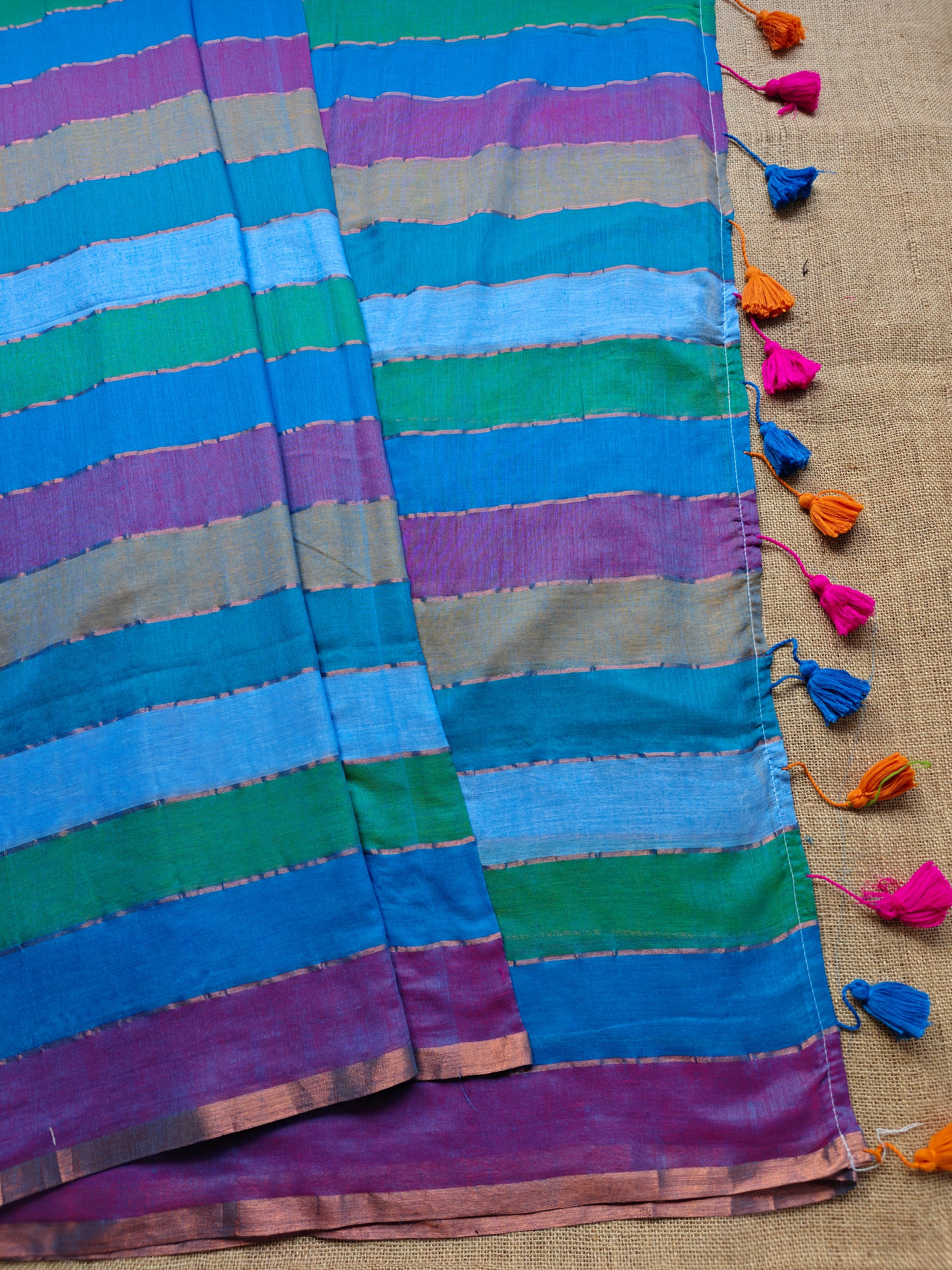 The fine texture of the fabric adds a touch of sophistication to the ensemble, making it perfect for any occasion, whether it's a casual daytime affair or a glamorous evening event. The intricate zari stripes woven into the fabric add a touch of opulence to the saree and the shimmering gold threads catch the light with every movement.
