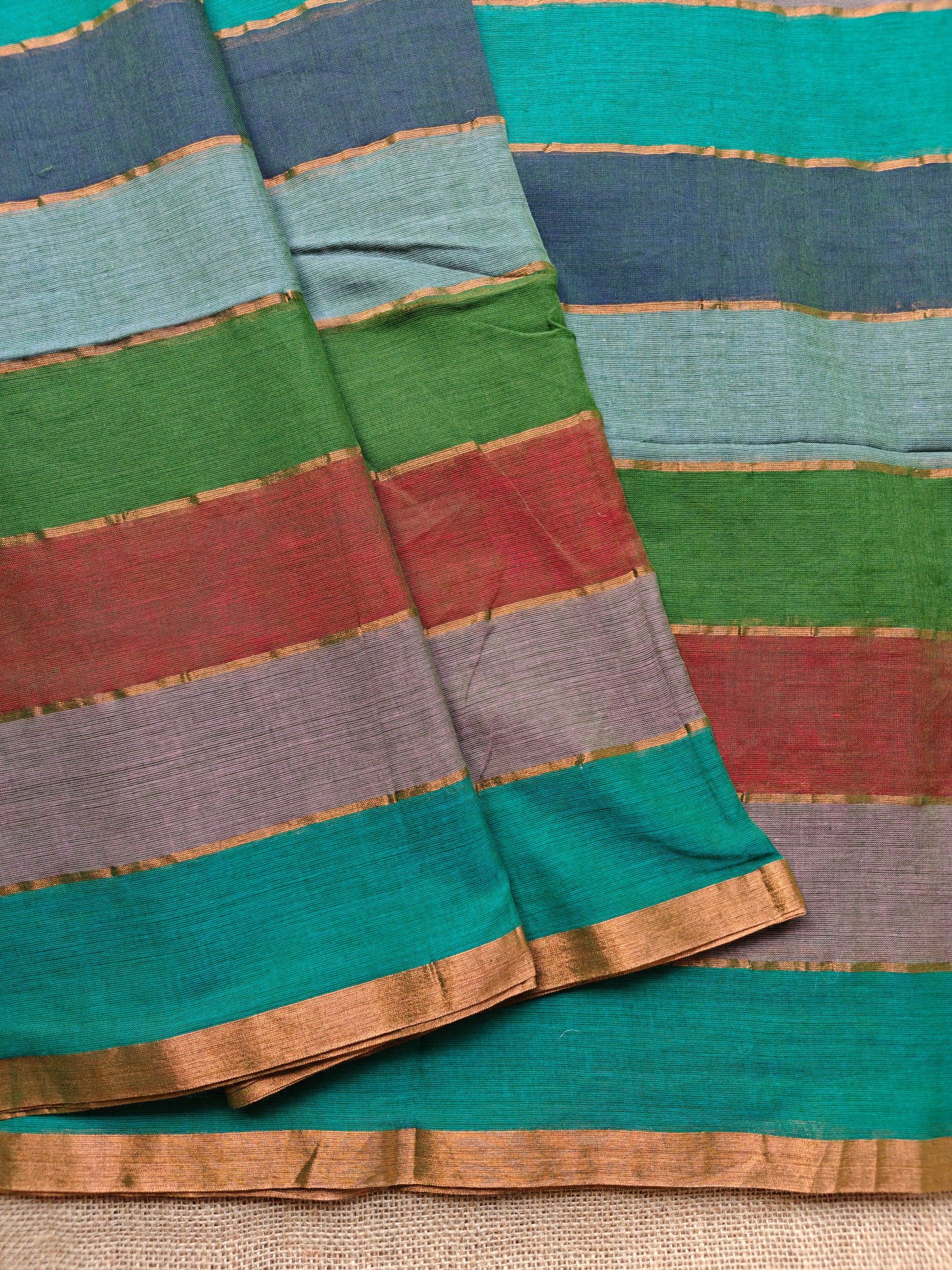 The fine texture of the fabric adds a touch of sophistication to the ensemble, making it perfect for any occasion, whether it's a casual daytime affair or a glamorous evening event. The intricate zari stripes woven into the fabric add a touch of opulence to the saree and the shimmering gold threads catch the light with every movement.