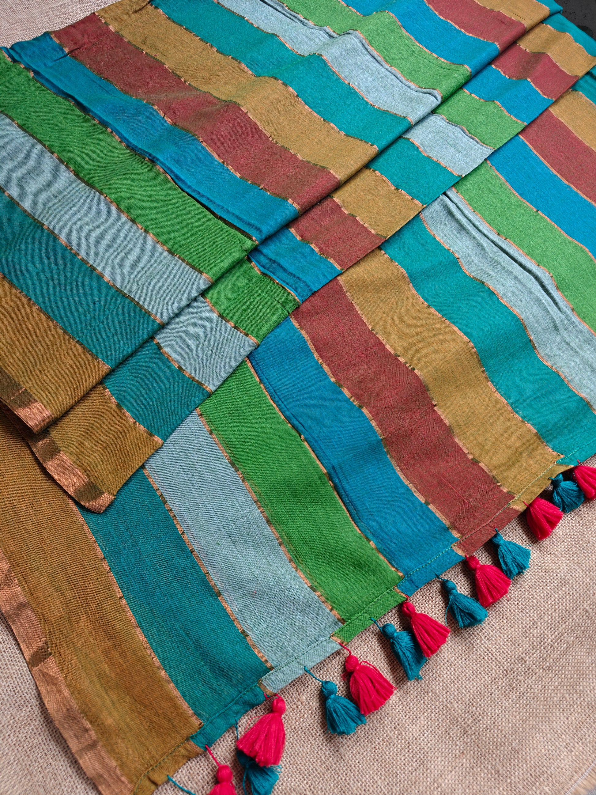 The fine texture of the fabric adds a touch of sophistication to the ensemble, making it perfect for any occasion, whether it's a casual daytime affair or a glamorous evening event. The intricate zari stripes woven into the fabric add a touch of opulence to the saree and the shimmering gold threads catch the light with every movement.