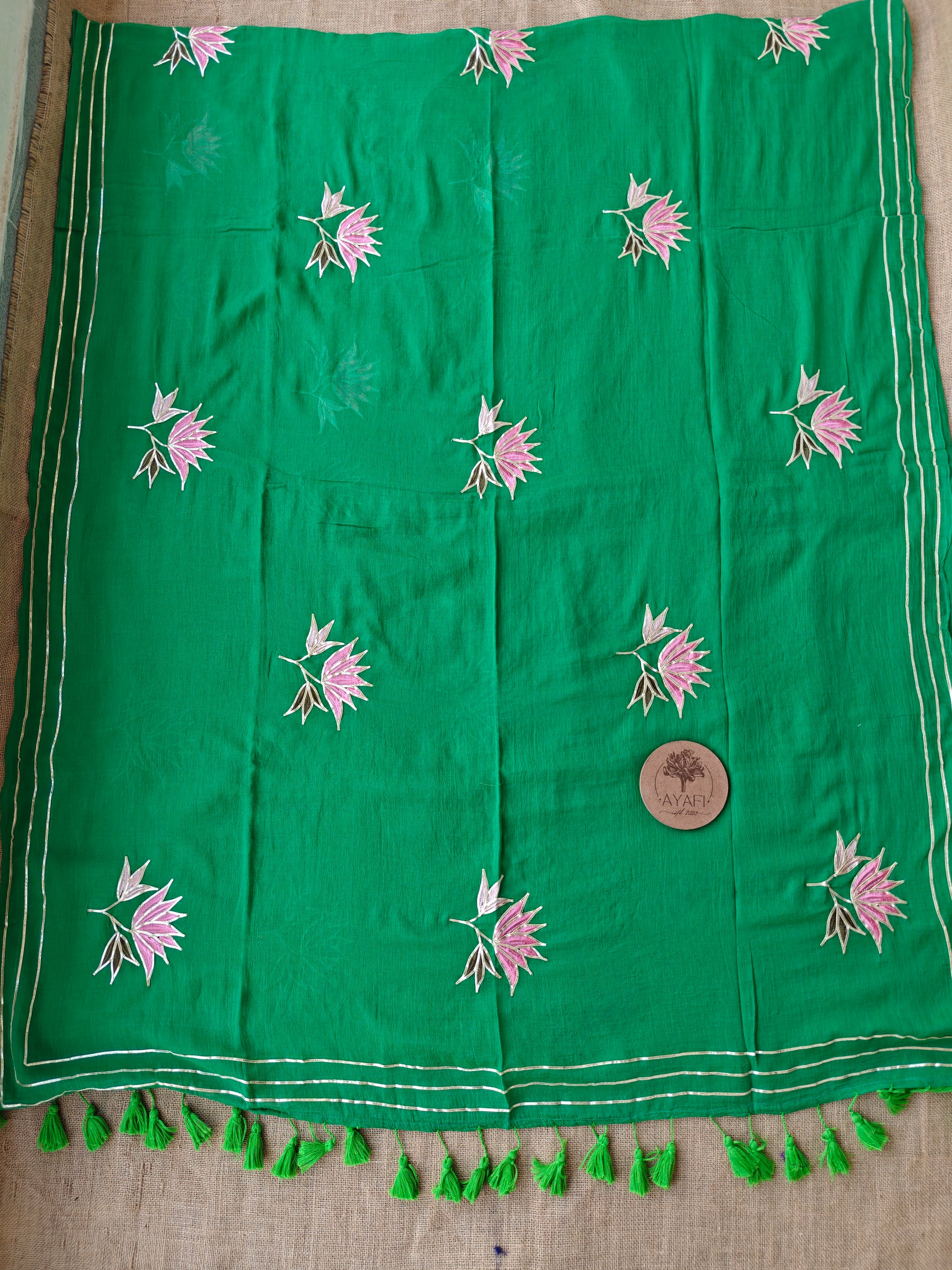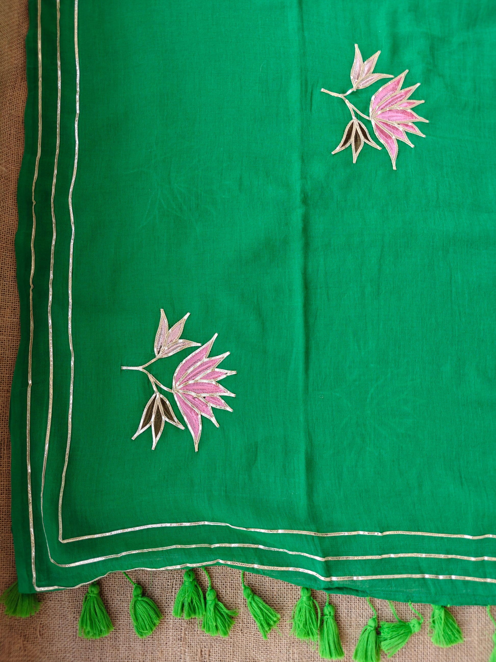 Crafted in airy mul cotton, this saree is adorned with delicate gota patti work, where hand-embroidered gota flowers bloom softly across the body. Each motif is thoughtfully placed, celebrating the finesse of traditional craftsmanship and the subtle shimmer of gota, brought to life by skilled hands.