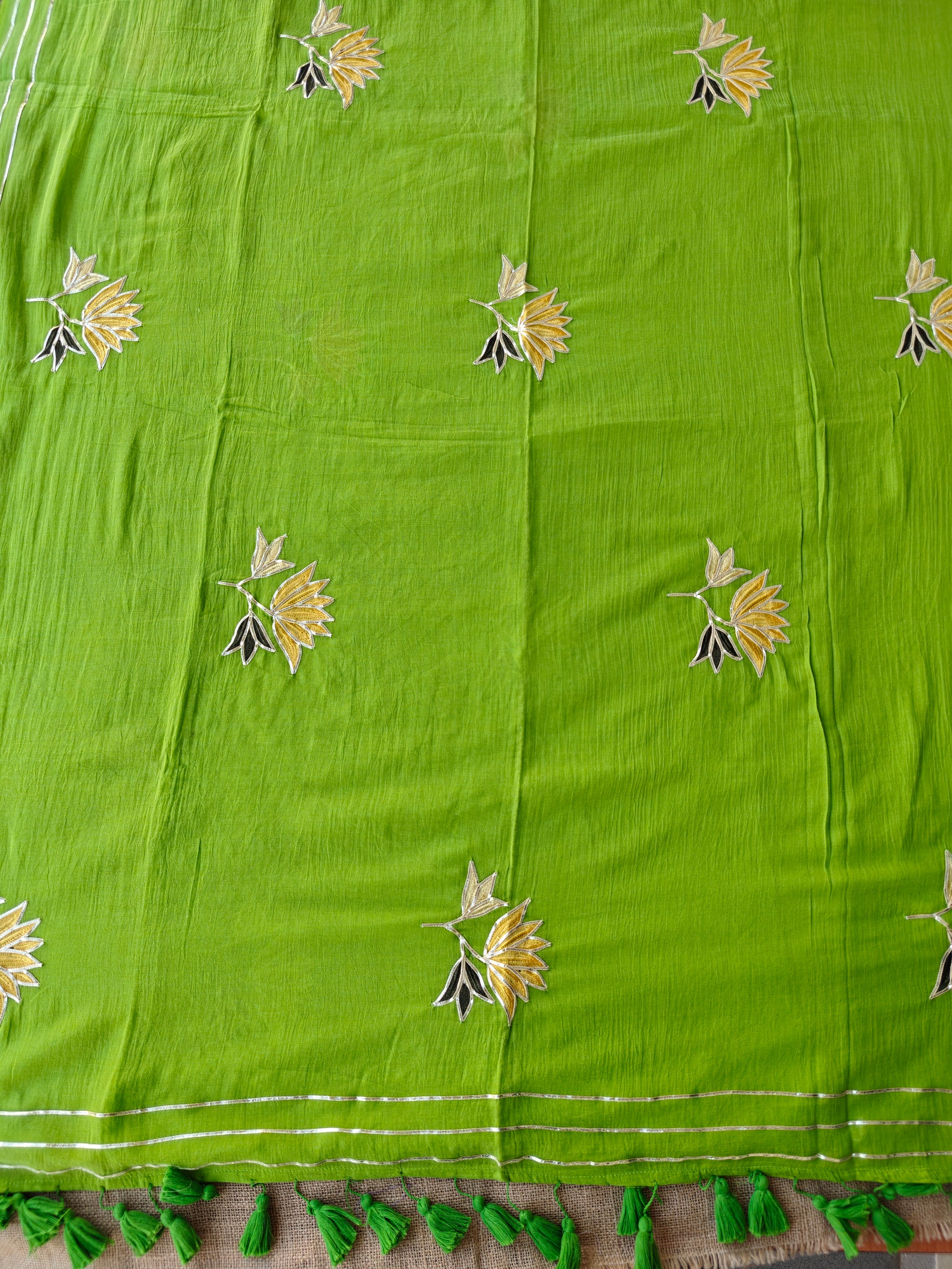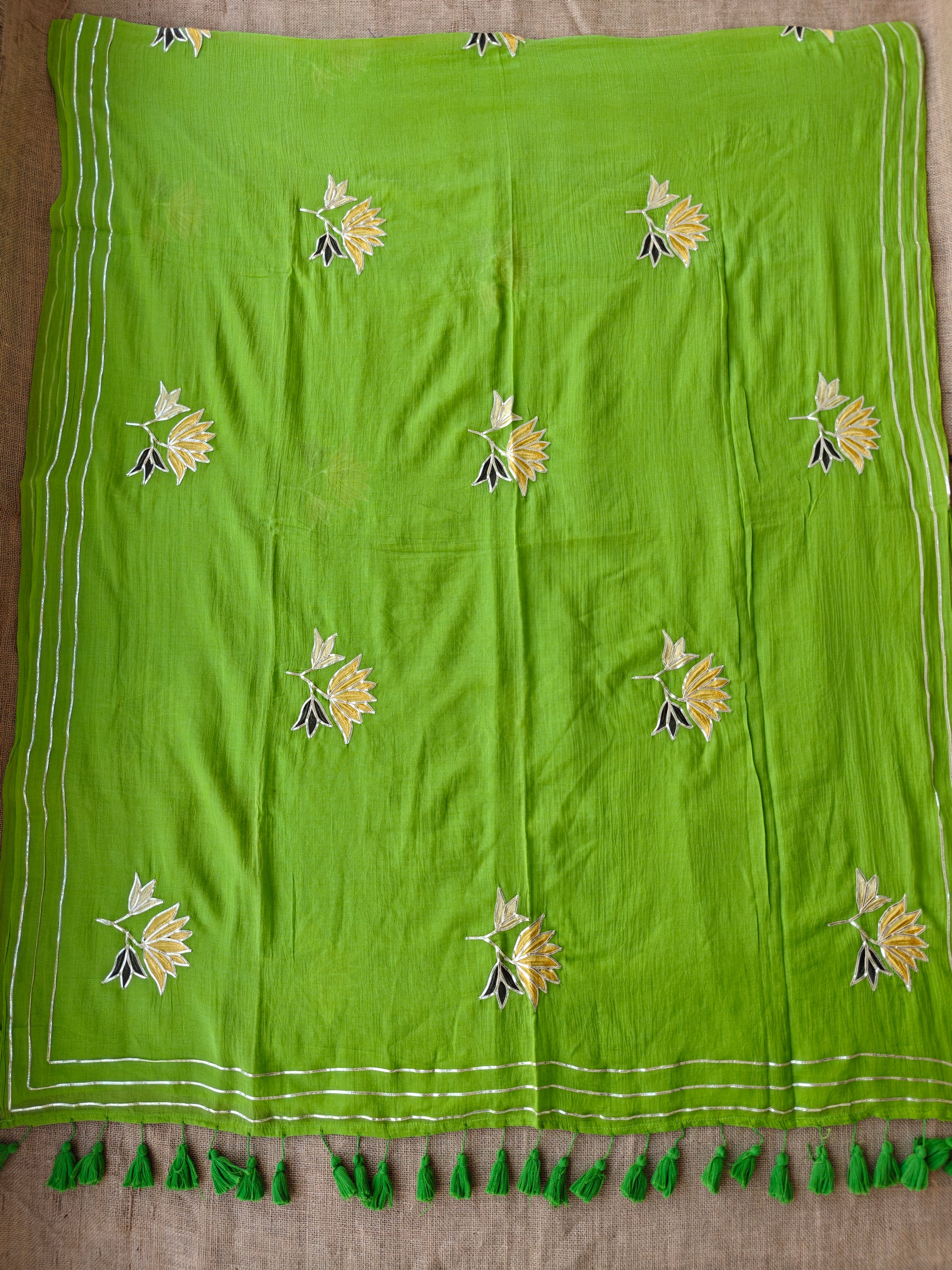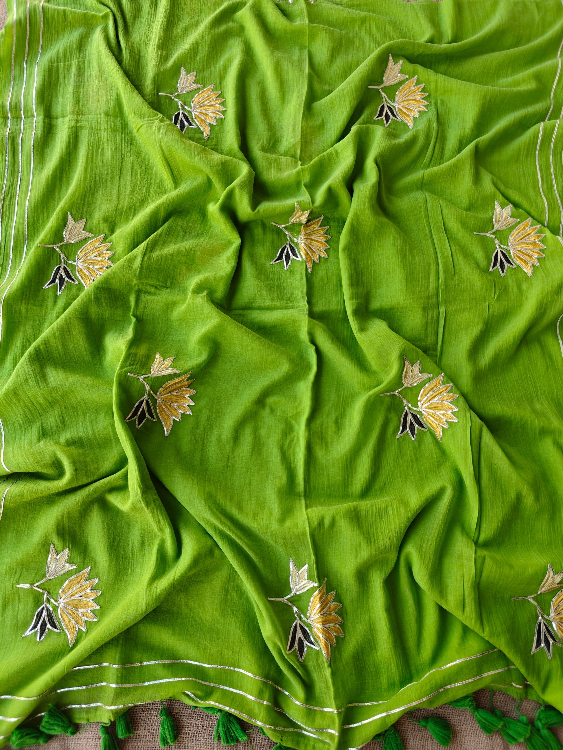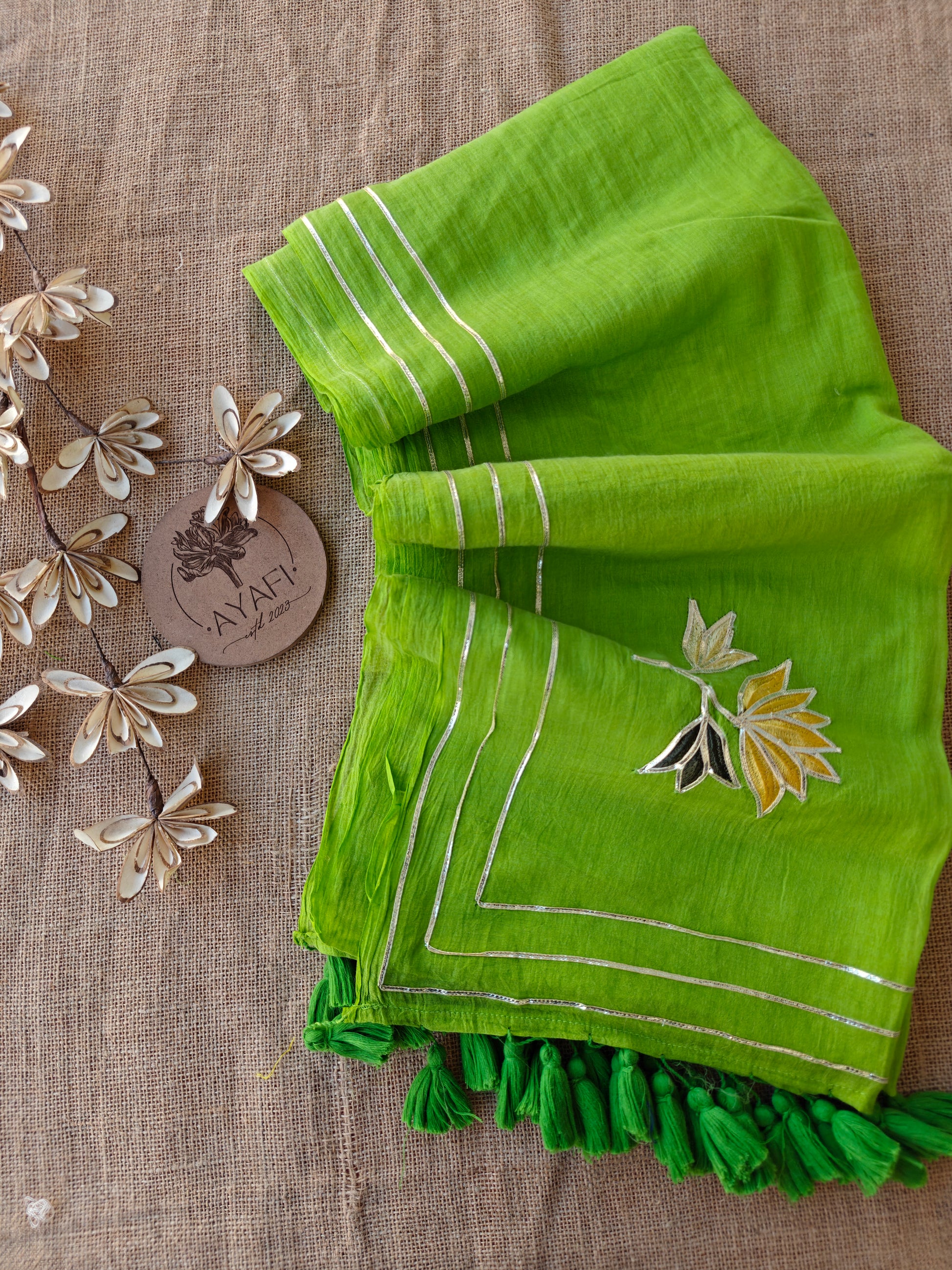 Crafted in airy mul cotton, this saree is adorned with delicate gota patti work, where hand-embroidered gota flowers bloom softly across the body. Each motif is thoughtfully placed, celebrating the finesse of traditional craftsmanship and the subtle shimmer of gota, brought to life by skilled hands.