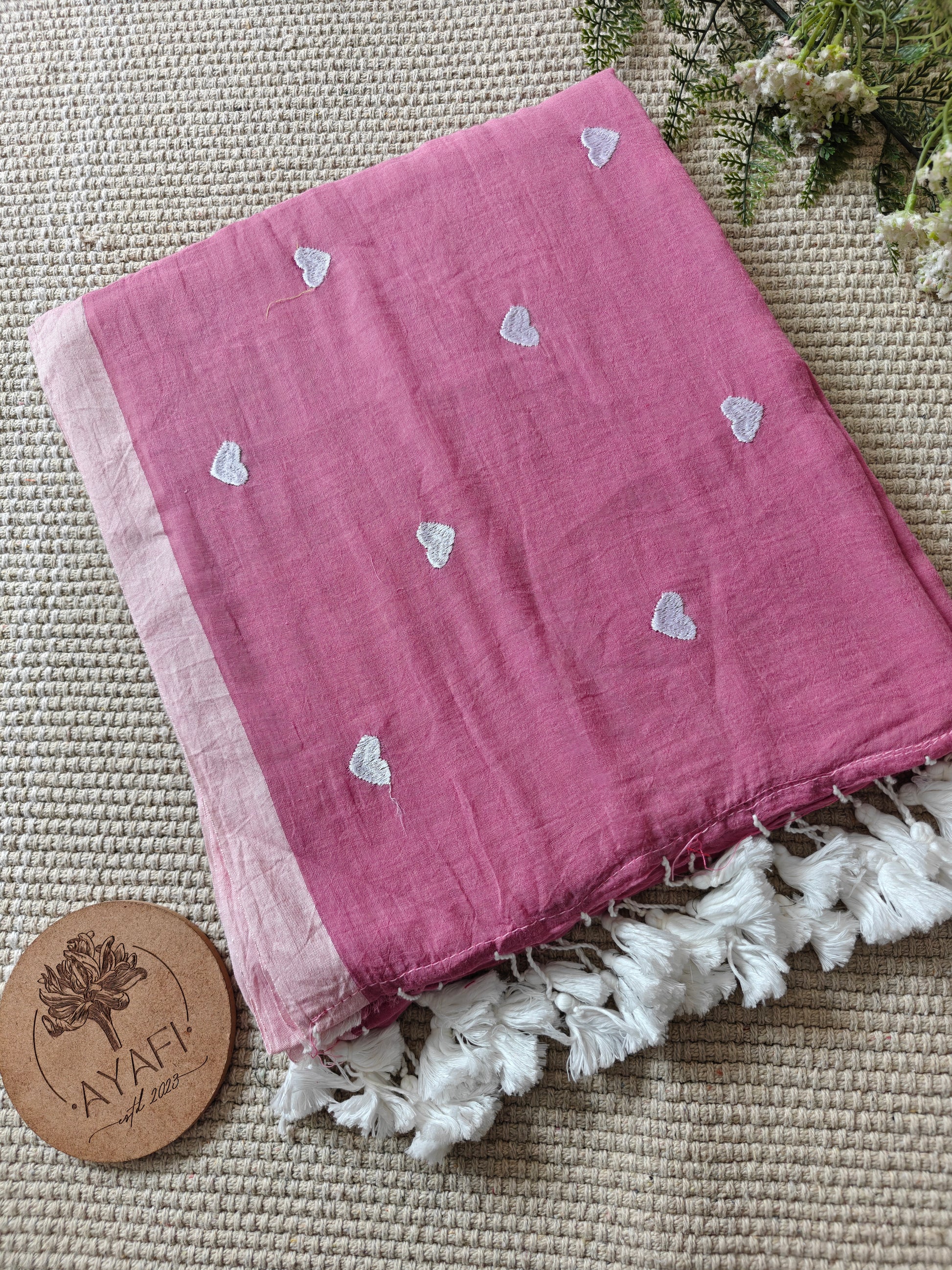 Introducing our exquisite ‘LOVE’ Embroidered Mul Cotton Saree. What sets this saree apart is its intricate embroidery, meticulously woven by the loom to adorn the fabric with beautiful Heart motifs.