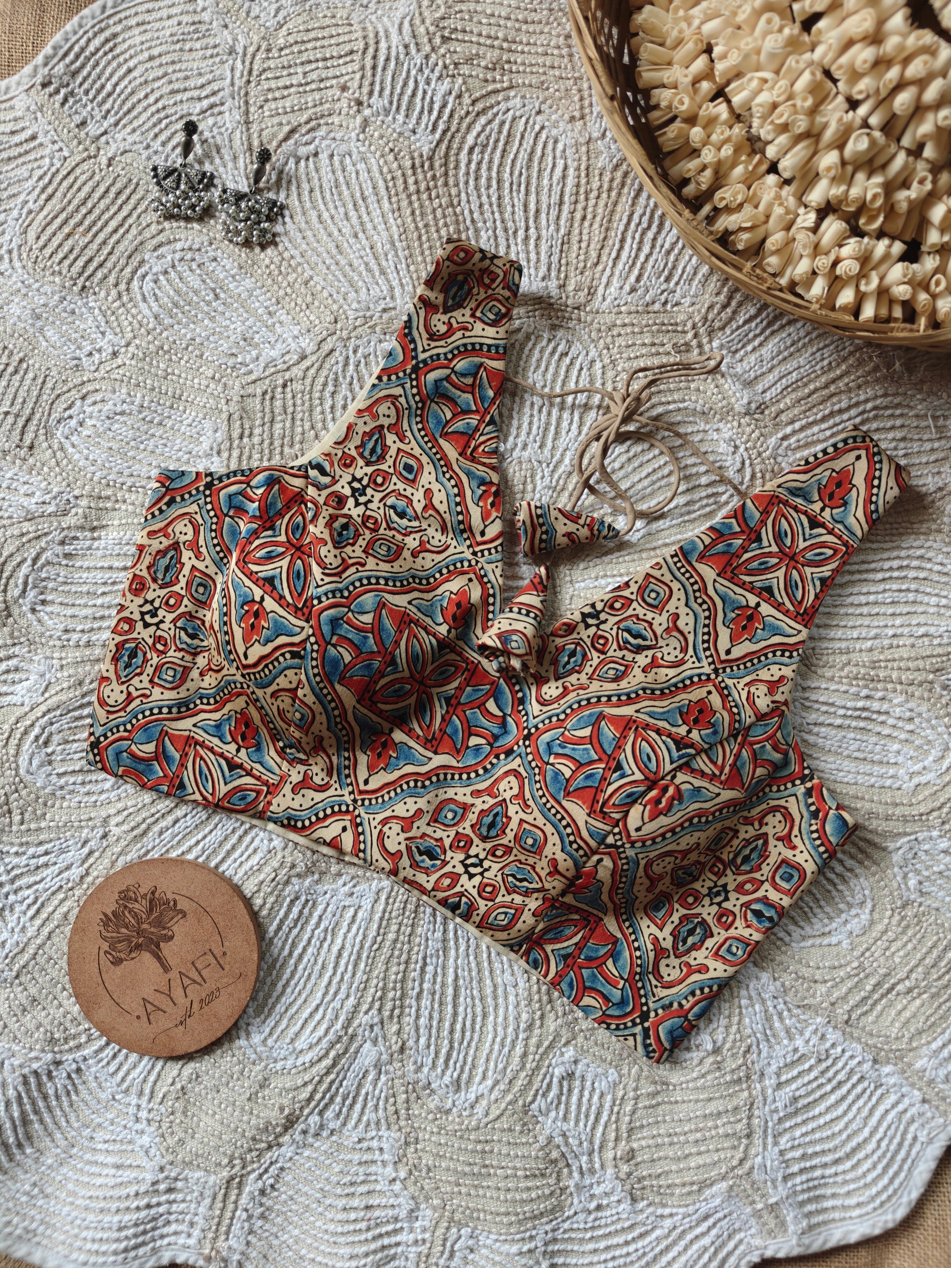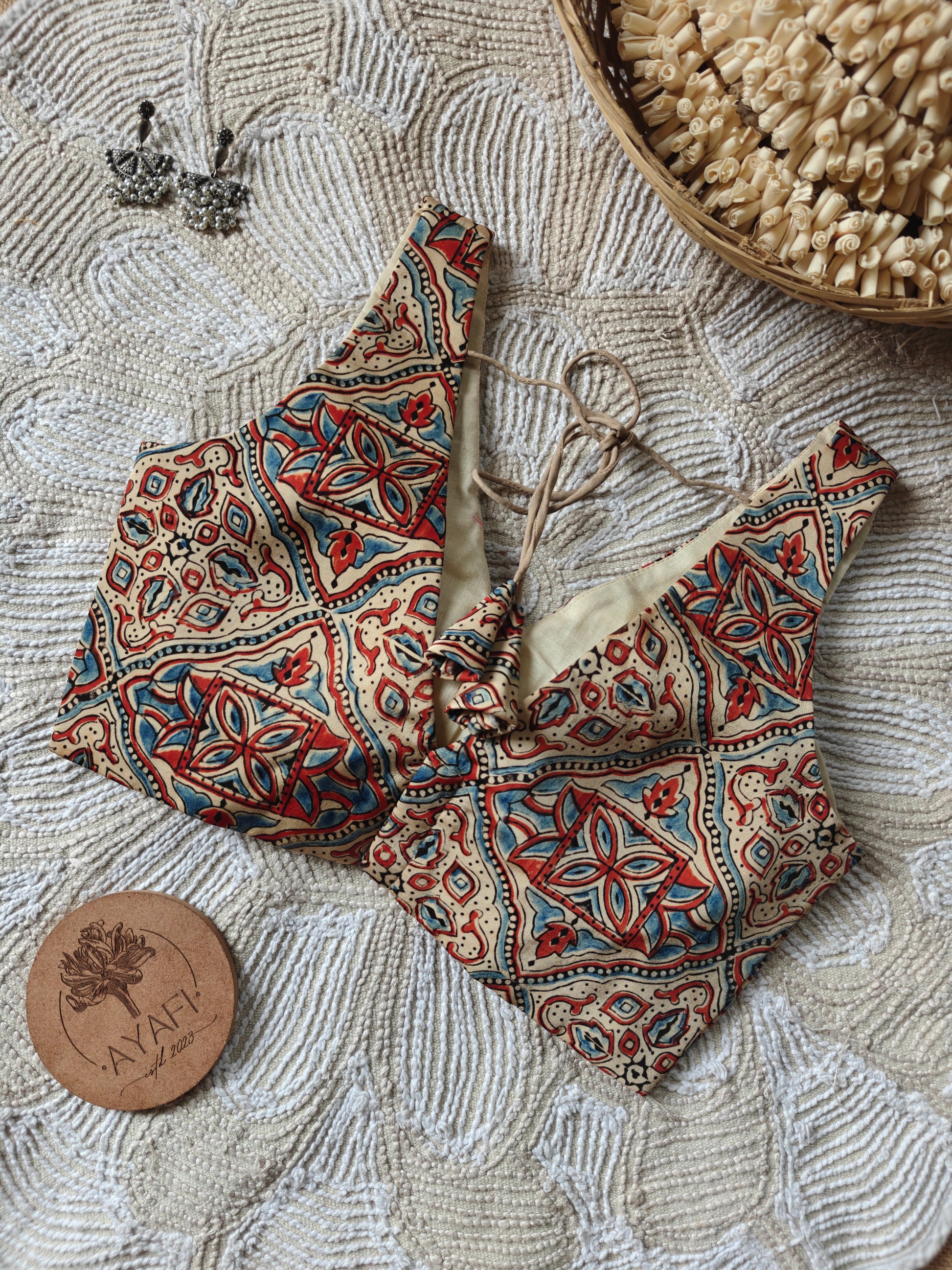 Cream Ajrakh Modal Silk V-Neck Sleeveless Blouse