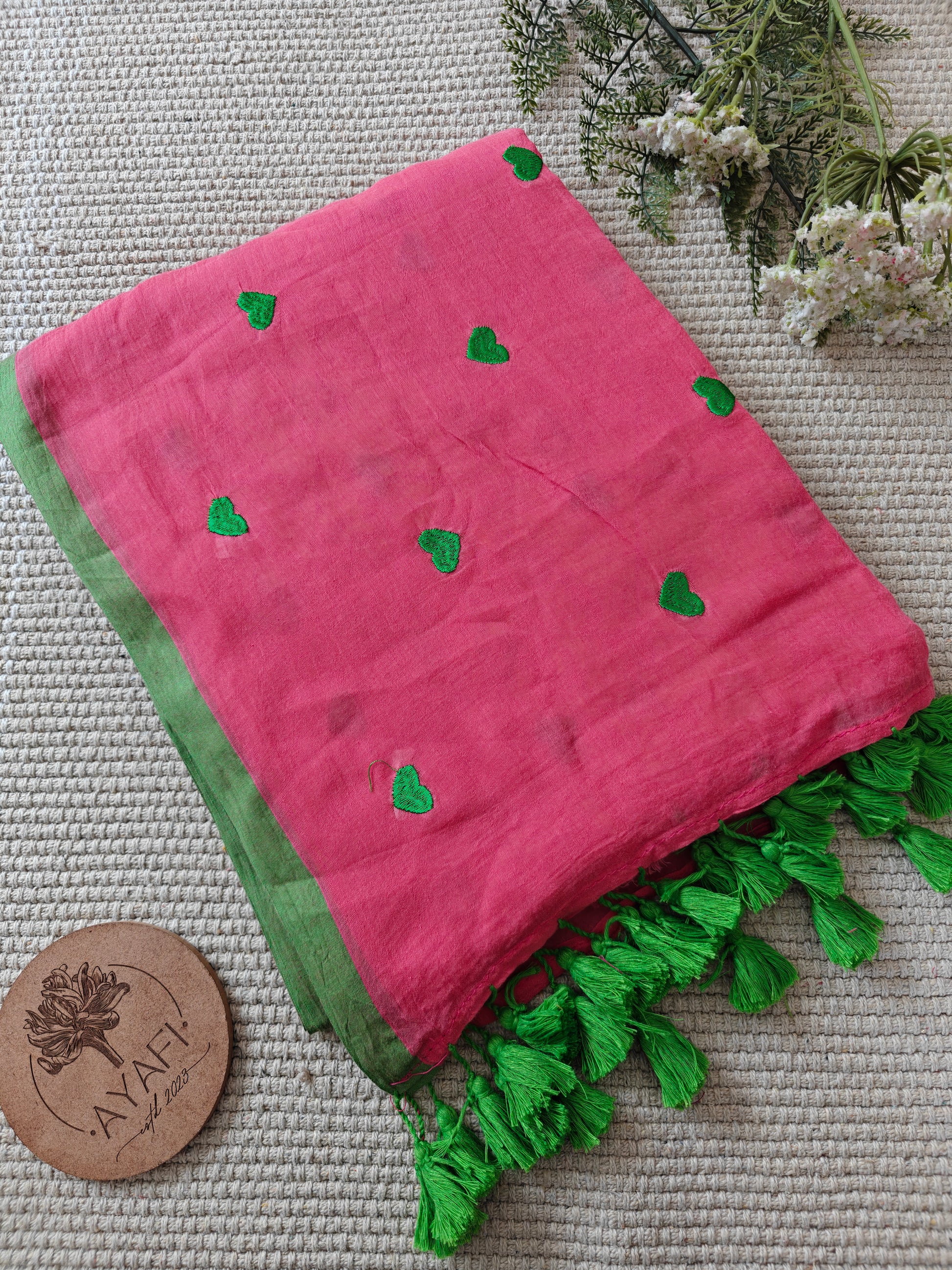 Introducing our exquisite ‘LOVE’ Embroidered Mul Cotton Saree. What sets this saree apart is its intricate embroidery, meticulously woven by the loom to adorn the fabric with beautiful Heart motifs.