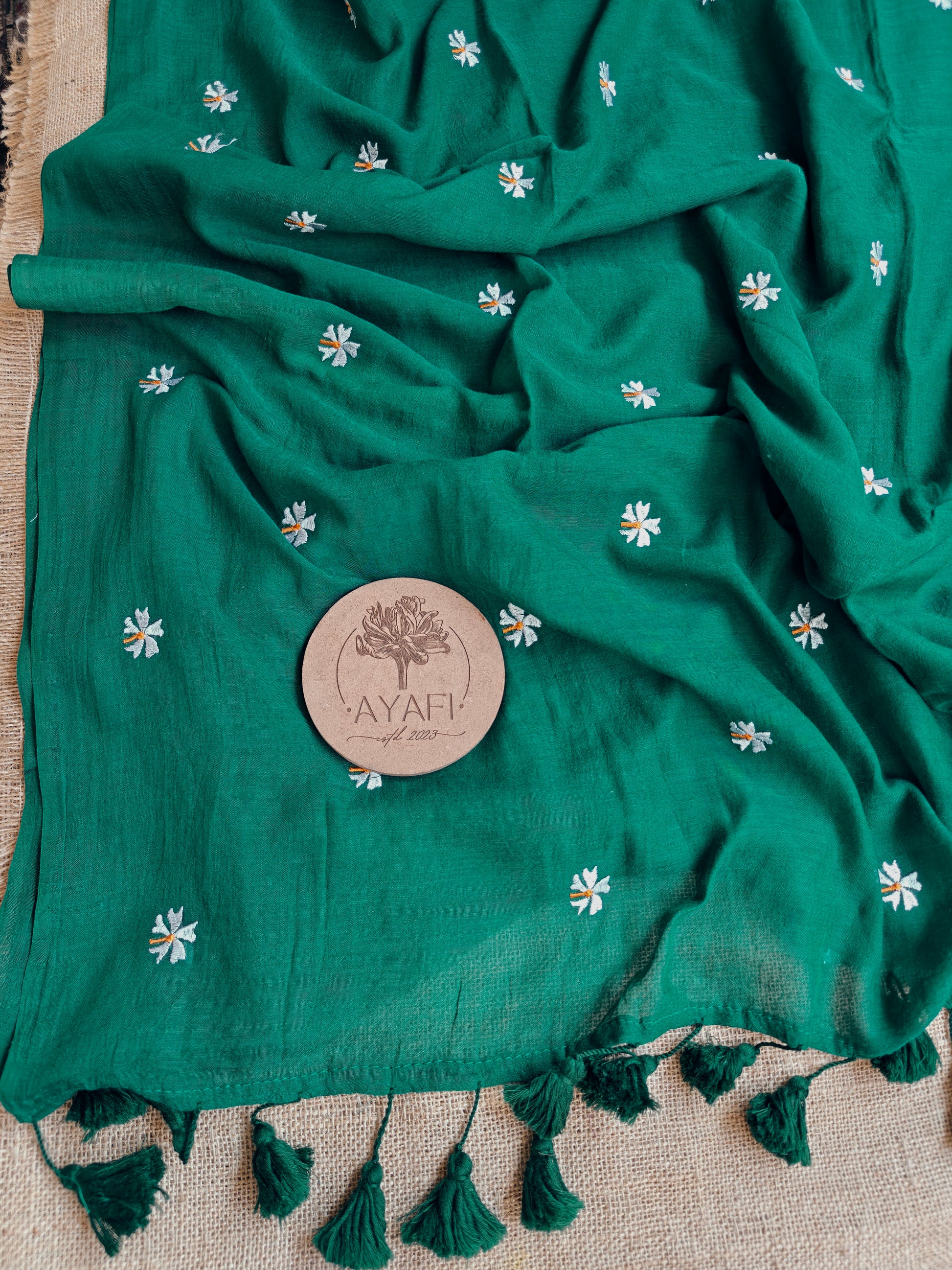 Introducing ‘FLORA’ Embroidered Mul Cotton Saree. What sets this saree apart is its intricate embroidery, meticulously woven by the loom to adorn the pallu and pleats with exquisite floral motifs.