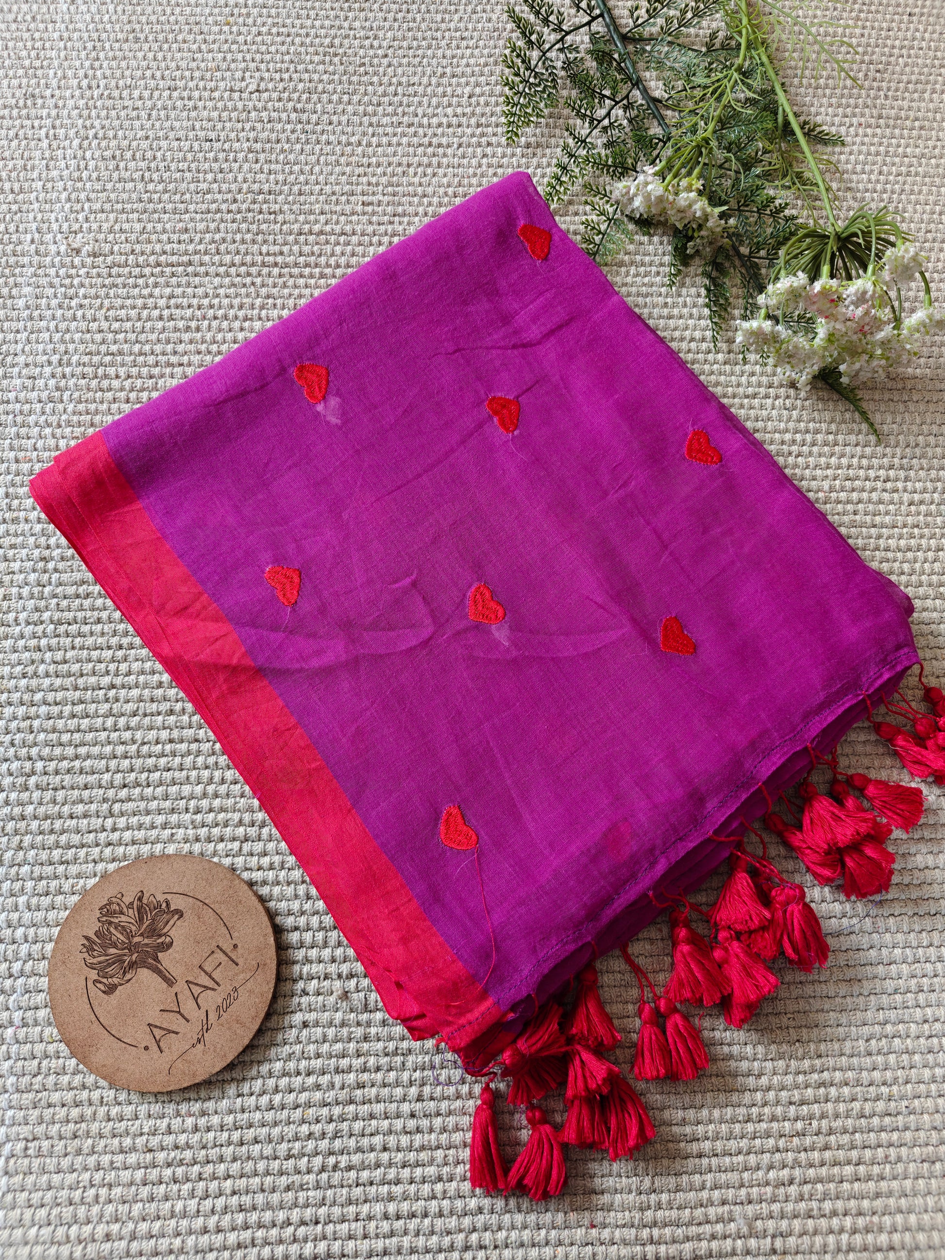 Introducing our exquisite ‘LOVE’ Embroidered Mul Cotton Saree. What sets this saree apart is its intricate embroidery, meticulously woven by the loom to adorn the fabric with beautiful Heart motifs.