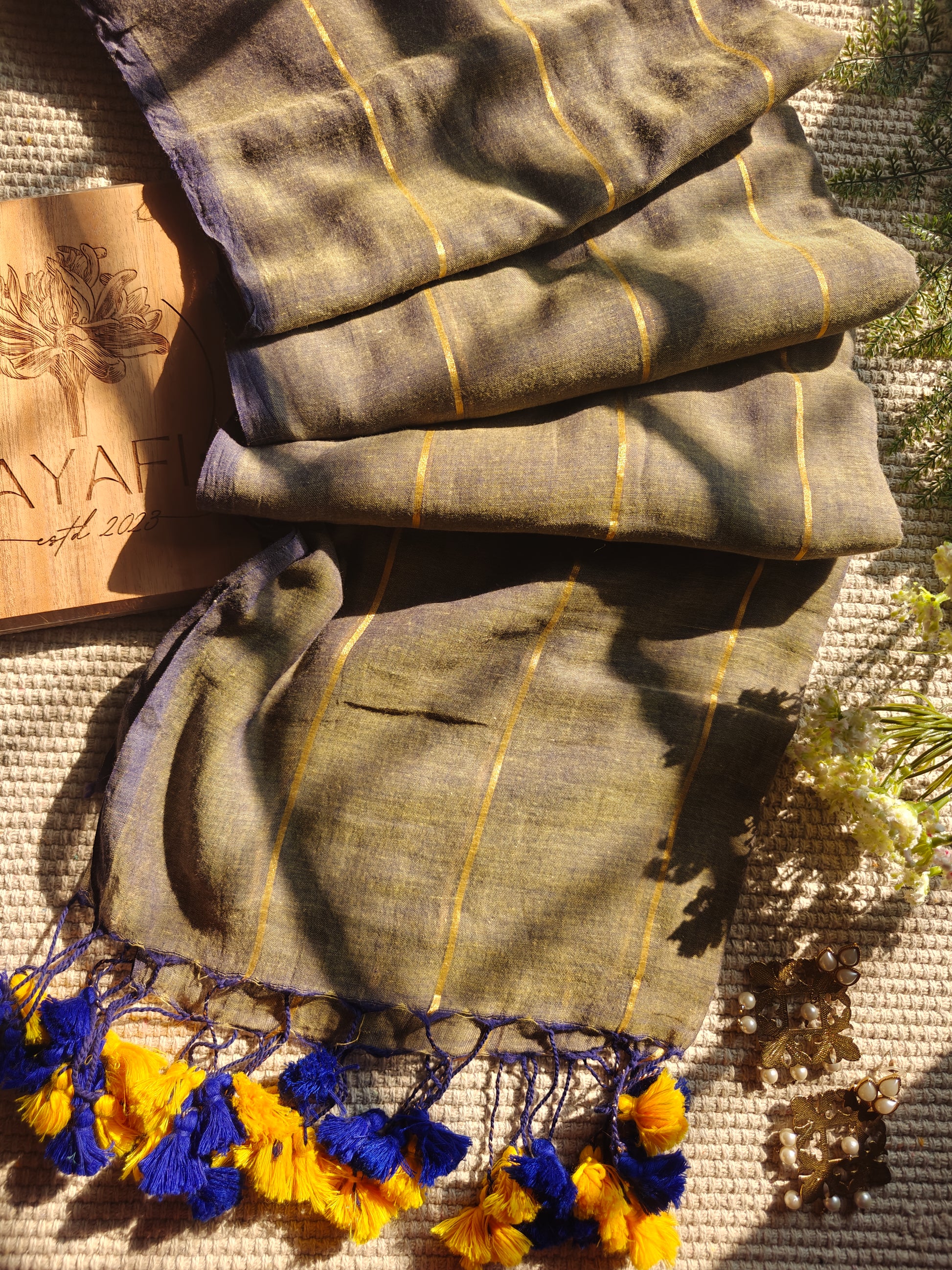The fine texture of the fabric adds a touch of sophistication to the ensemble, making it perfect for any occasion, whether it's a casual daytime affair or a glamorous evening event. The intricate zari stripes woven into the fabric add a touch of opulence to the saree and the shimmering gold threads catch the light with every movement.