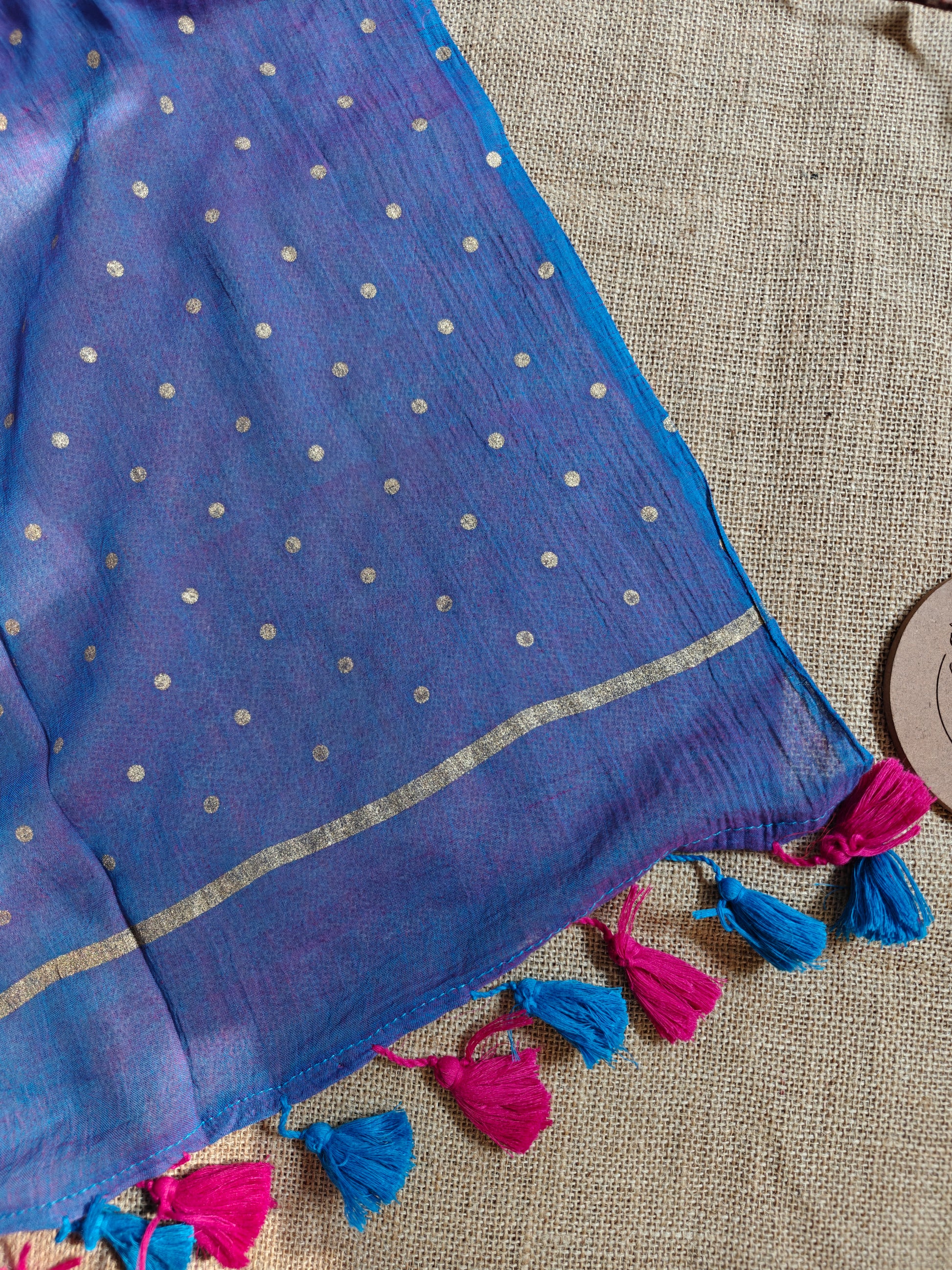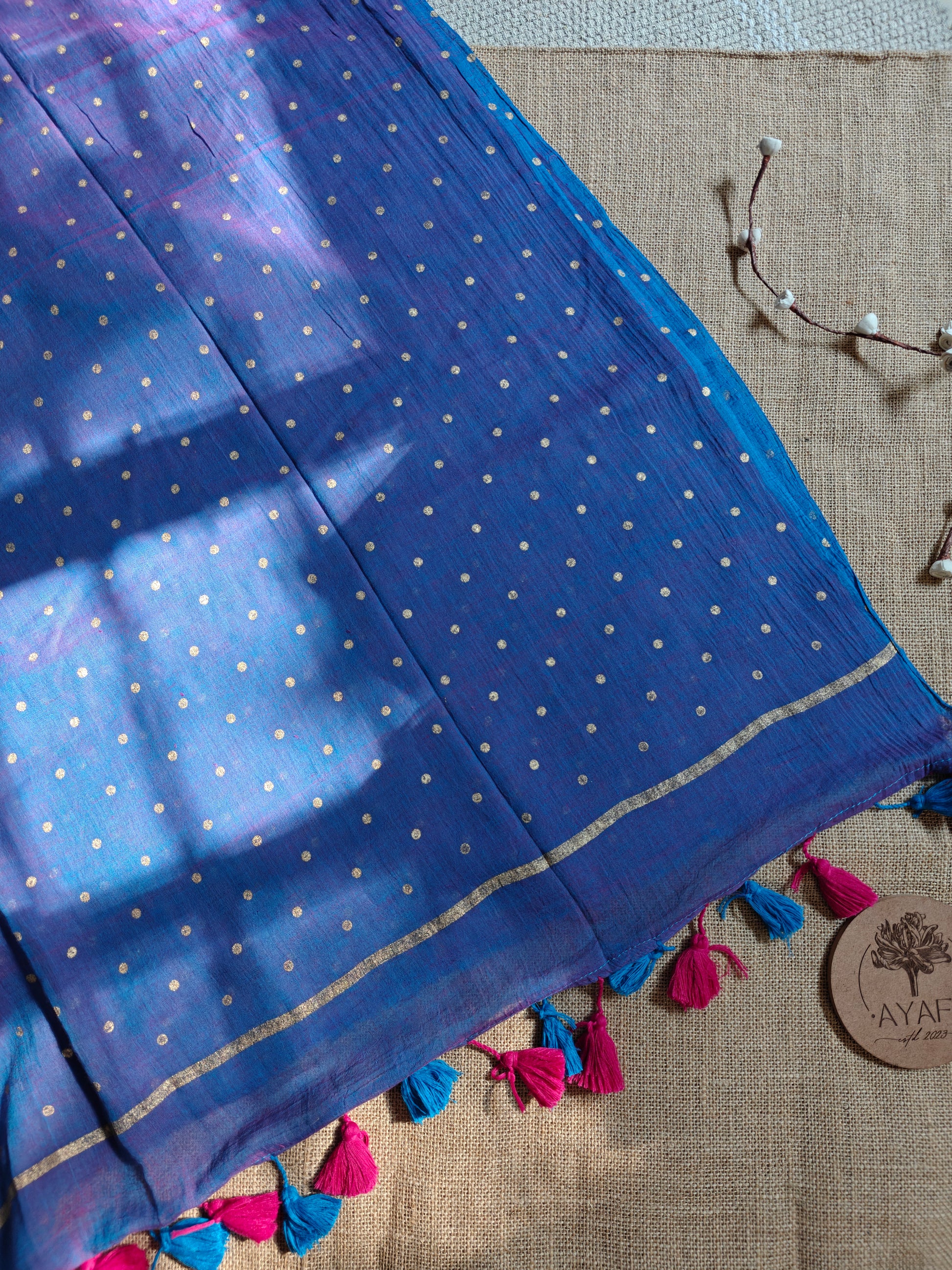 Pop goes the Polka! — where comfort meets festive charm. Handcrafted from fine mul cotton, this saree features gold foil-printed polka dots scattered across the drape like drops of sunlight.