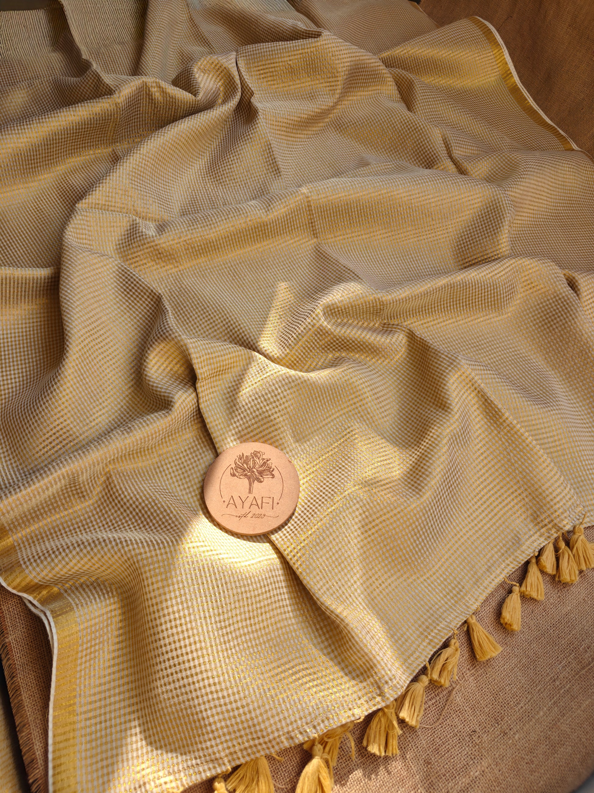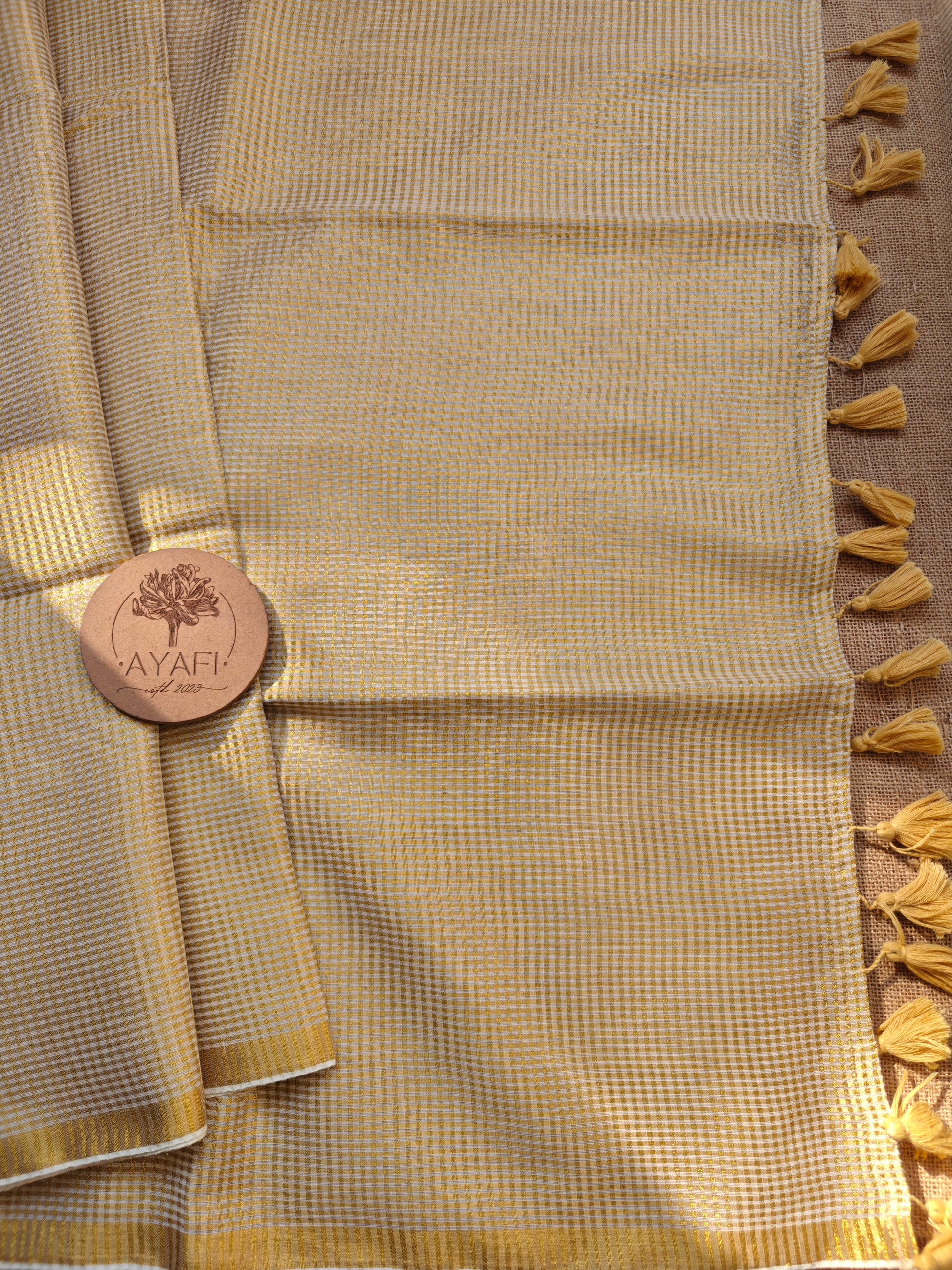 This saree is elevated with a traditional zari checks and gold border, finished handcrafted tassels that add just the right hint of festive charm. Rooted in South Indian aesthetics, this saree is perfect for women who appreciate minimal elegance with cultural depth.