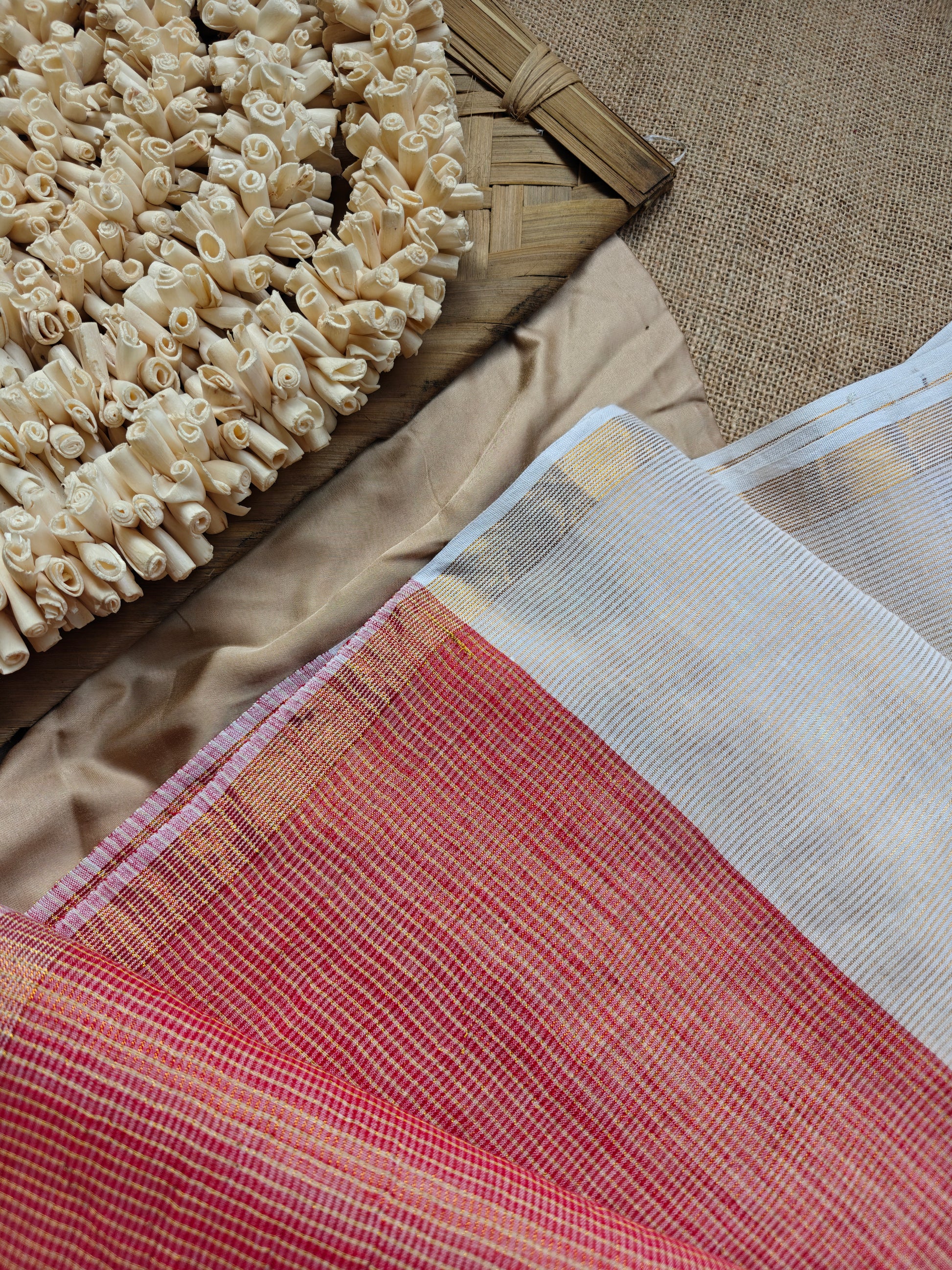 This saree is elevated with a traditional gold zari border, finished with a bold red edging and handcrafted tassels that add just the right hint of festive charm. Rooted in South Indian aesthetics, this saree is perfect for women who appreciate minimal elegance with cultural depth.
