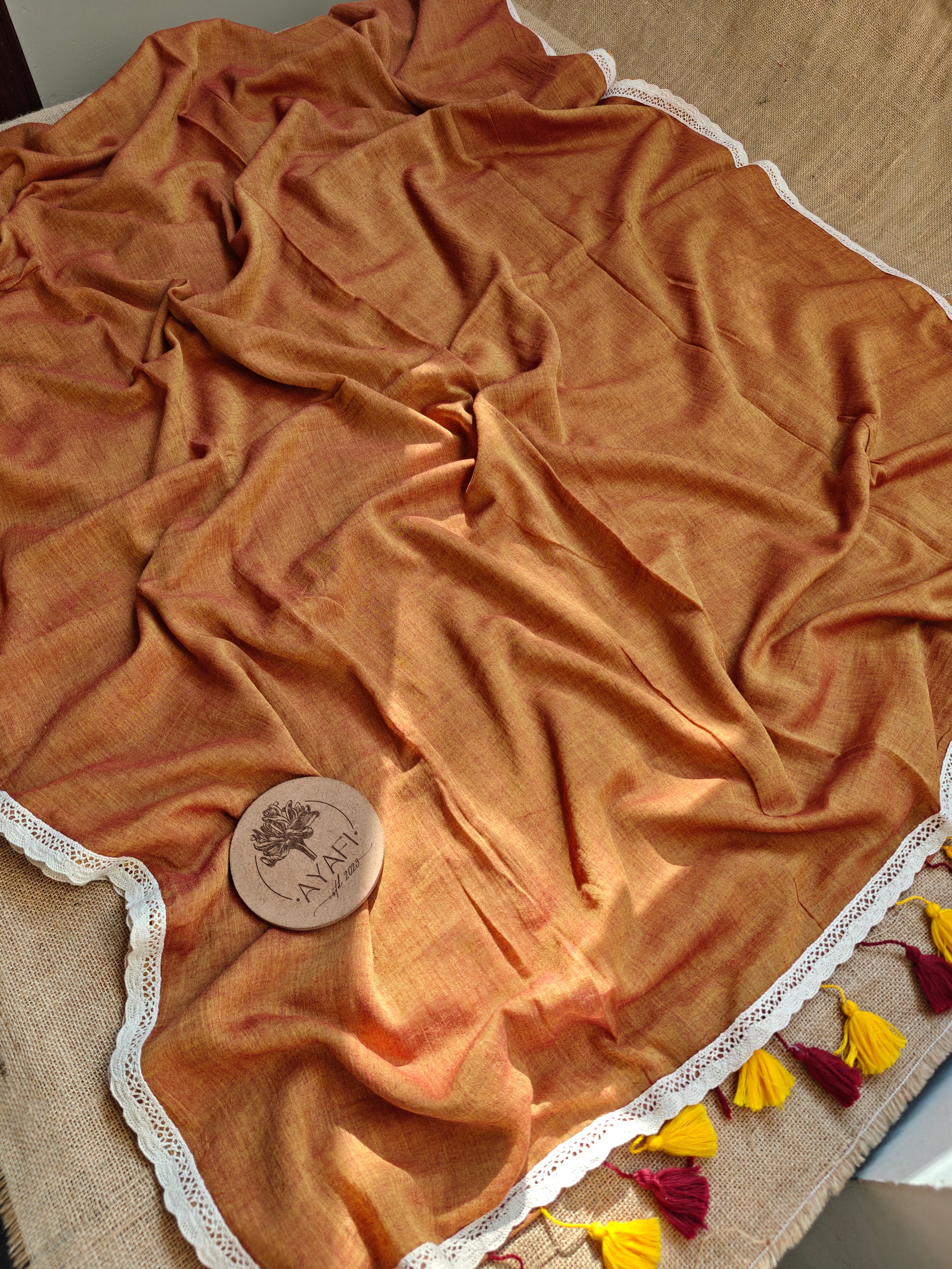 Finished with an elegant lace border that adds a touch of delicate detail, the saree is further enhanced with handmade tassels at the pallu, lending a subtle artisanal charm. Graceful and versatile, this mul saree moves seamlessly from casual gatherings to understated festive moments, embodying timeless simplicity with a refined finish.