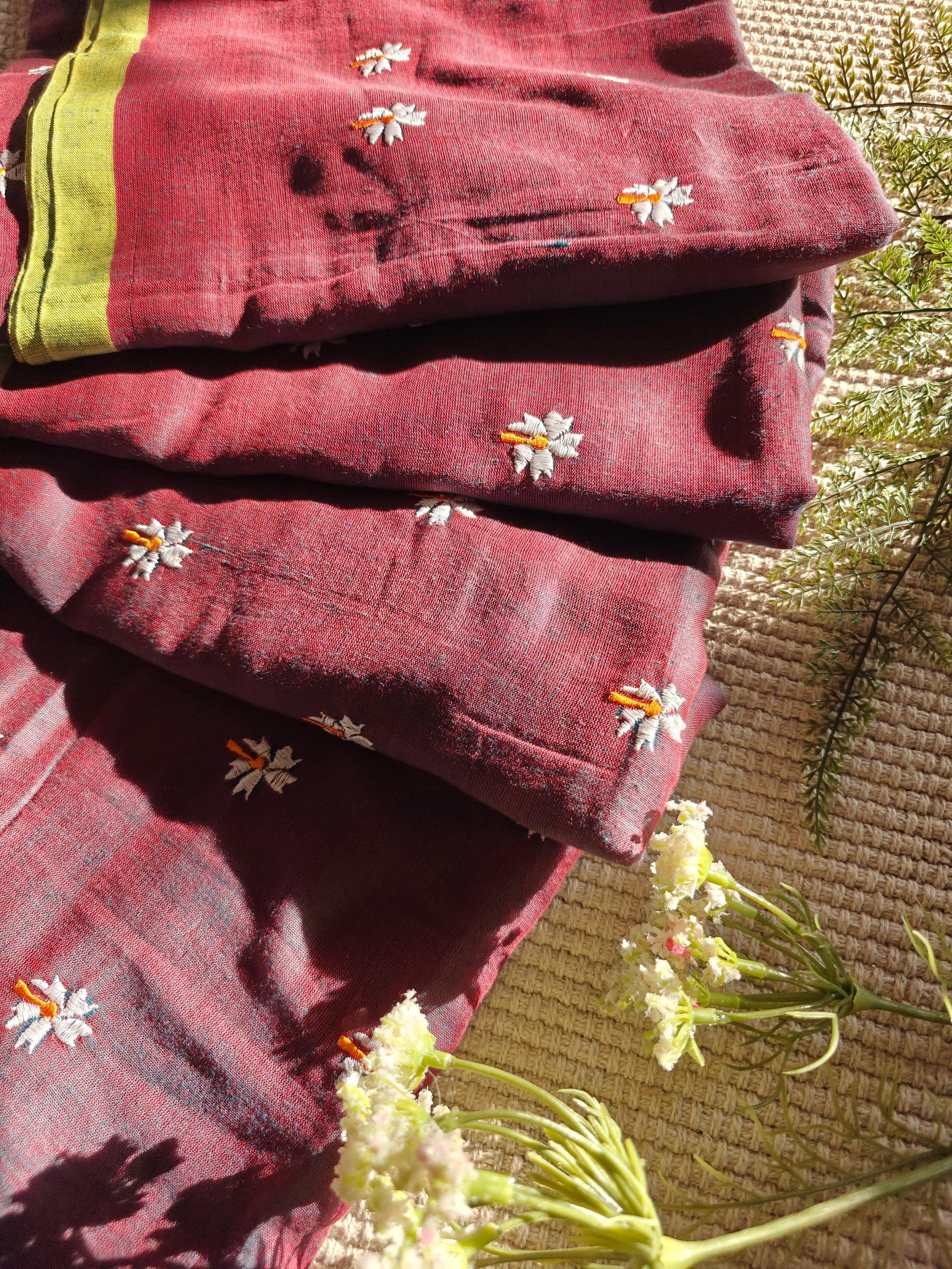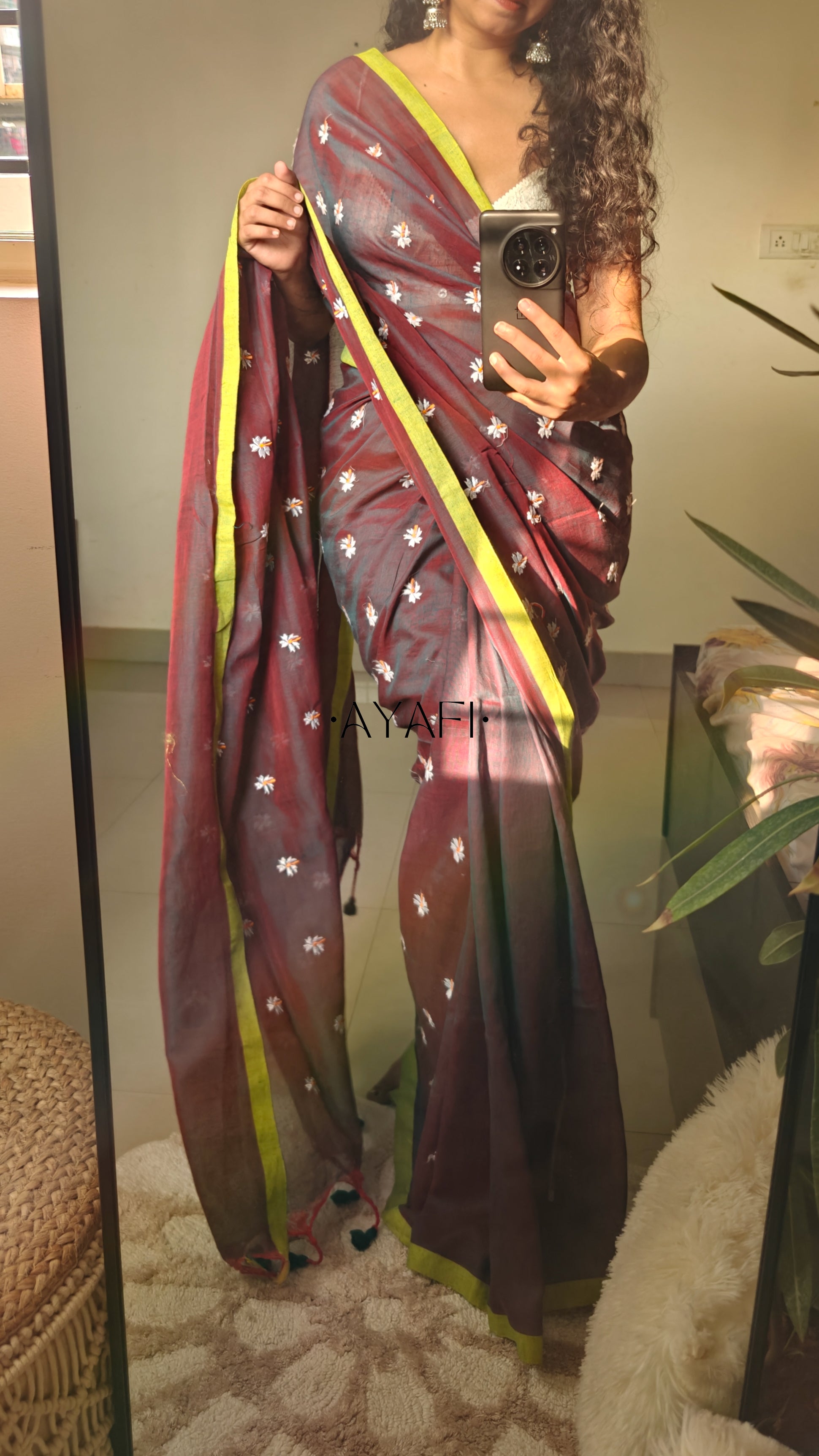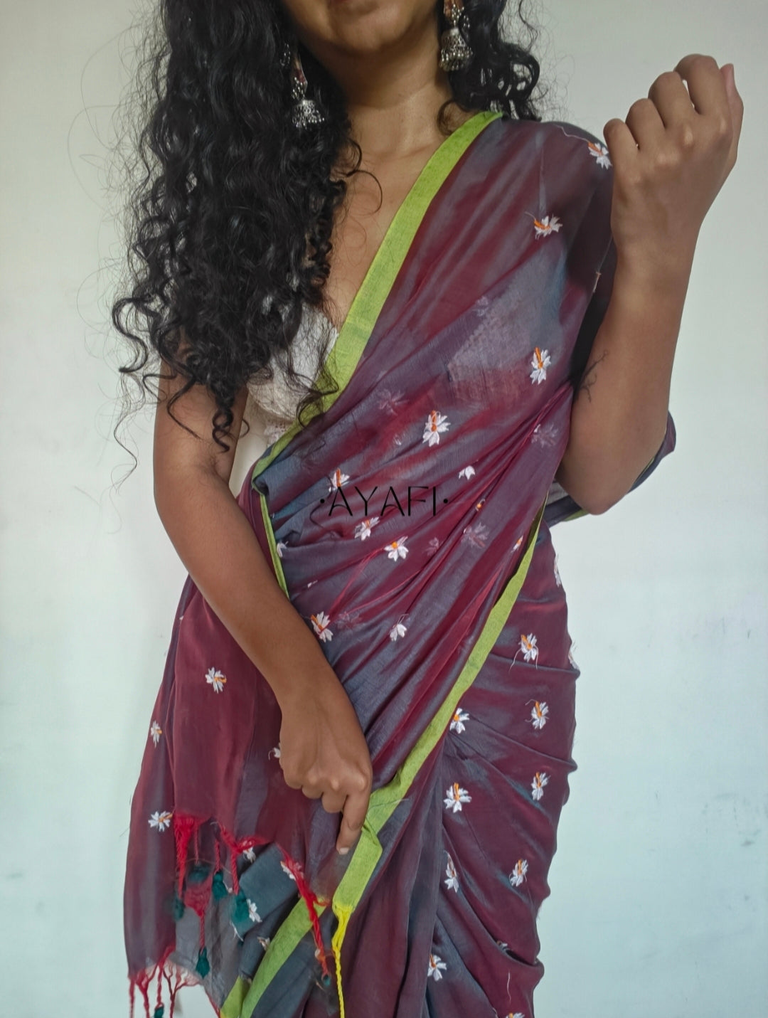 Introducing ‘FLORA’ Embroidered Mul Cotton Saree. What sets this saree apart is its intricate embroidery, meticulously woven by the loom to adorn the fabric with exquisite floral motifs.
