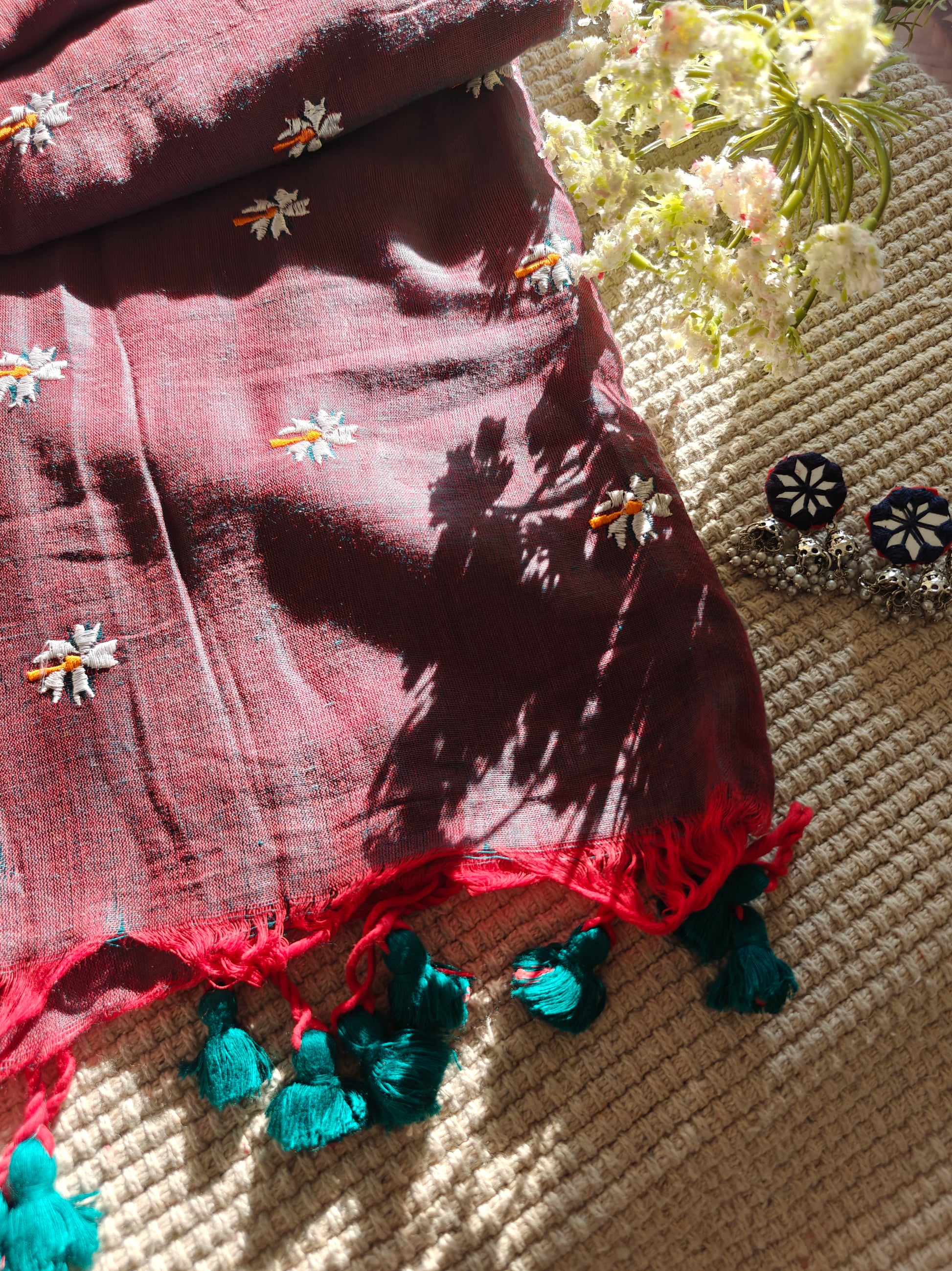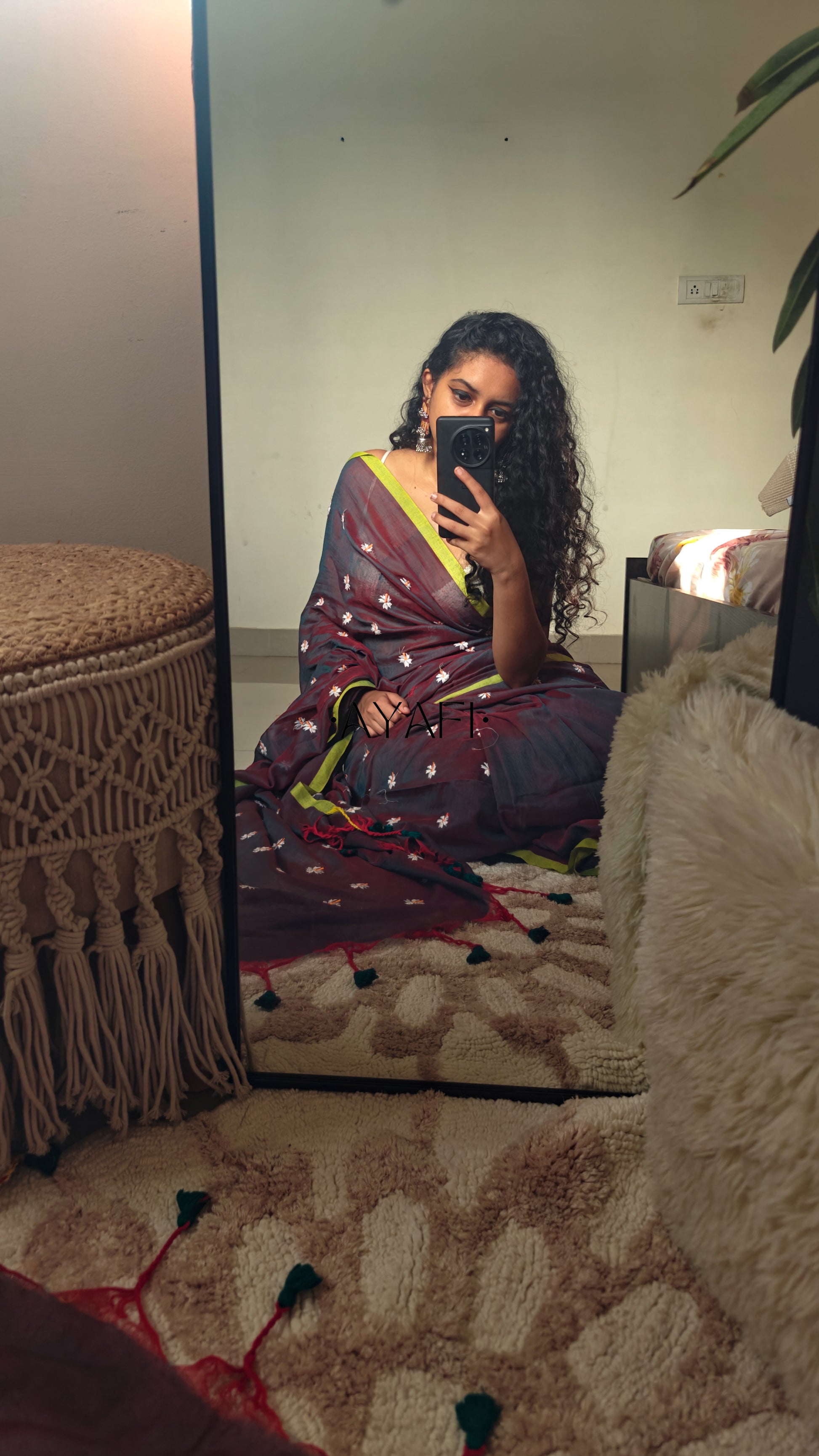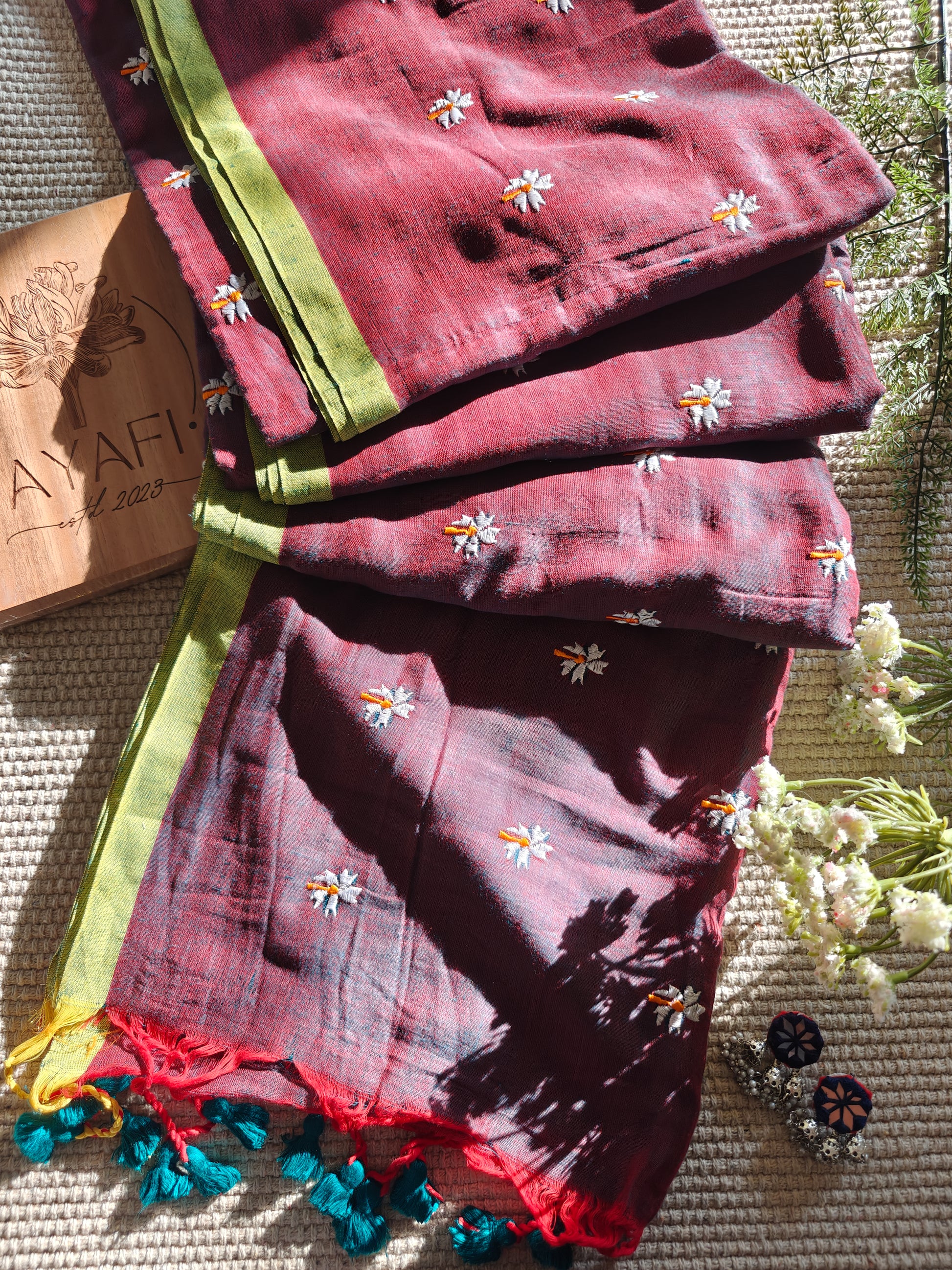 Introducing ‘FLORA’ Embroidered Mul Cotton Saree. What sets this saree apart is its intricate embroidery, meticulously woven by the loom to adorn the fabric with exquisite floral motifs.