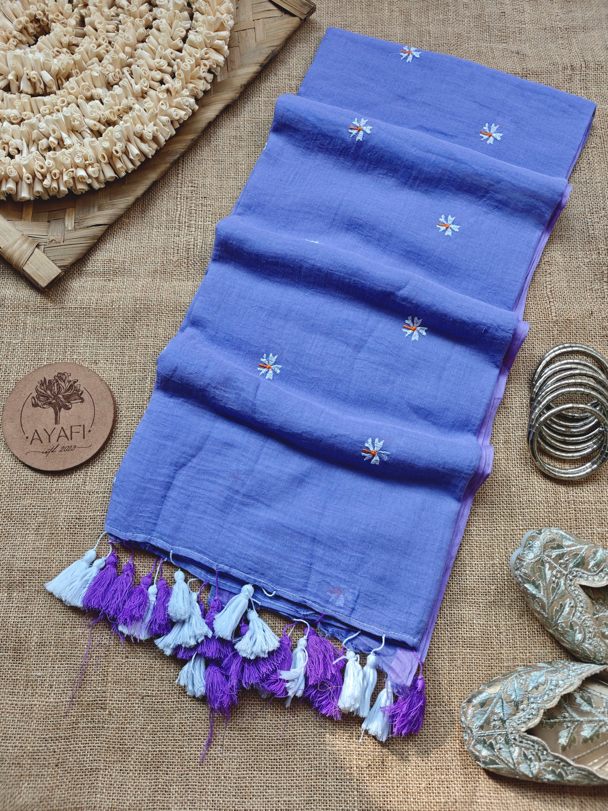 Introducing ‘FLORA’ Embroidered Mul Cotton Saree. What sets this saree apart is its intricate embroidery, meticulously woven by the loom to adorn the pallu and pleats with exquisite floral motifs.