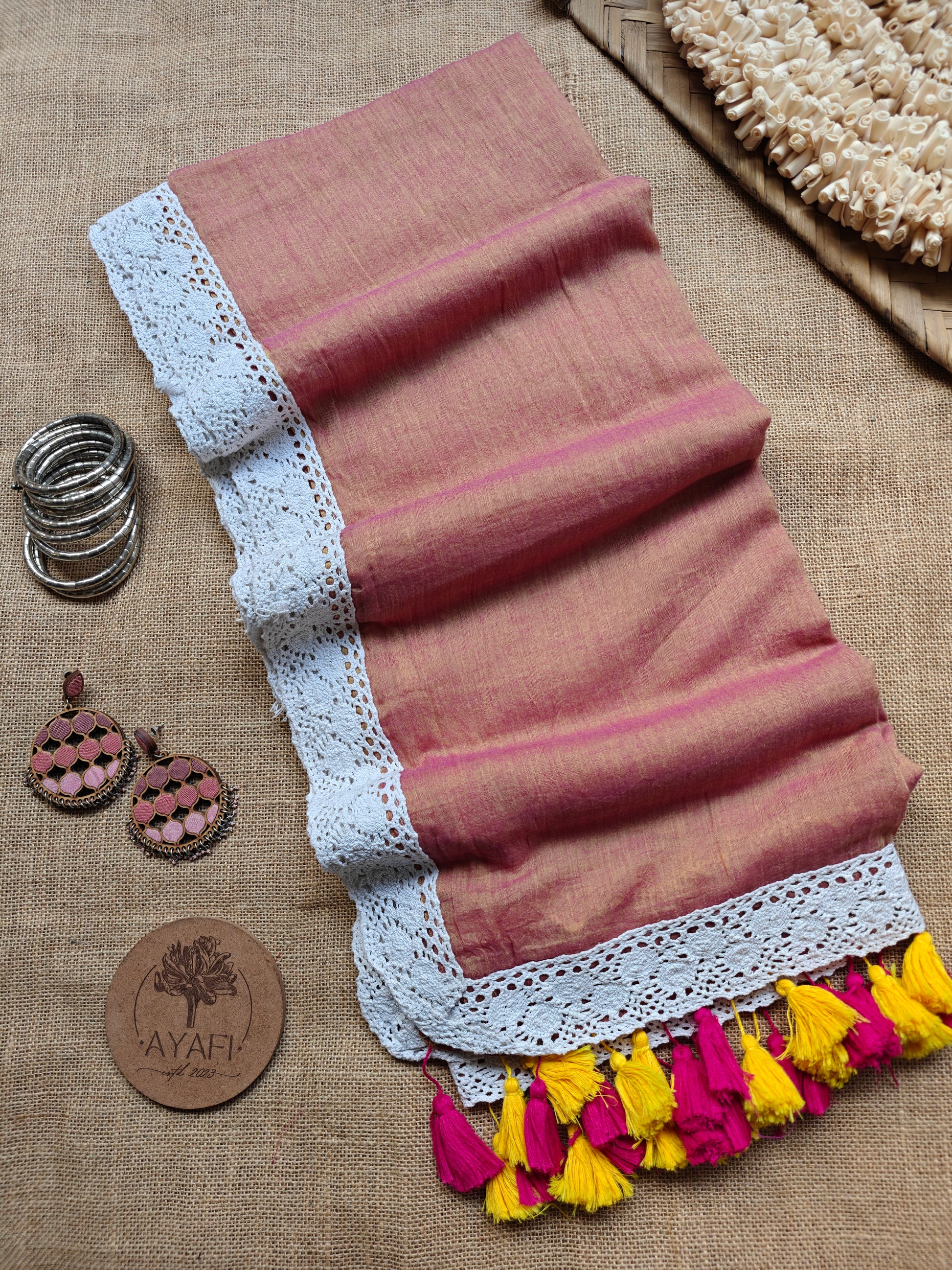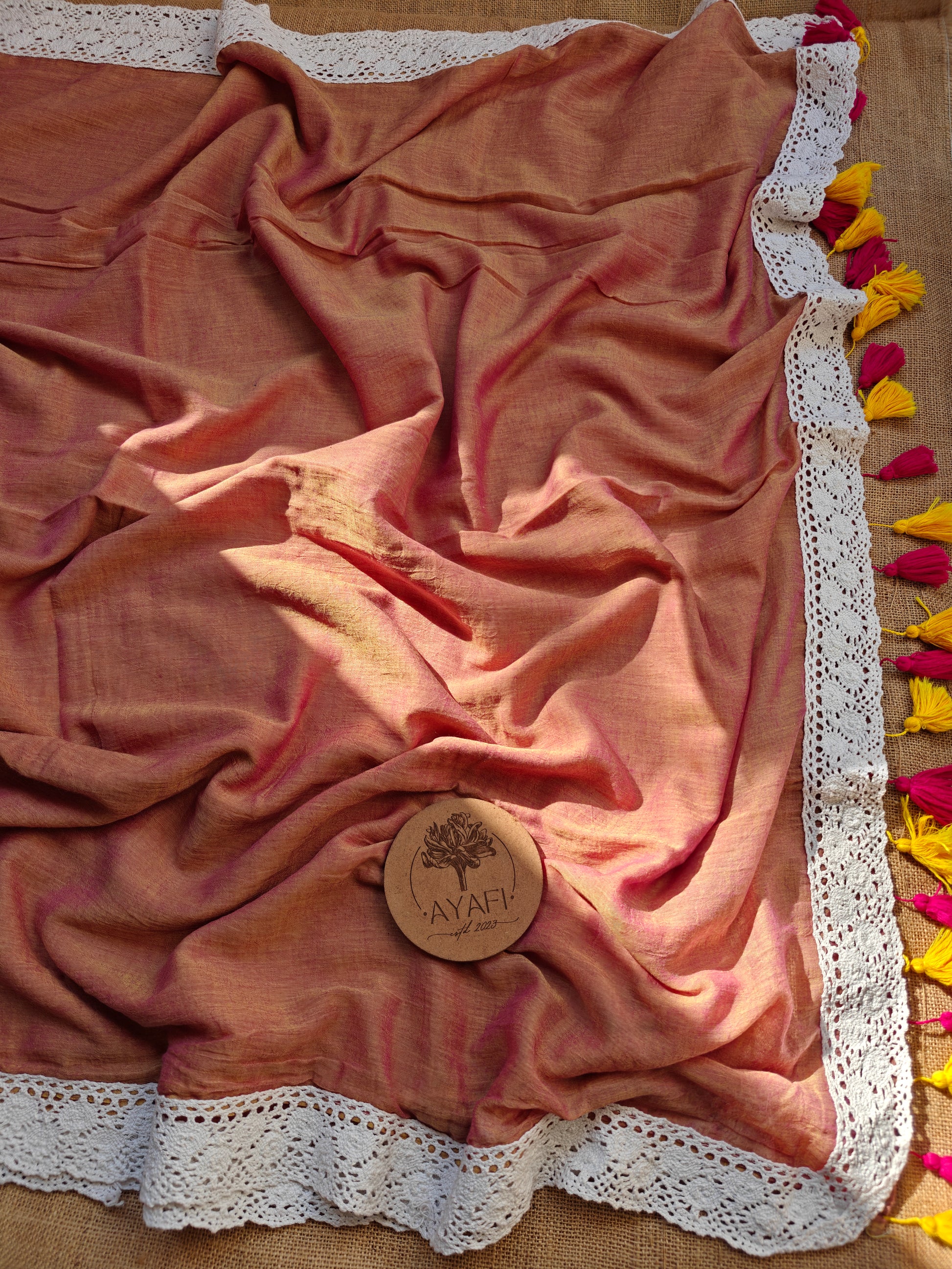 Finished with an elegant lace border that adds a touch of delicate detail, the saree is further enhanced with handmade tassels at the pallu, lending a subtle artisanal charm. Graceful and versatile, this mul saree moves seamlessly from casual gatherings to understated festive moments, embodying timeless simplicity with a refined finish.