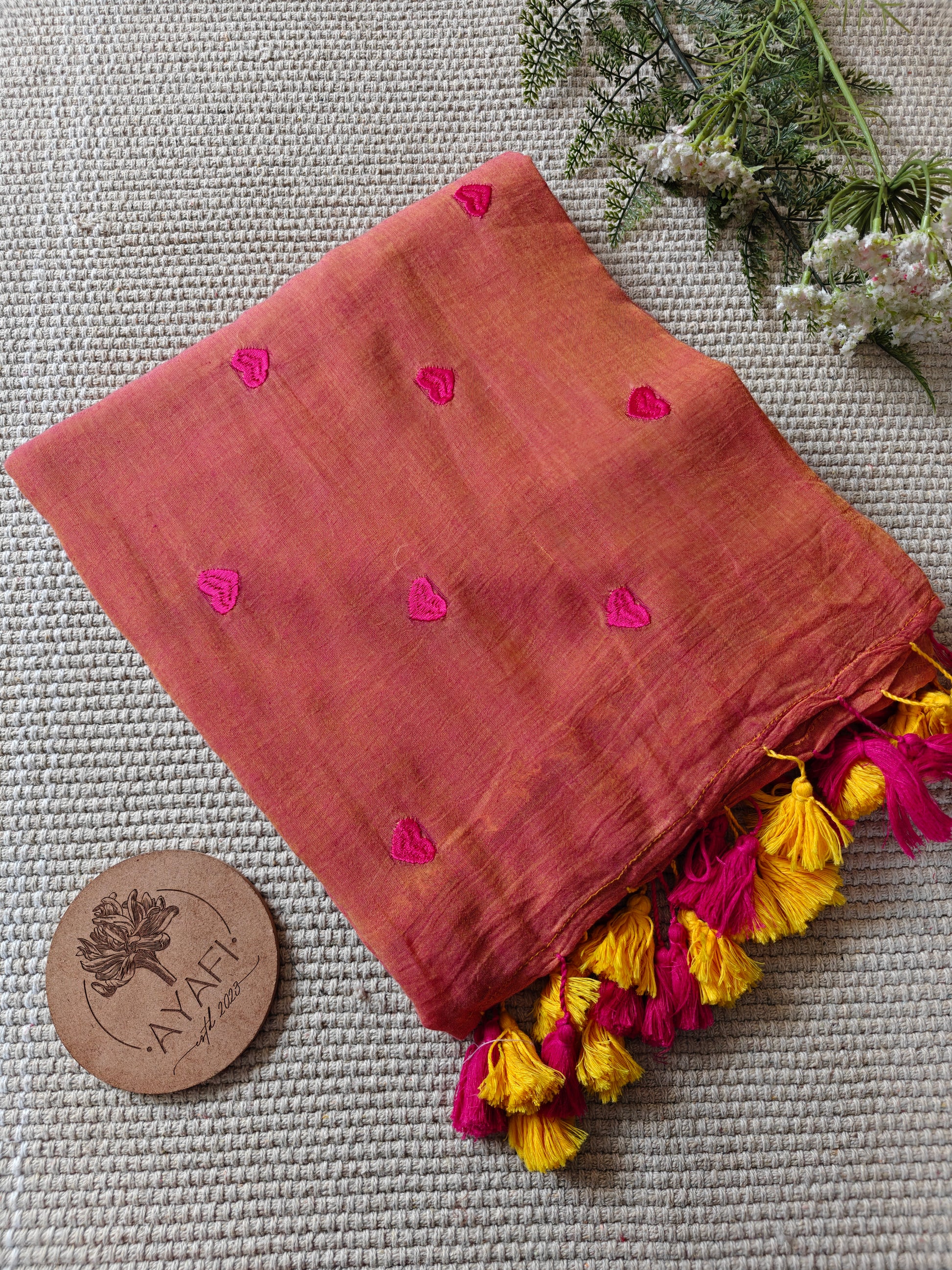 Introducing our exquisite ‘LOVE’ Embroidered Mul Cotton Saree. What sets this saree apart is its intricate embroidery, meticulously woven by the loom to adorn the fabric with beautiful Heart motifs.