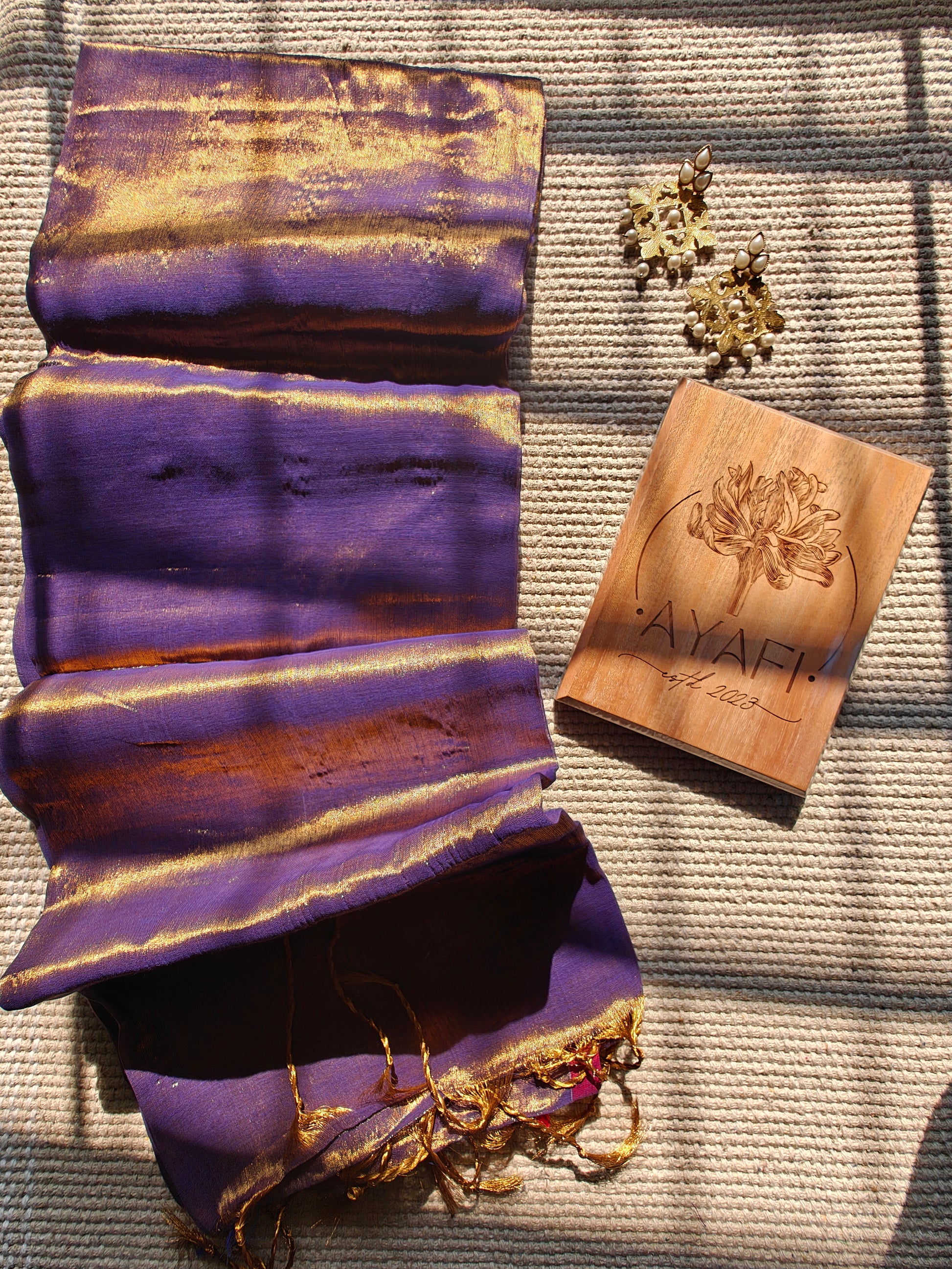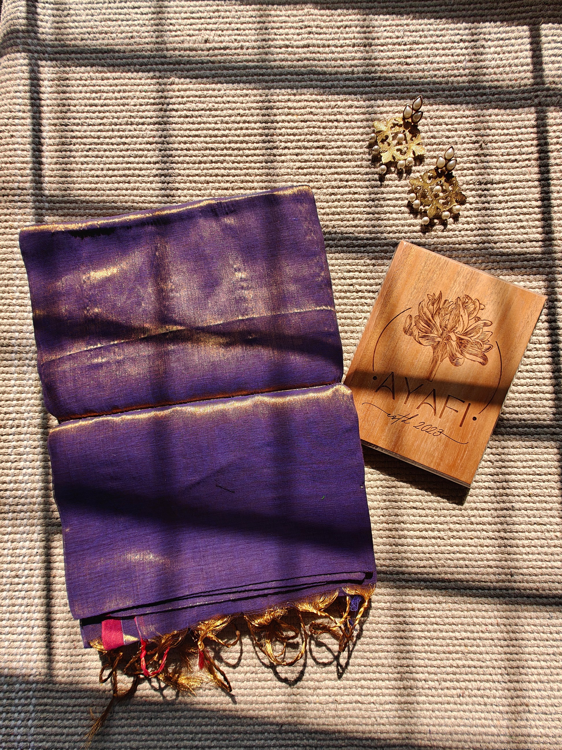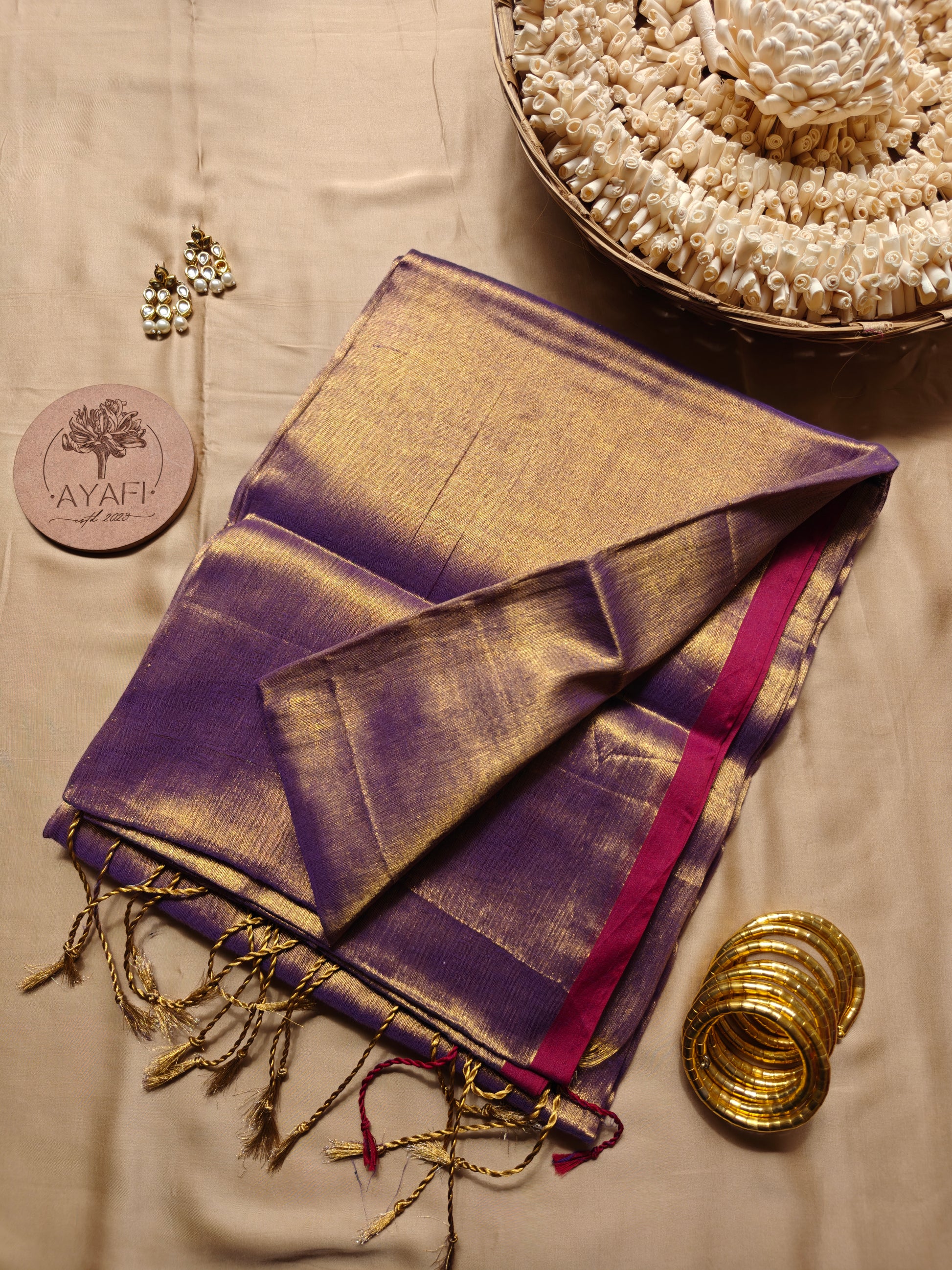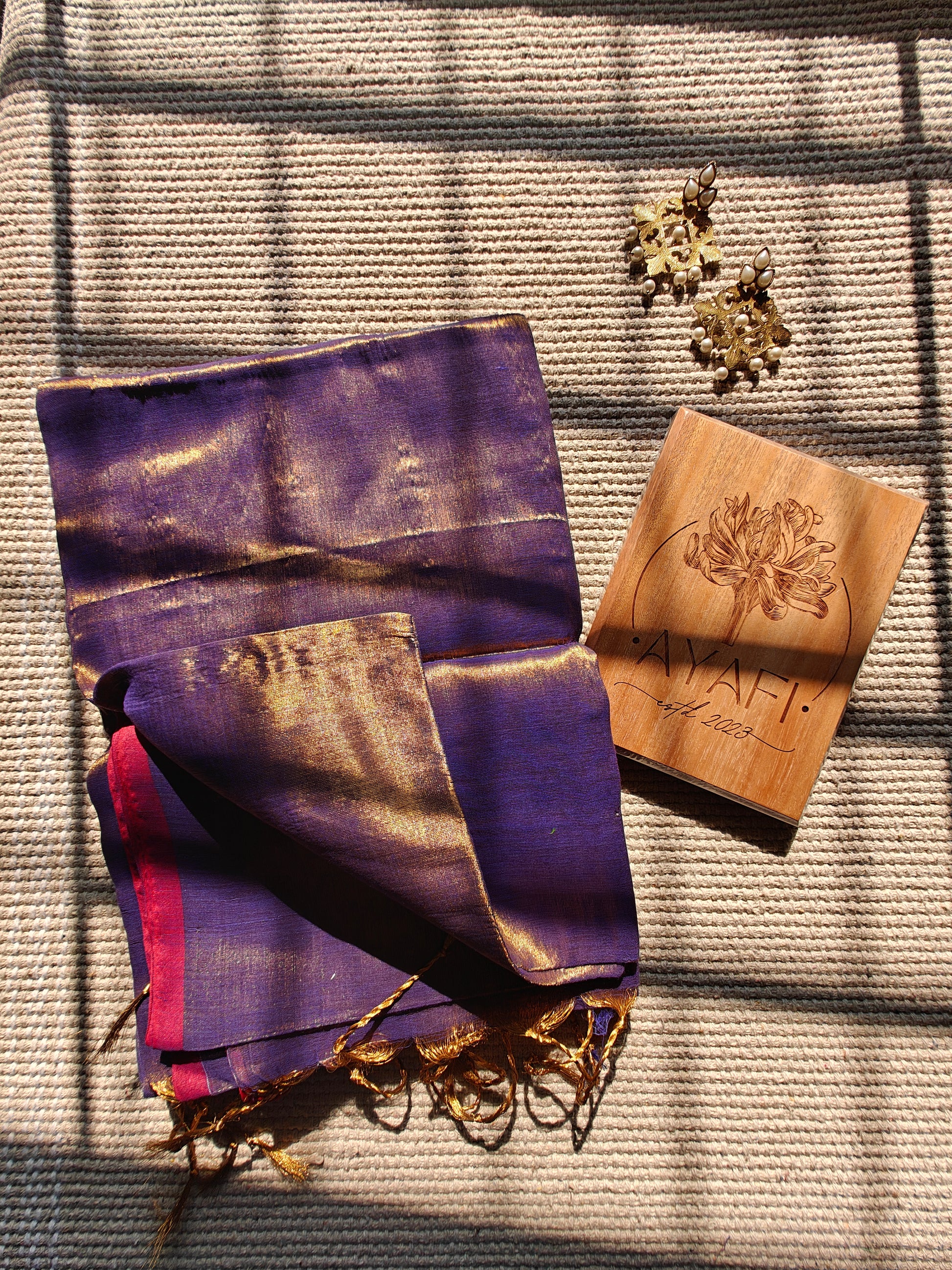 A stunning mul saree with opulent zari interspersed in the weave that brings about a captivating glossy sheen.