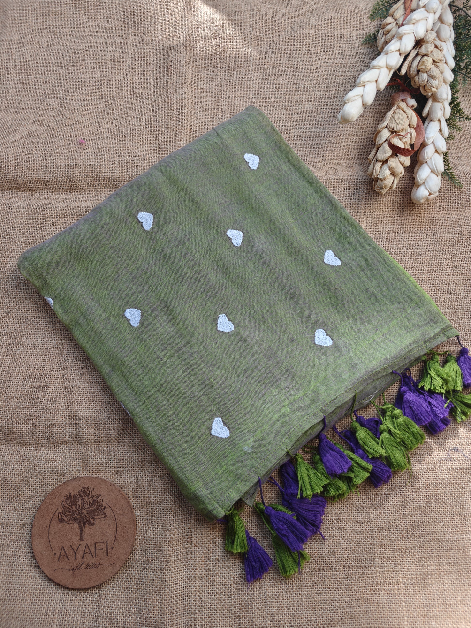Introducing our exquisite ‘LOVE’ Embroidered Mul Cotton Saree. What sets this saree apart is its intricate embroidery, meticulously woven by the loom to adorn the fabric with beautiful Heart motifs.