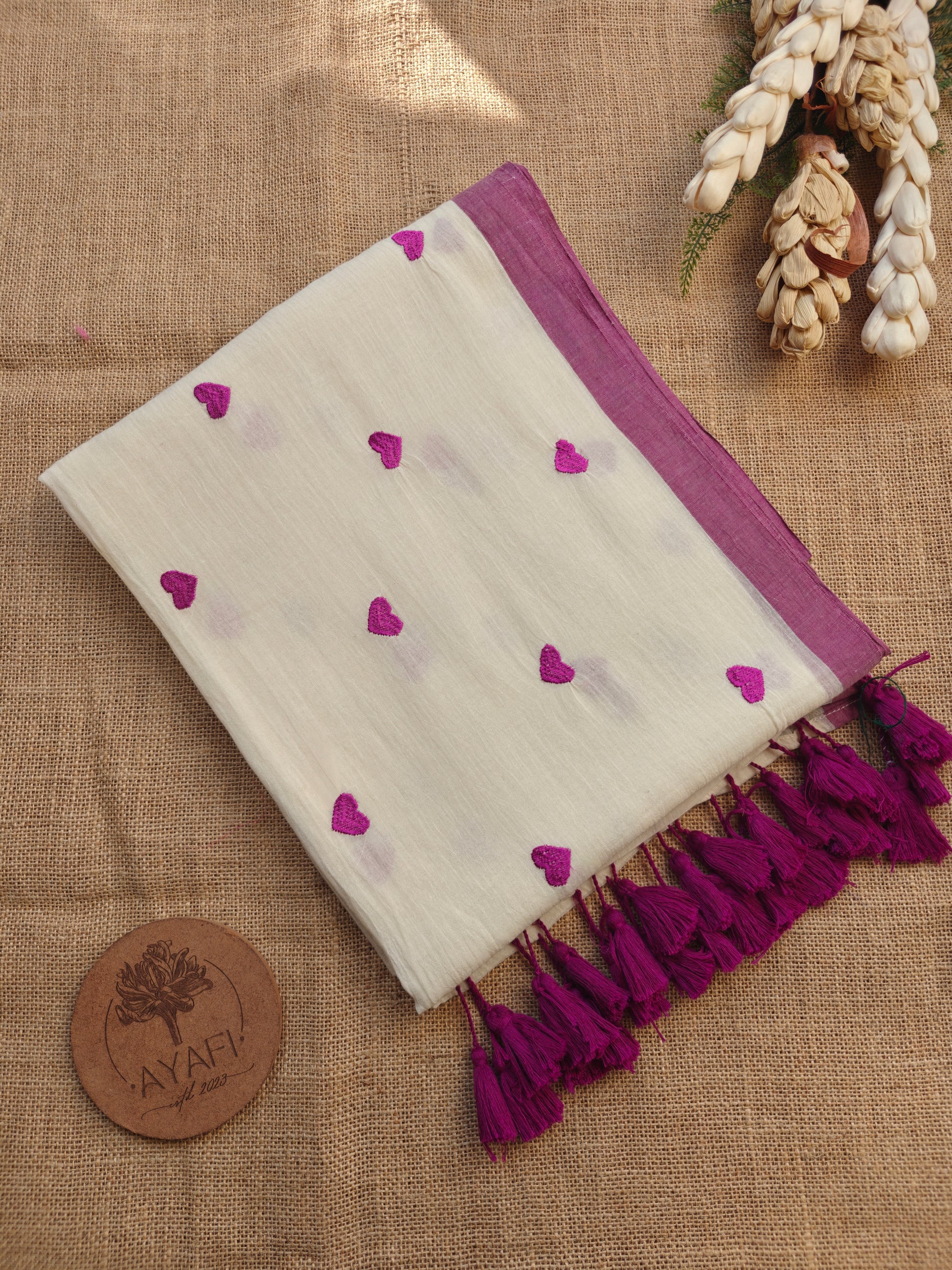 Introducing our exquisite ‘LOVE’ Embroidered Mul Cotton Saree. What sets this saree apart is its intricate embroidery, meticulously woven by the loom to adorn the fabric with beautiful Heart motifs.