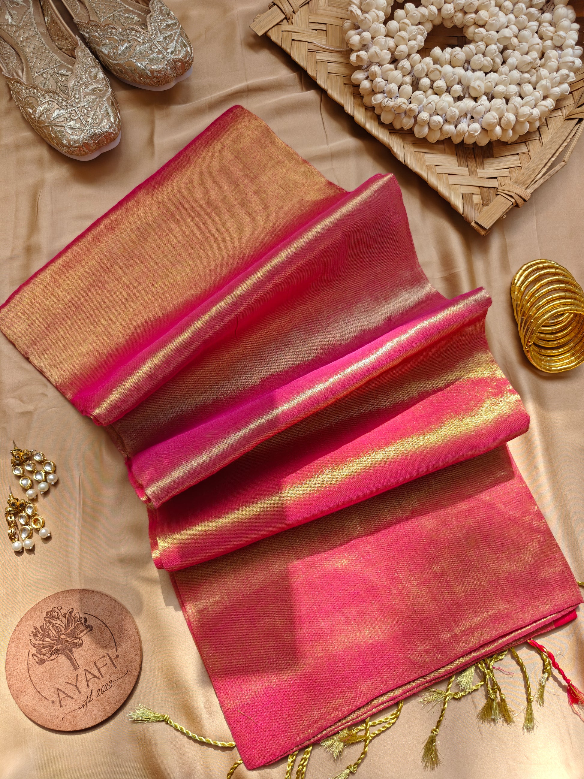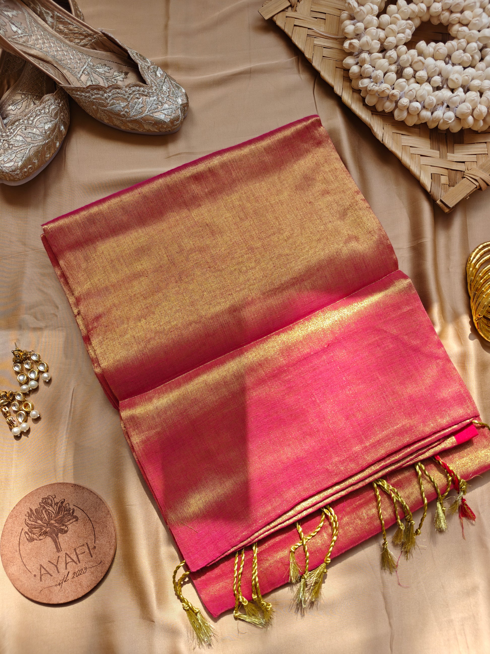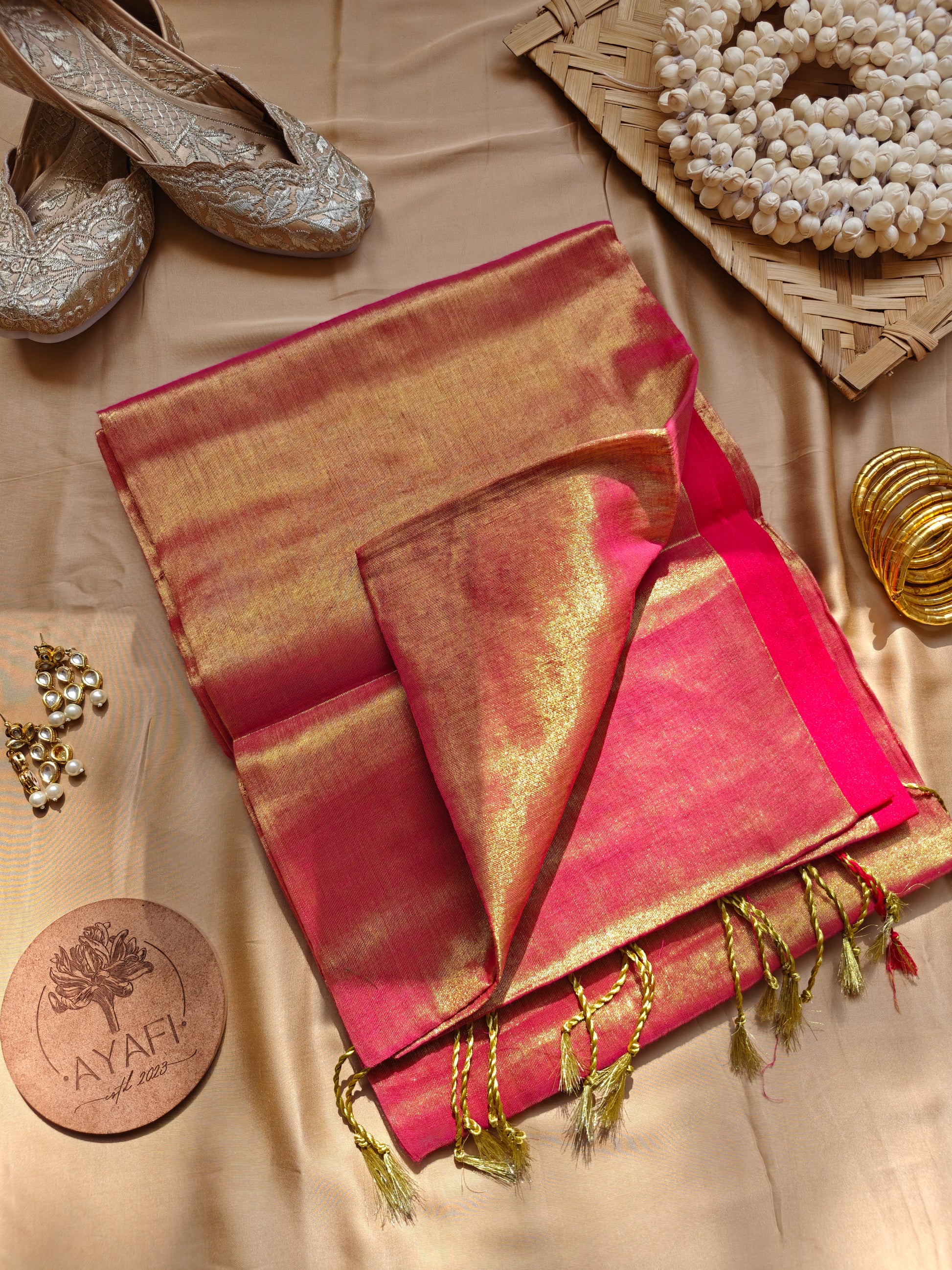 A stunning mul saree with opulent zari interspersed in the weave that brings about a captivating glossy sheen.