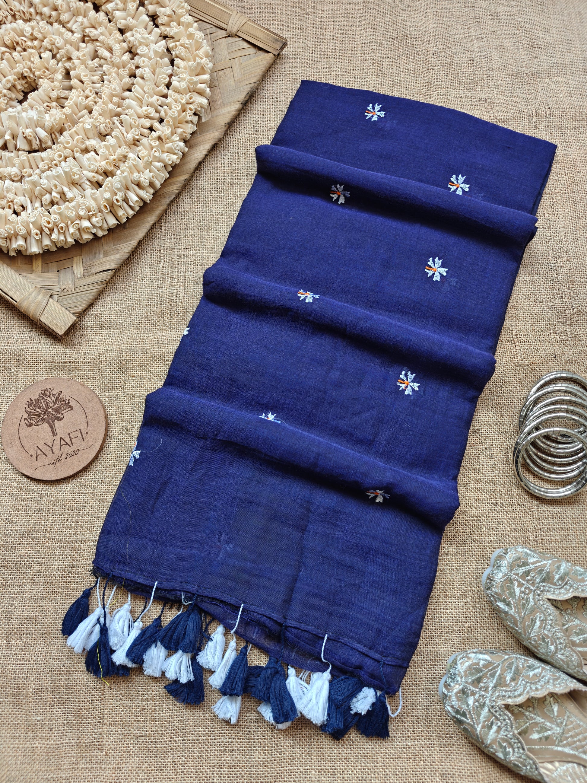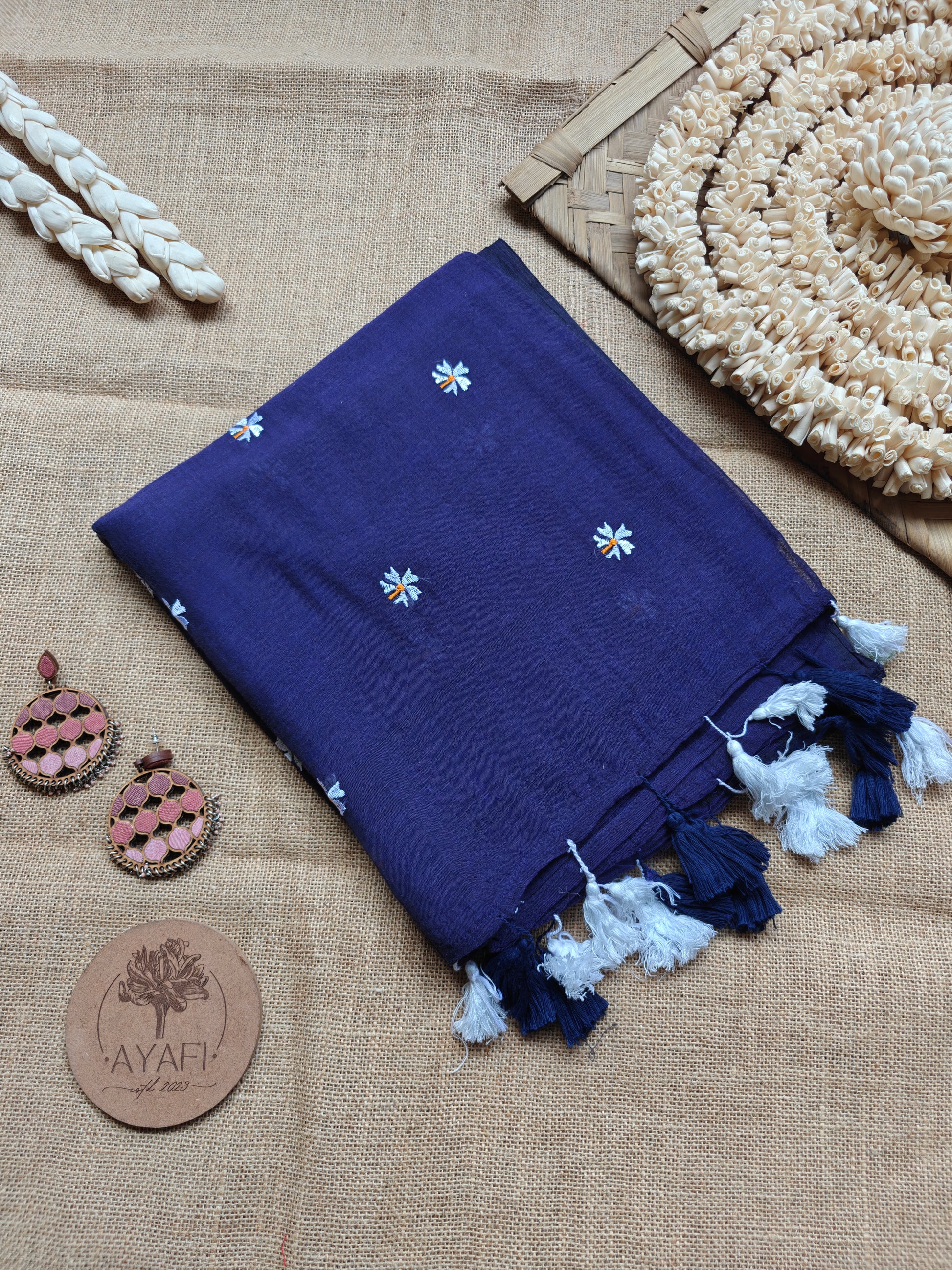Introducing ‘FLORA’ Embroidered Mul Cotton Saree. What sets this saree apart is its intricate embroidery, meticulously woven by the loom to adorn the pallu and pleats with exquisite floral motifs.
