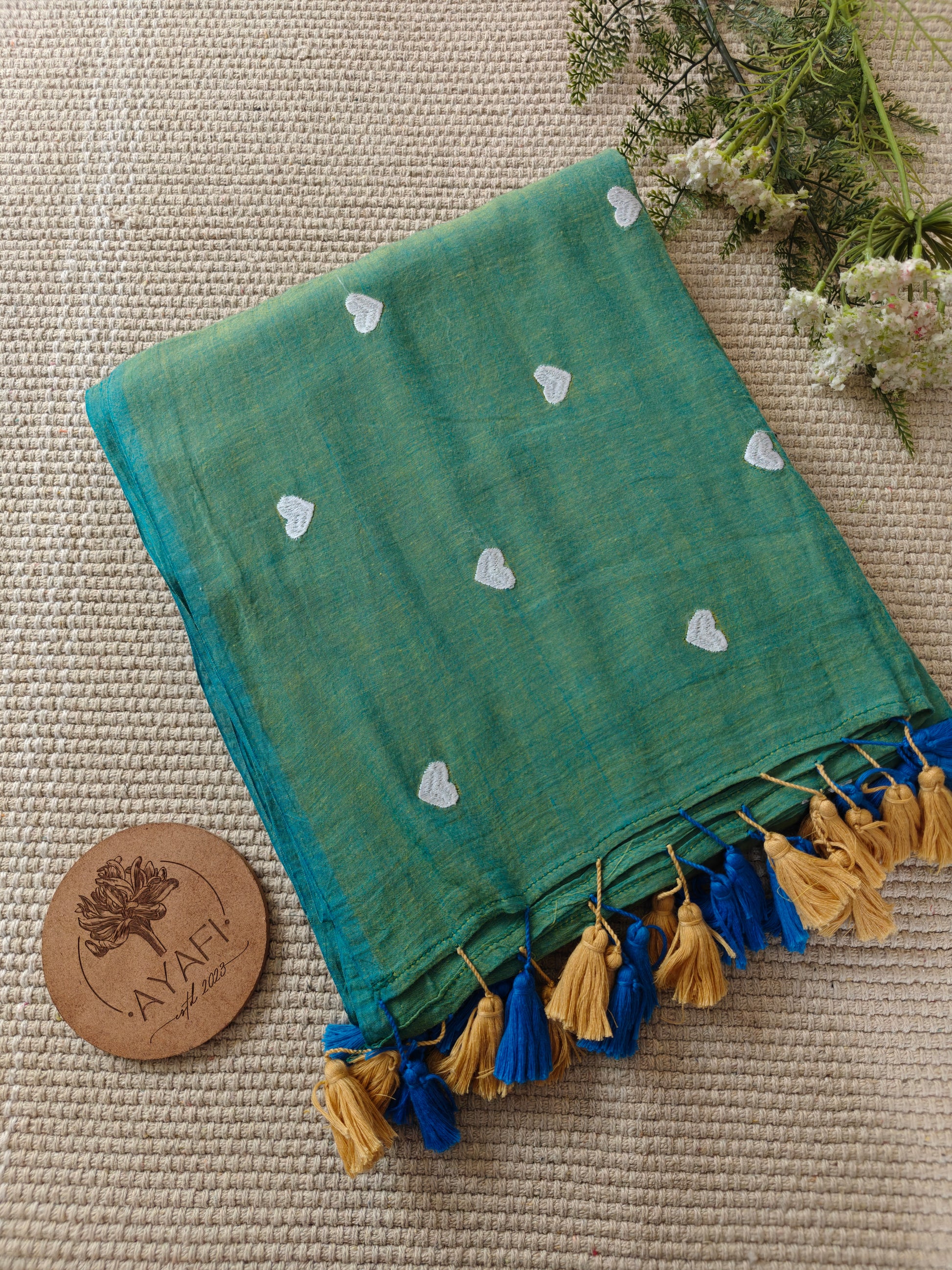 Introducing our exquisite ‘LOVE’ Embroidered Mul Cotton Saree. What sets this saree apart is its intricate embroidery, meticulously woven by the loom to adorn the fabric with beautiful Heart motifs.