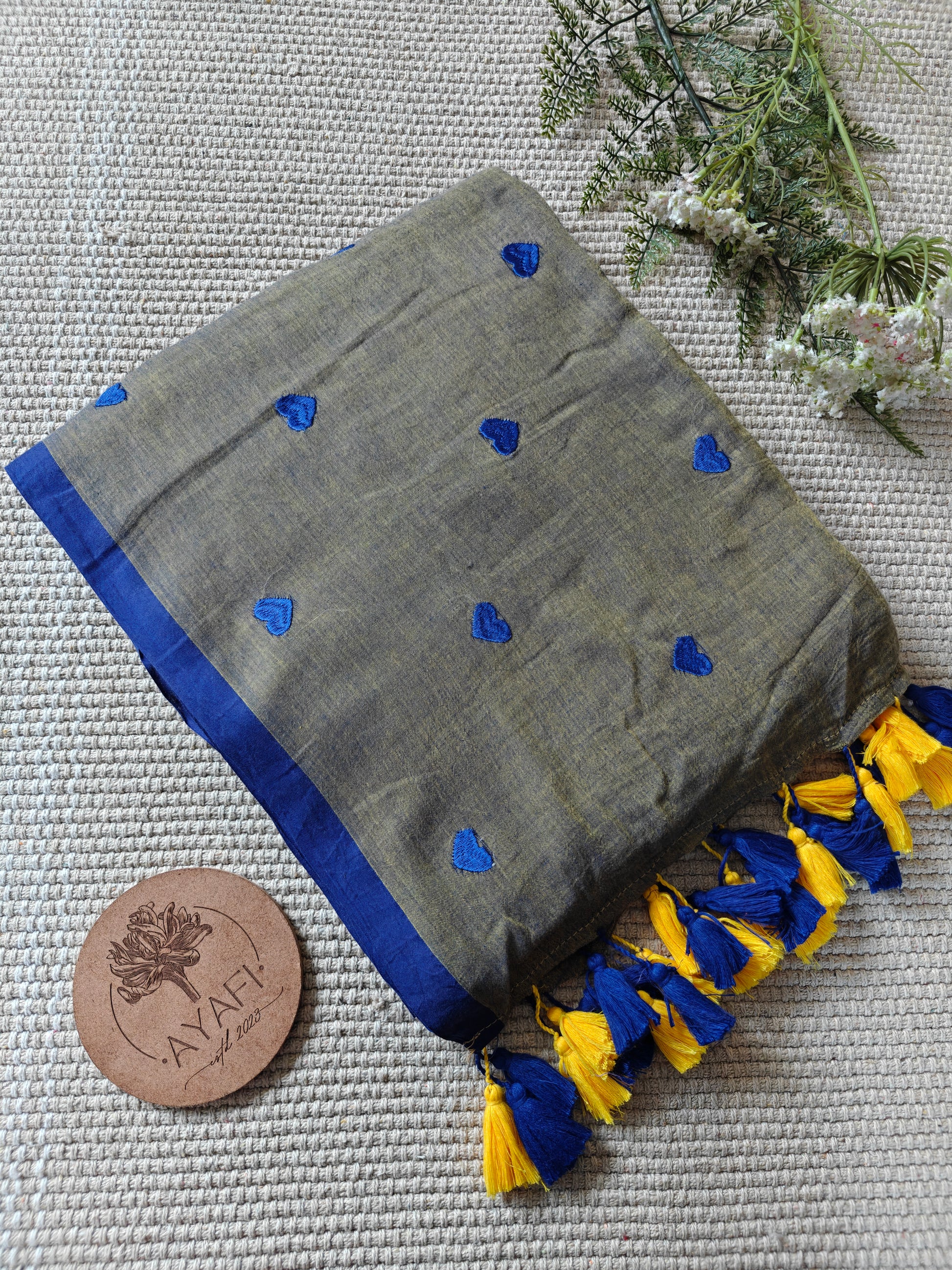 Introducing our exquisite ‘LOVE’ Embroidered Mul Cotton Saree. What sets this saree apart is its intricate embroidery, meticulously woven by the loom to adorn the fabric with beautiful Heart motifs.