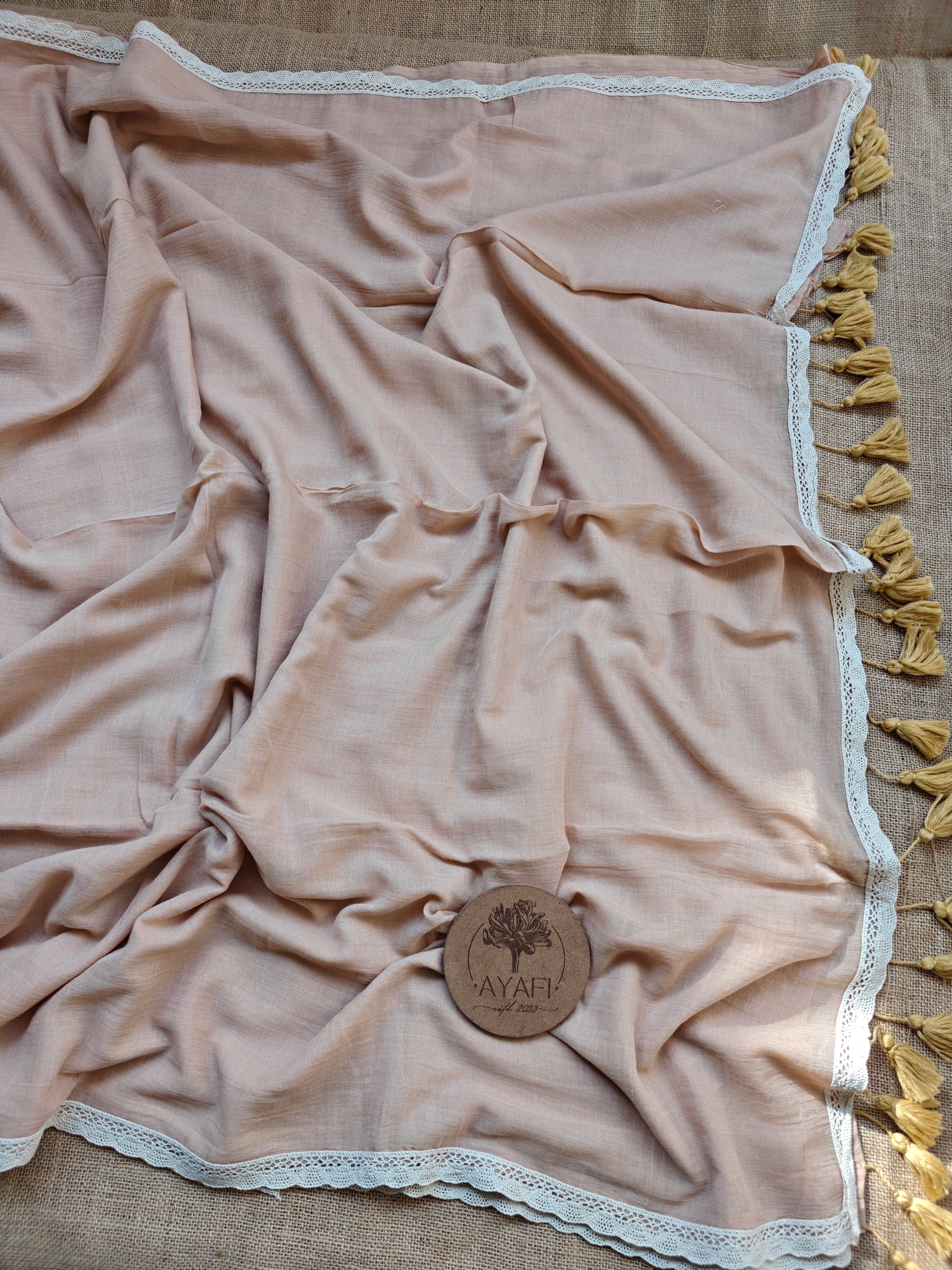 Finished with an elegant lace border that adds a touch of delicate detail, the saree is further enhanced with handmade tassels at the pallu, lending a subtle artisanal charm. Graceful and versatile, this mul saree moves seamlessly from casual gatherings to understated festive moments, embodying timeless simplicity with a refined finish.