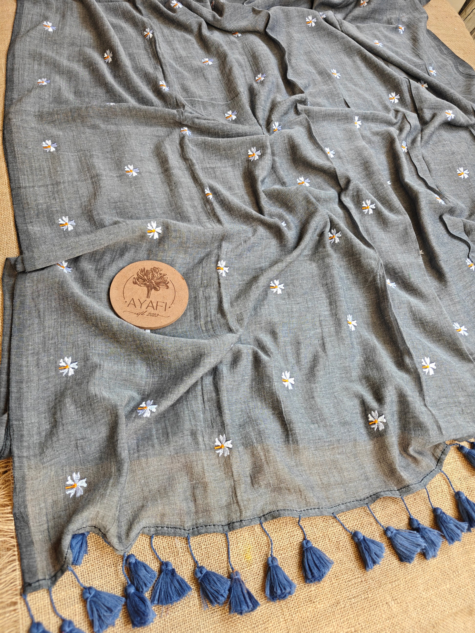 Introducing ‘FLORA’ Embroidered Mul Cotton Saree. What sets this saree apart is its intricate embroidery, meticulously woven by the loom to adorn the pallu and pleats with exquisite floral motifs.