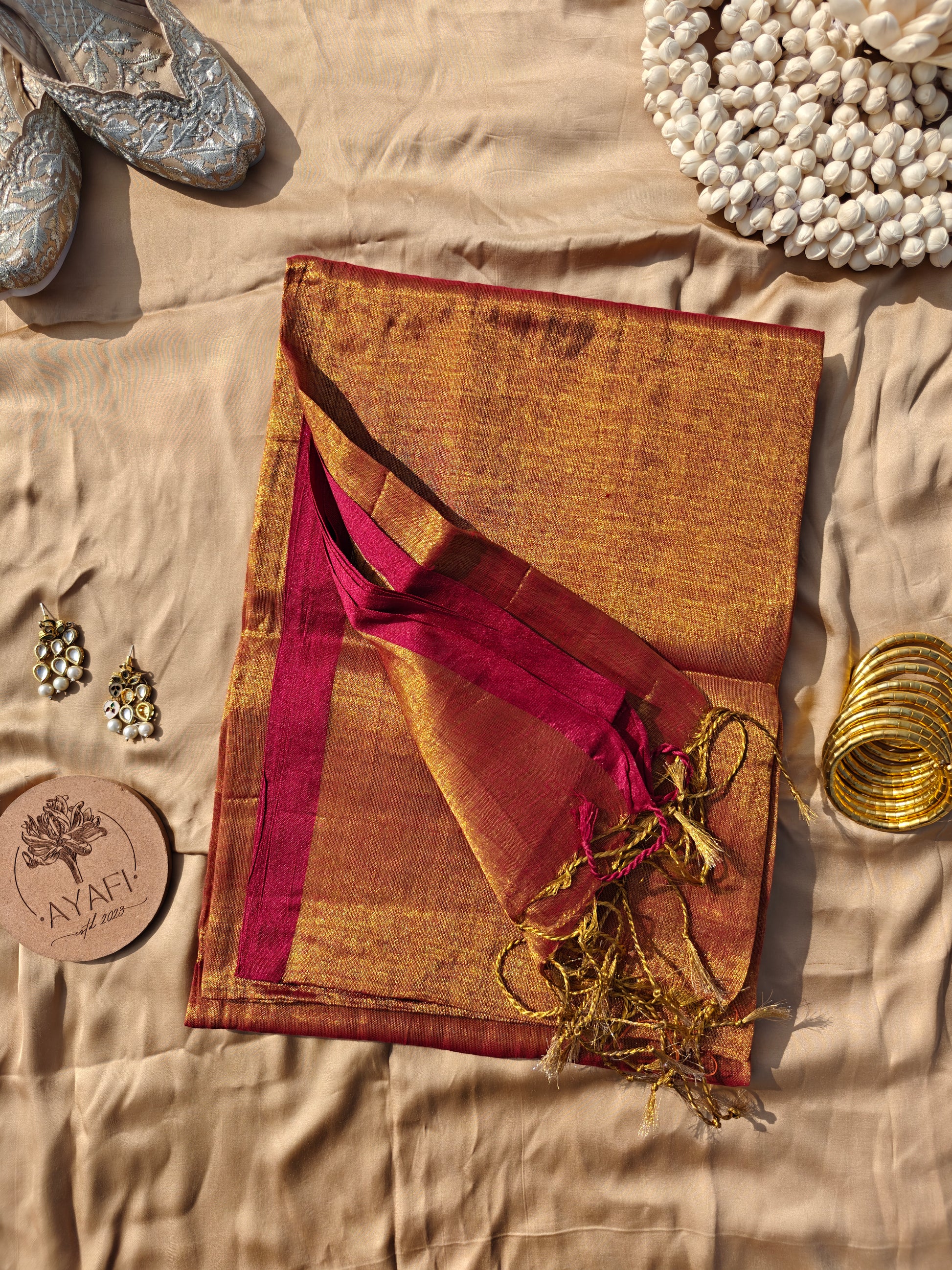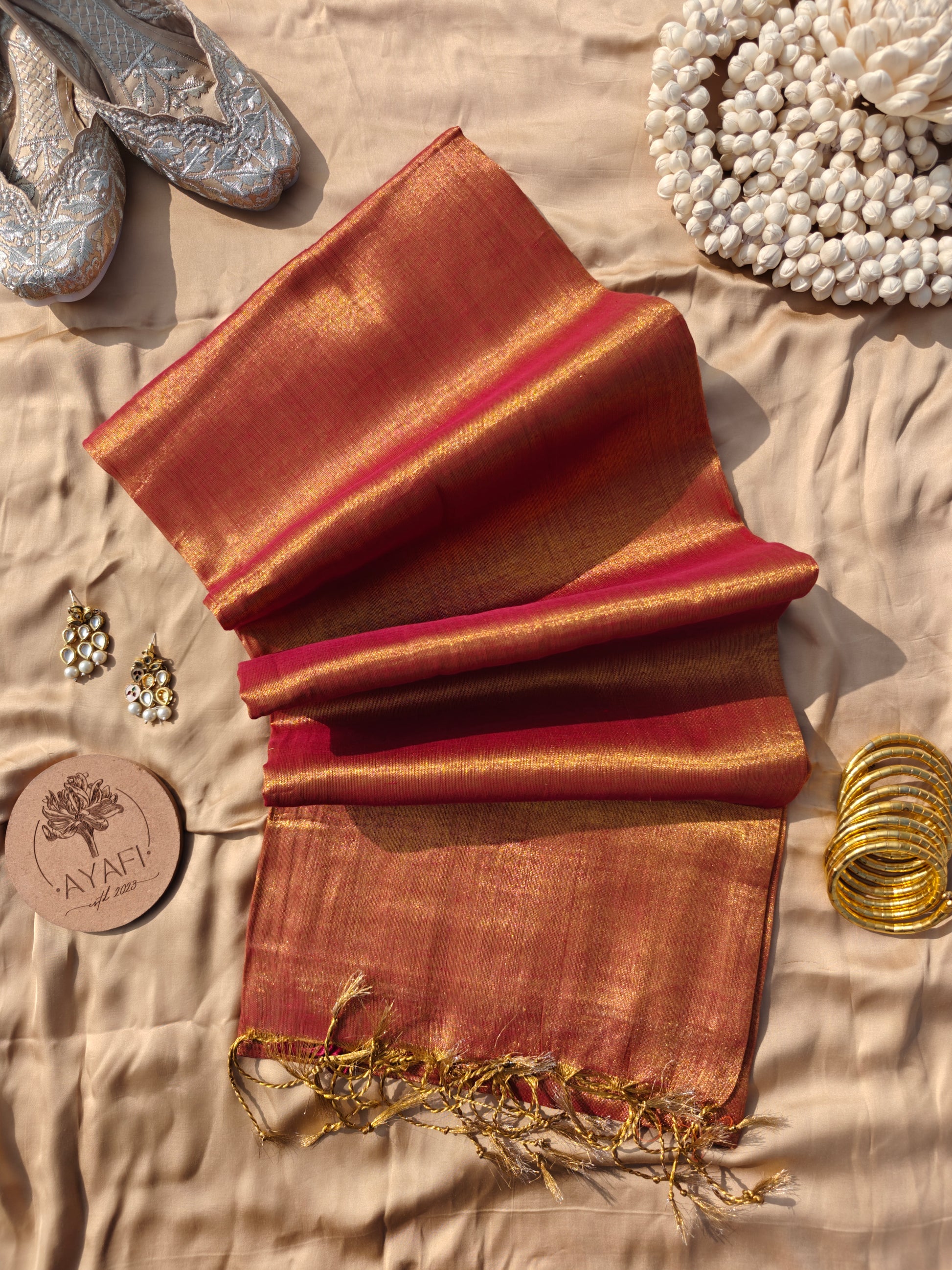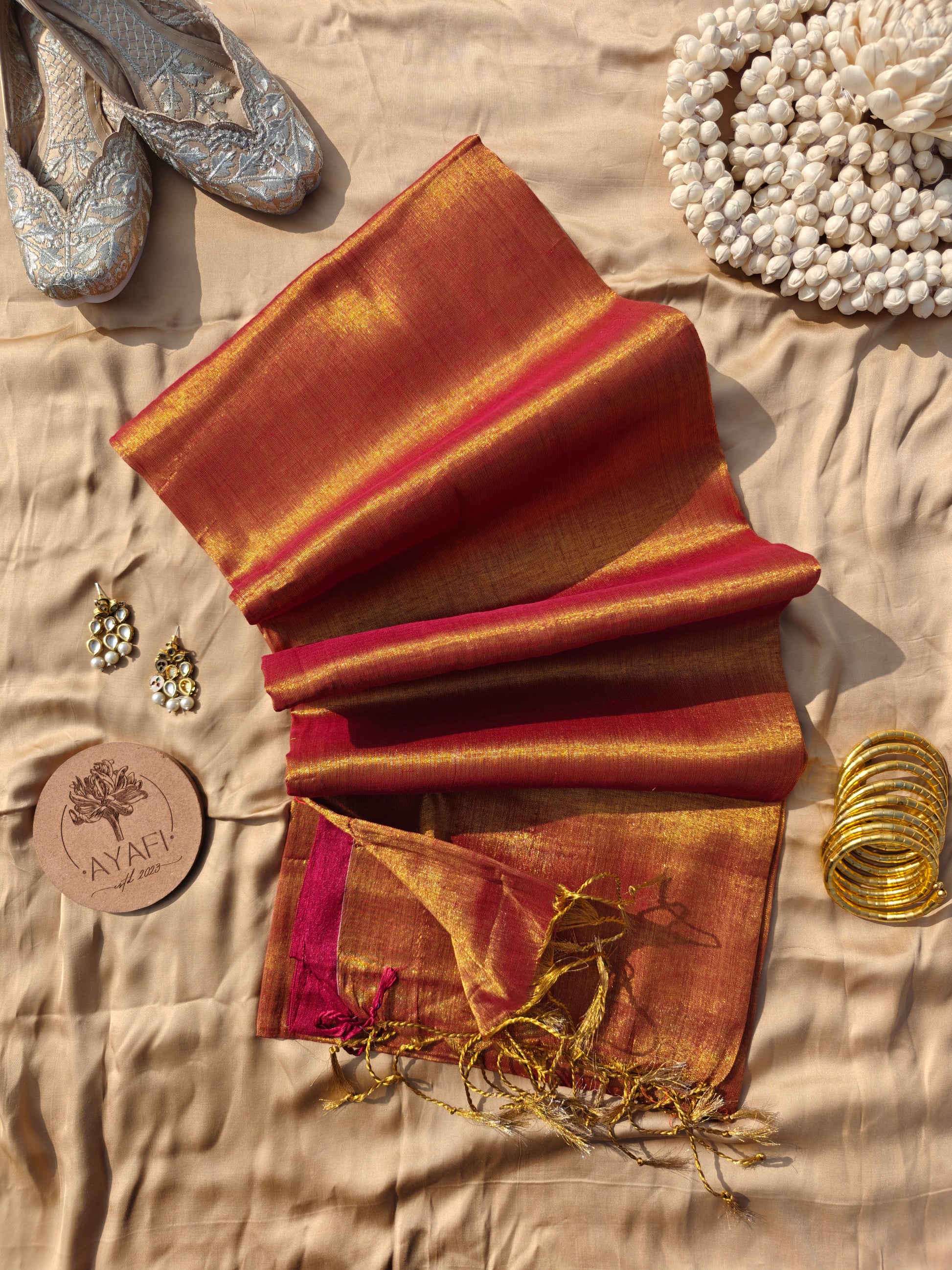 A stunning mul saree with opulent zari interspersed in the weave that brings about a captivating glossy sheen.