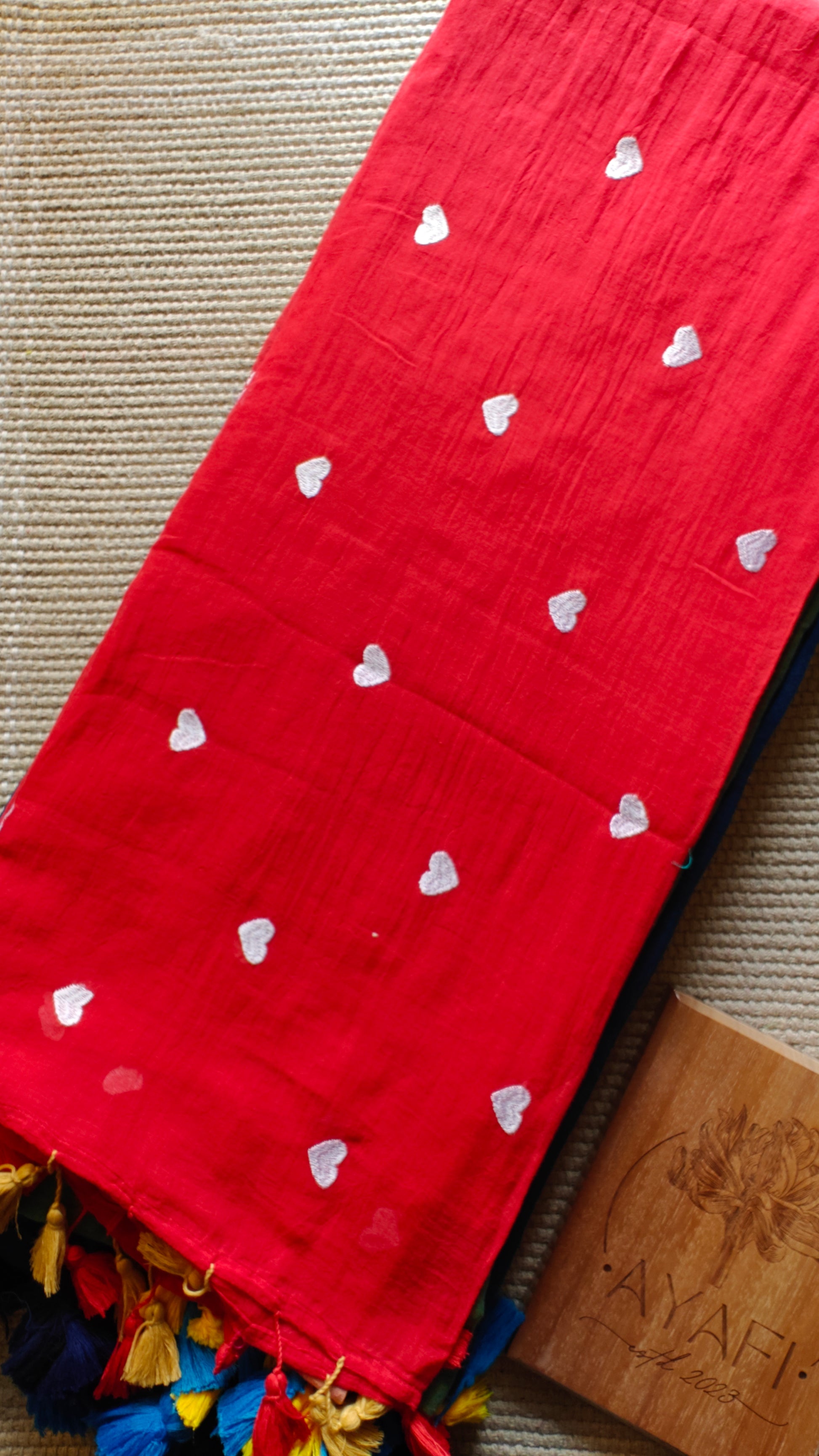 Introducing our exquisite ‘LOVE’ Embroidered Mul Cotton Saree. What sets this saree apart is its intricate embroidery, meticulously woven by the loom to adorn the fabric with beautiful Heart motifs.