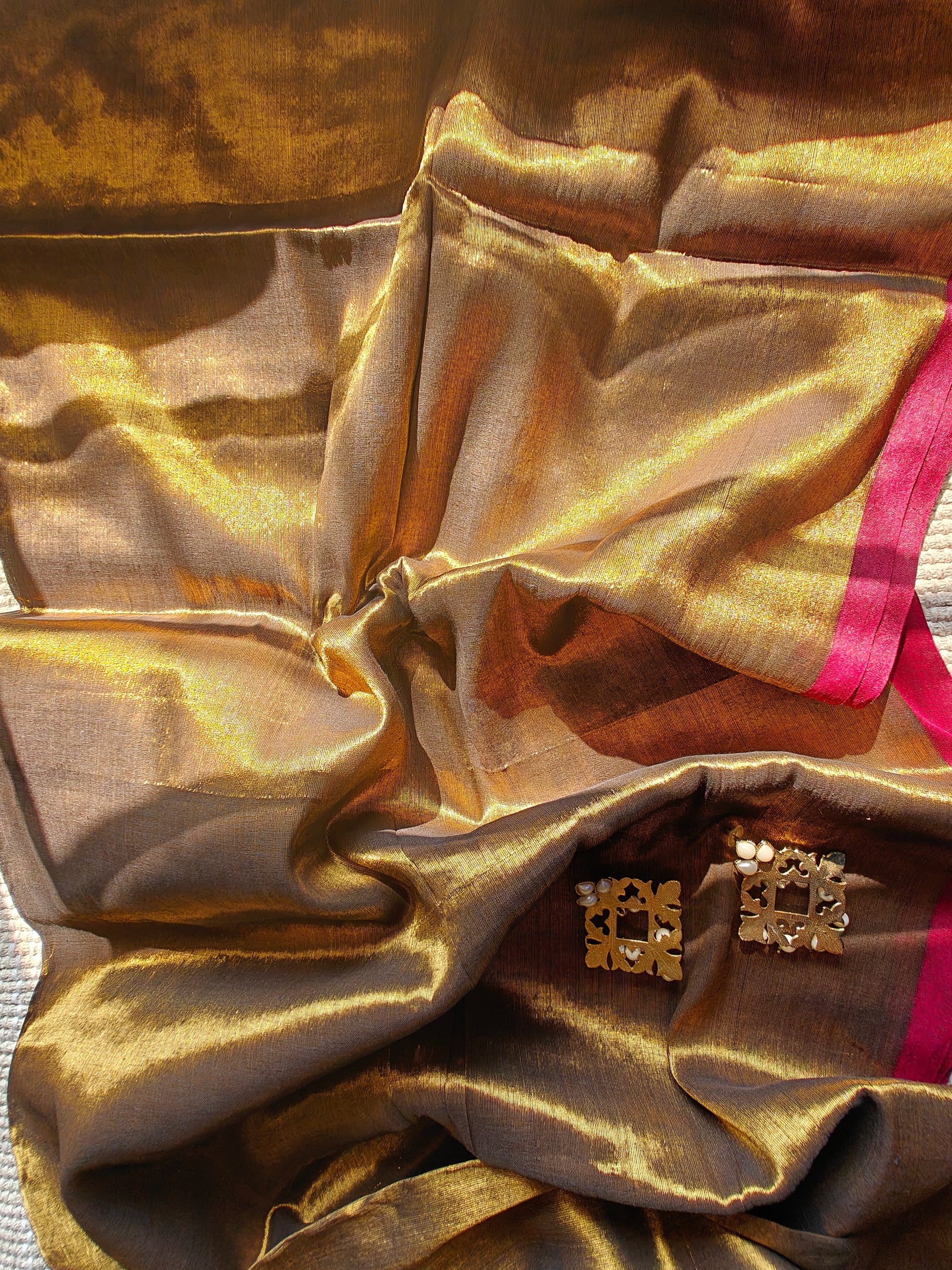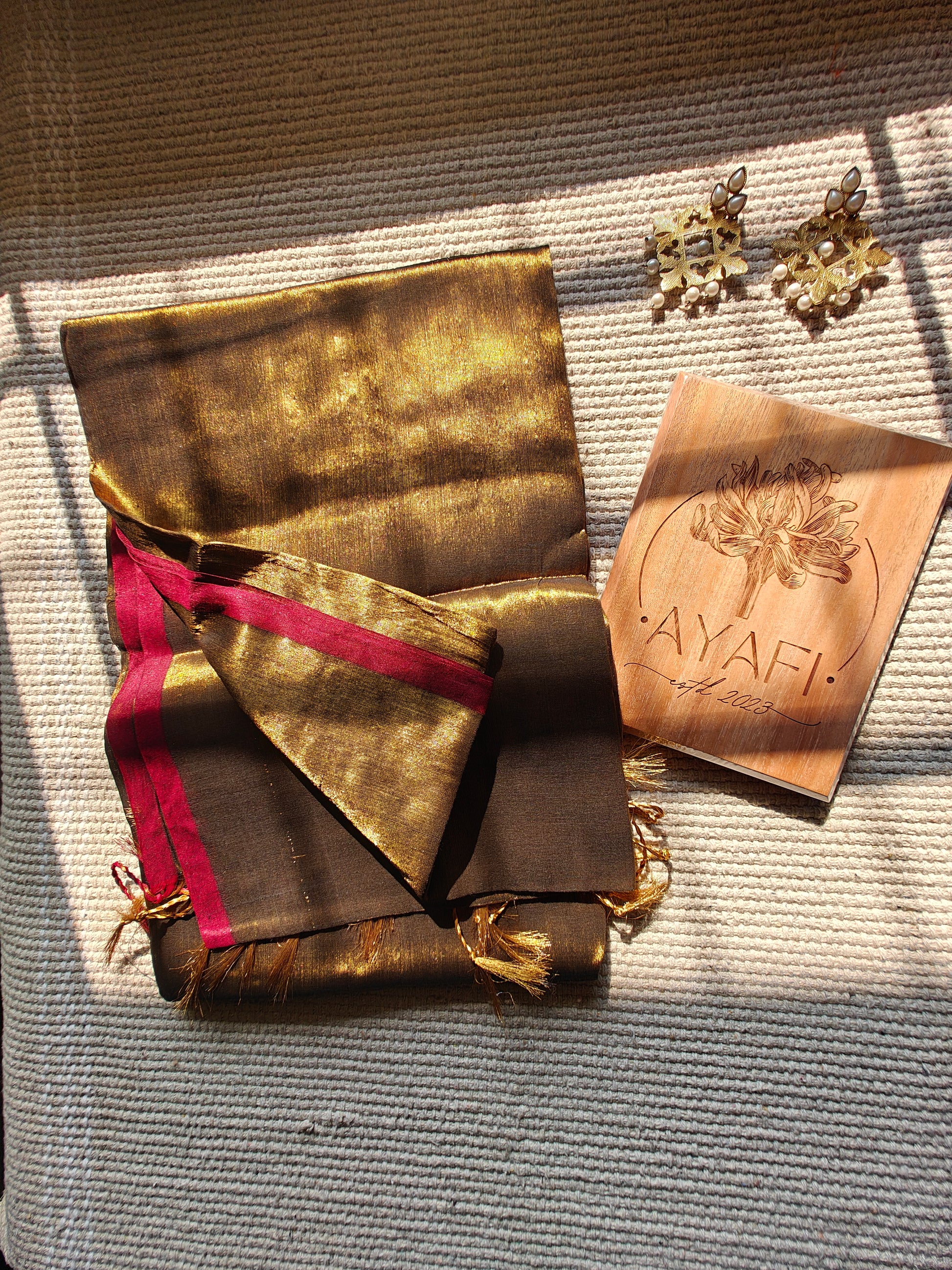 A stunning mul saree with opulent zari interspersed in the weave that brings about a captivating glossy sheen.