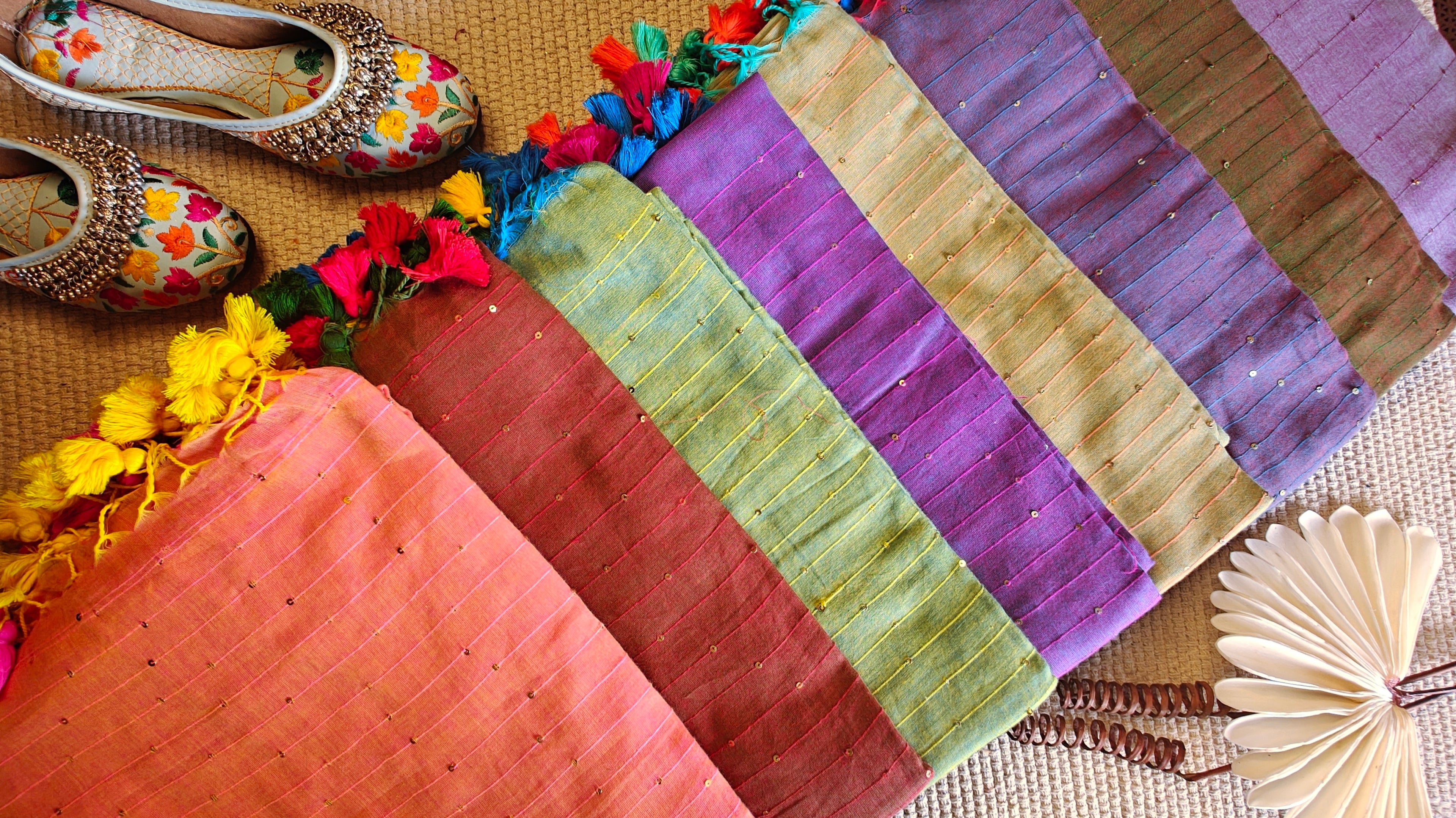 Gossamer muls adorned with gleaming sequins in pastel and deep shades